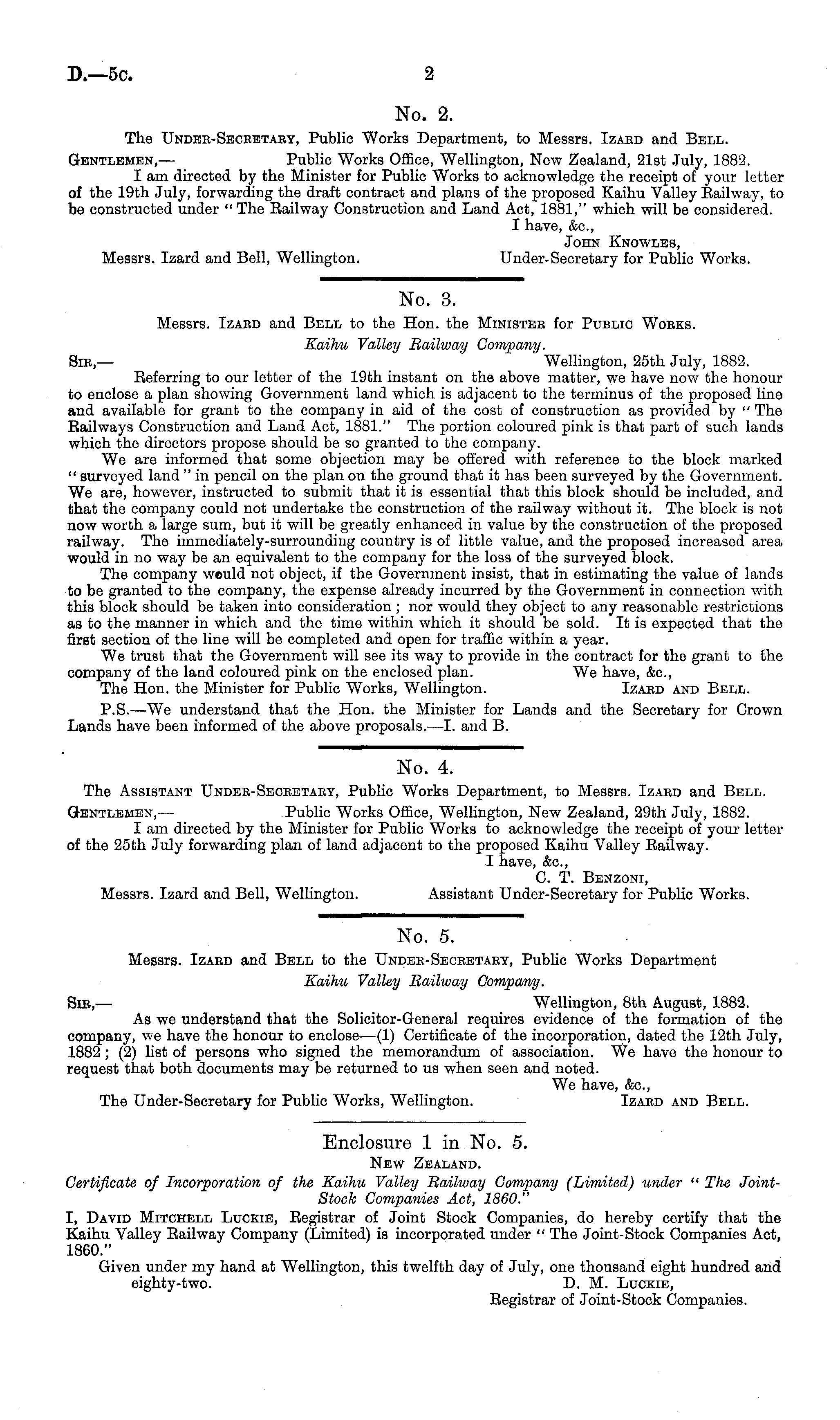 No. 5. Messrs. Izaed and Bell to the Under-Secretaey, Public Works Department Kaihu Valley Railway Company. Sib,— Wellington, Bth August, 1882. As we understand that the Solicitor-General requires evidence of the formation of the company, we have the honour to enclose—(l) Certificate of the incorporation, dated the 12th July, 1882 ; (2) list of persons who signed the memorandum of association. We have the honour to request that both documents may be returned to us when seen and noted. We have, &c, The Under-Secretary for Public Works, Wellington. Izaed and Bell.