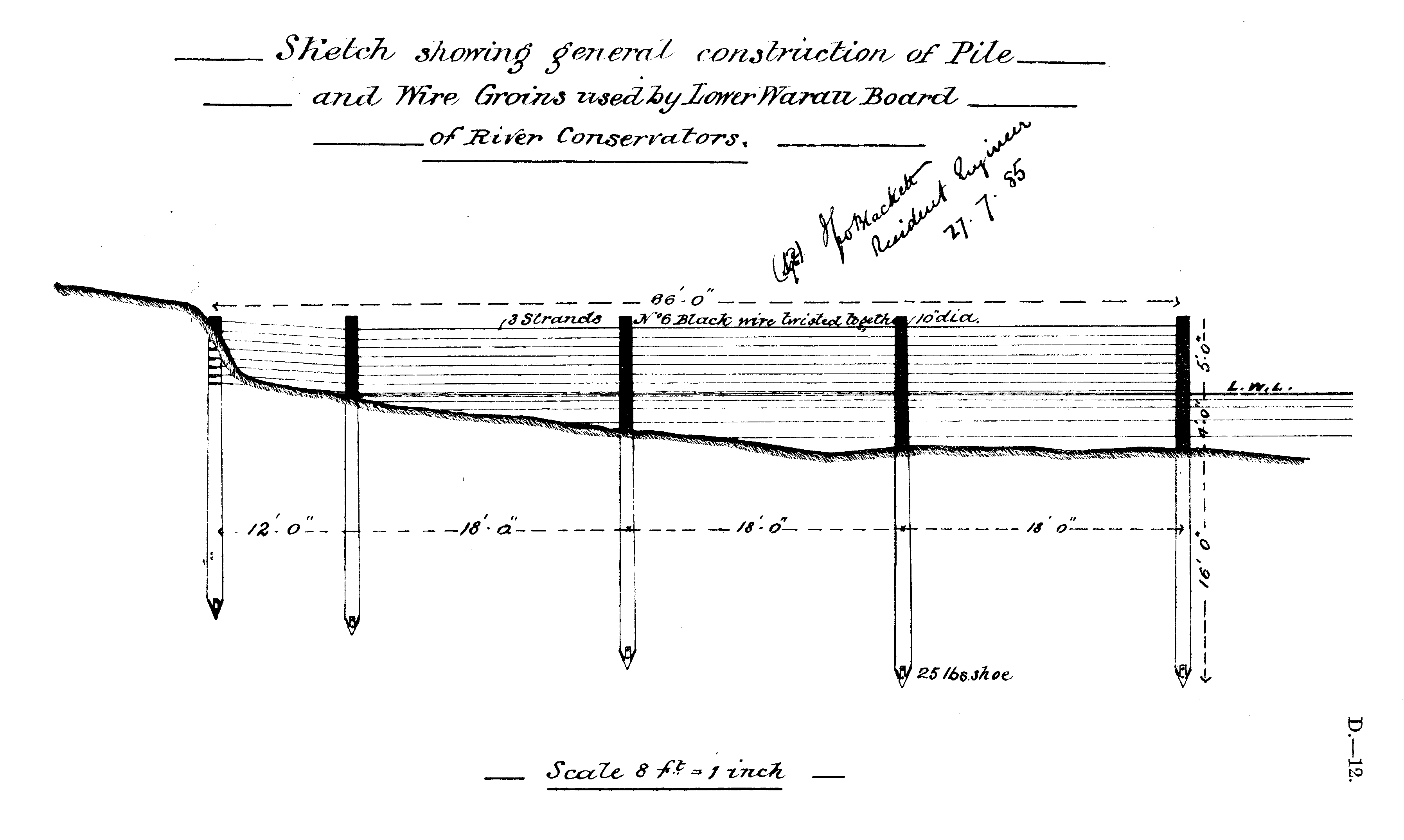 Sketch showing general construction of Pile and Wire Groins used by Lower Warau Board of River Conservators.