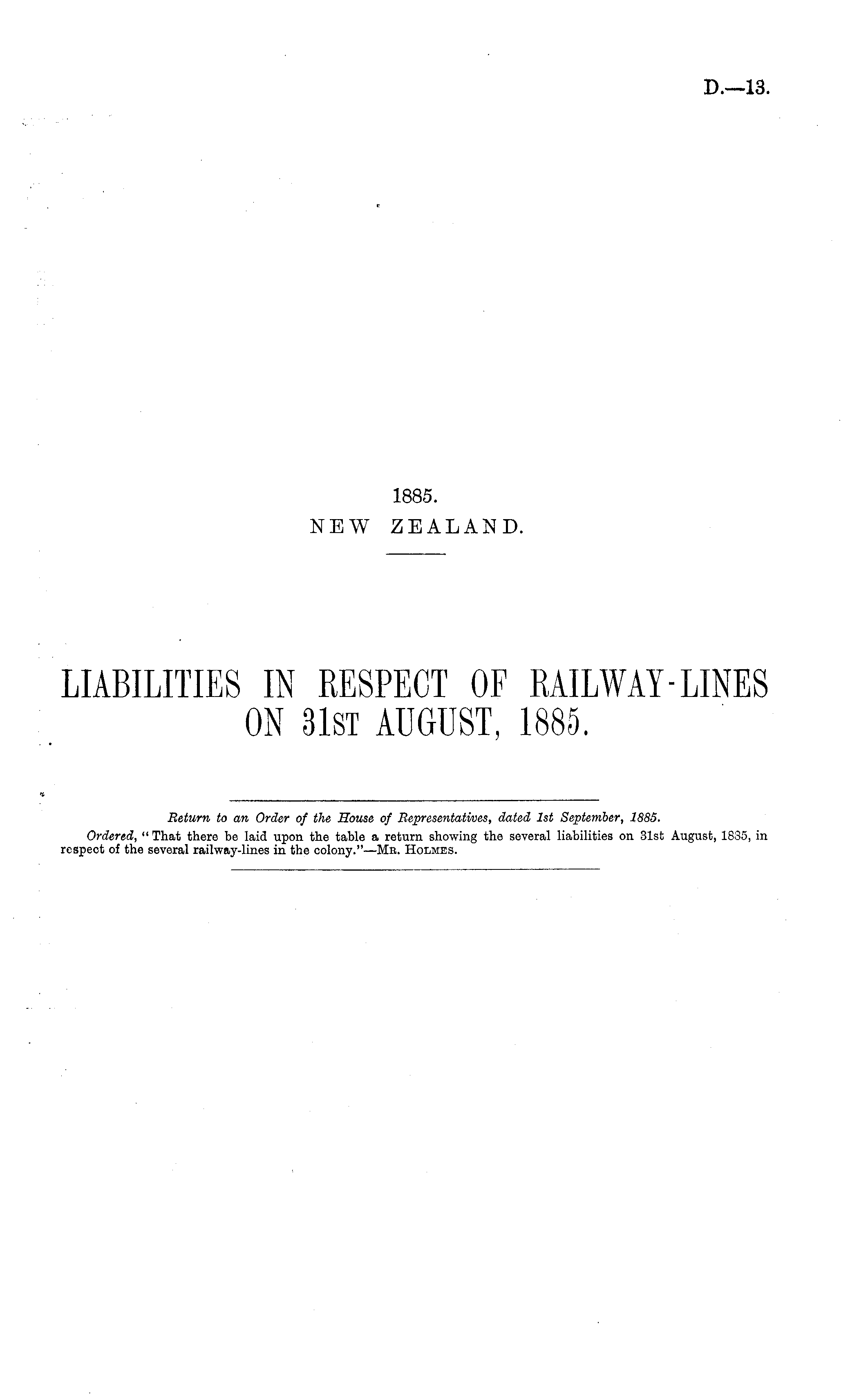 Return to an Order of the Souse of Representatives, dated Ist September, 1885. Ordered, " That there be laid upon the table a return showing the several liabilities on 31st August, 1835, in respect of the several railway-lines in the colony."—Me. Holmes.