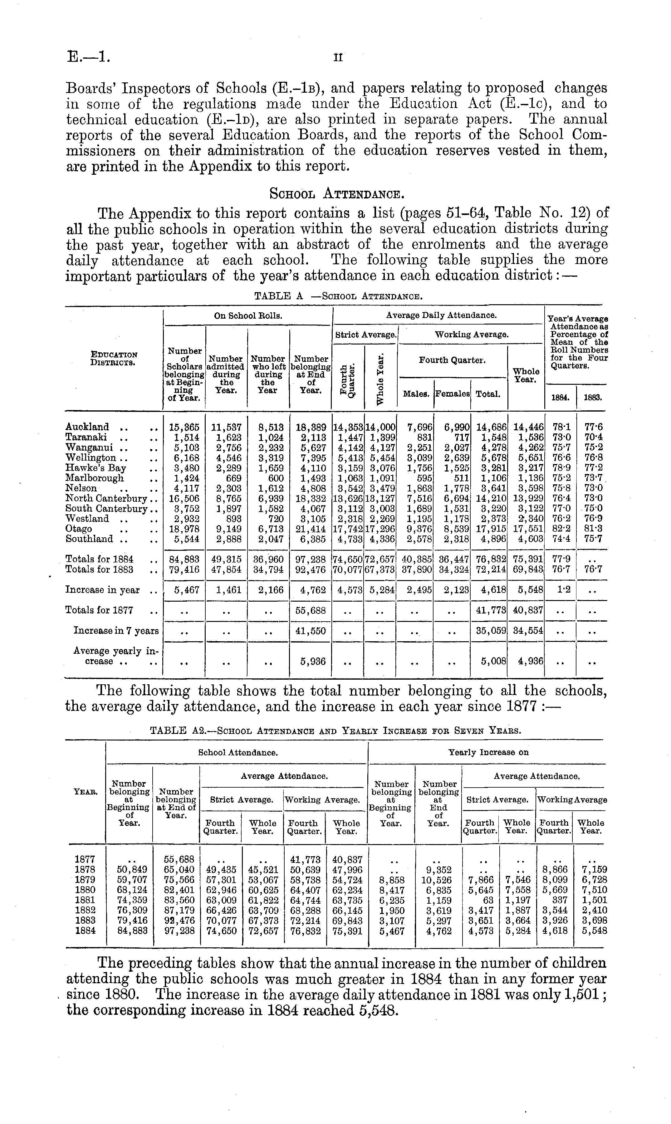 On School Eolls. Average Daily Attendance. Year's Average Attendance as Percentage of Mean of the Roll Numbers for the Four Quarters. Strict Average. Working Average. Education Districts. Number of Scholars belonging at Beginning of Year. Number admitted during the Year. Number who left during the Year Number belonging at End of Year. S3 ti If si Q CD Fourth Quarter. Whole Year. Males. Females Total. 1884. 1883. Auckland .. Paranaki iVanganui .. .. Wellington .. Hawke's Bay tfarlborough kelson Sforth Canterbury .. 3outh Canterbury.. iVestland .. Jtago Southland .. 15,365 1,514 5,103 6,168 3,480 1,424 4,117 16,506 3,752 2,932 18,978 5,544 11,537 1,623 2,756 4,546 2,289 669 2,303 8,765 1,897 893 9,149 2,888 8,513 1,024 2,232 3,319 1,659 600 1,612 6,939 1,582 720 6,713 2,047 18,389 2,113 5,627 7,395 4,110 1,493 4,808 18,332 4,067 3,105 21,414 6,385 14,353 1,447 4,142 5,413 3,159 1,063 3,542 13,626 3,112 2,318 17,742 4,733 14,000 1,399 4,127 5,454 3,076 1,091 3,479 13,127 3,003 2,209 17,296 4,336 7,696 831 2,251 3,039 1,756 595 1,863 7,516 1,689 1,195 9,376 2,578 6,990 717 2,027 2,639 1,525 511 1,778 6,094 1,531 1,178 8,539 2,318 14,686 1,548 4,278 5,678 3,281 1,106 3,641 14,210 3,220 2,373 17,915 4,896 14,446 1,536 4,262 5,651 3,217 1,136 3,598 13,929 3,122 2,340 17,551 4,603 78-1 73-0 75-7 76'6 78-9 75-2 75-8 76-4 77-0 76-2 82-2 74-4 77'6 70-4 75-2 76-8 77-2 73-7 73-0 73-0 75'0 70-9 81-3 75-7 Fotals for 1884 rotals for 1883 84,883 79,416 49,315 47,854 36,960 34,794 97,238 92,470 74,650 70,077 72,657 67,373 40,385 37,890 36,447 34,324 76,832 72,214 75,391 69,843 77-9 76'7 76-7 'norcaso in year .. 5,467 1,461 2,166 4,762 4,573 5,284 2,495 2,123 4,61i 5,548 1-2 totals for 1877 55,688 41,773 40,837 Increase in 7 years 41,550 35,059 34,554 Average yearly increase 5,936 5,008 4,936