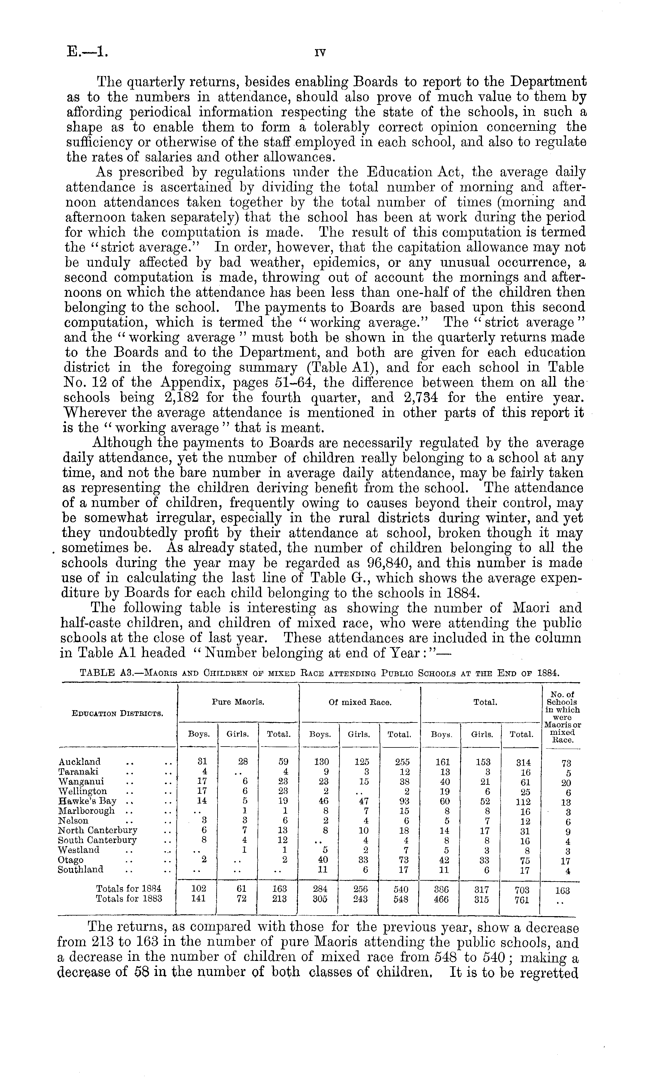 The quarterly returns, besides enabling Boards to report to the Department as to the numbers in attendance, should also prove of much value to them by affording periodical information respecting the state of the schools, in such a shape as to enable them to form a tolerably correct opinion concerning the sufficiency or otherwise of the staff employed in each school, and also to regulate the rates of salaries and other allowances. As prescribed by regulations under the Education Act, the average daily attendance is ascertained by dividing the total number of morning and afternoon attendances taken together by the total number of times (morning and afternoon taken separately) that the school has been at work during the period for which the computation is made. The result of this computation is termed the "strict average." In order, however, that the capitation allowance may not be unduly affected by bad weather, epidemics, or any unusual occurrence, a second computation is made, throwing out of account the mornings and afternoons on which the attendance has been less than one-half of the children then belonging to the school. The payments to Boards are based upon this second computation, which is termed the "working average." The "strict average" and the "working average " must both be shown in the quarterly returns made to the Boards and to the Department, and both are given for each education district in the foregoing summary (Table Al), and for each school in Table No. 12 of the Appendix, pages 51-64, the difference between them on all the schools being 2,182 for the fourth quarter, and 2,734 for the entire year. Wherever the average attendance is mentioned in other parts of this report it is the " working average " that is meant. Although the payments to Boards are necessarily regulated by the average daily attendance, yet the number of children really belonging to a school at any time, and not the bare number in average daily attendance, may be fairly taken as representing the children deriving benefit from the school. The attendance of a number of children, frequently owing to causes beyond their control, may be somewhat irregular, especially in the rural districts during winter, and yet they undoubtedly profit by their attendance at school, broken though it may sometimes be. As already stated, the number of children belonging to all the schools during the year may be regarded as 96,840, and this number is made use of in calculating the last line of Table G., which shows the average expenditure by Boards for each child belonging to the schools in 1884. The following table is interesting as showing the number of Maori and half-caste children, and children of mixed race, who were attending the public schools at the close of last year. These attendances are included in the column in Table Al headed " Number belonging at end of Year :"—