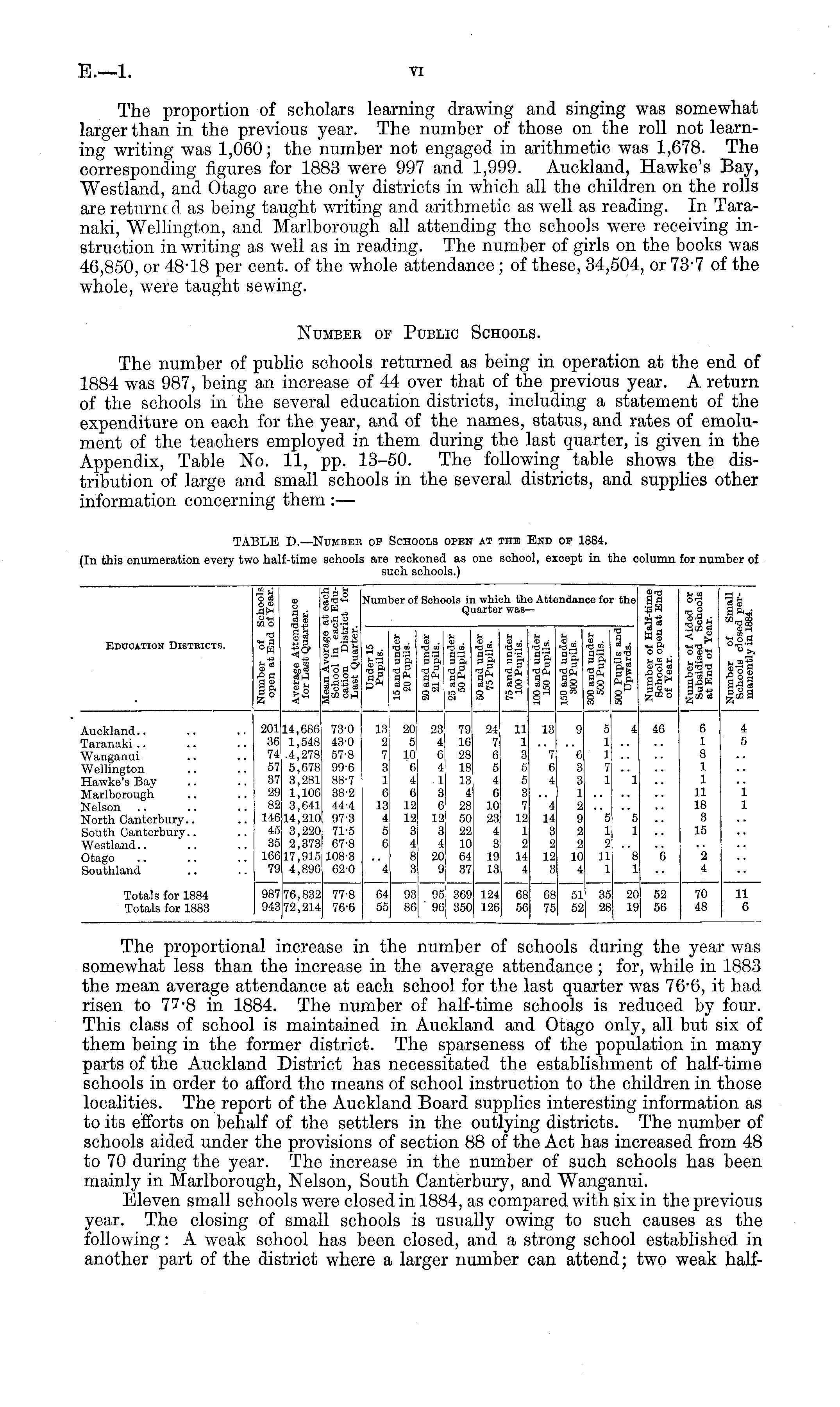 The proportion of scholars learning drawing and singing was somewhat larger than in the previous year. The number of those on the roll not learning writing was 1,060; the number not engaged in arithmetic was 1,678. The corresponding figures for 1883 were 997 and 1,999. Auckland, Hawke's Bay, Westland, and Otago are the only districts in which all the children on the rolls are returned as being taught writing and arithmetic as well as reading. In Taranaki, Wellington, and Marlborough all attending the schools were receiving instruction in writing as well as in reading. The number of girls on the books was 46,850, or 48-18 per cent, of the whole attendance ; of these, 34,504, or 73*7 of the whole, were taught sewing. Number of Public Schools. The number of public schools returned as being in operation at the end of 1884 was 987, being an increase of 44 over that of the previous year. A return of the schools in the several education districts, including a statement of the expenditure on each for the year, and of the names, status, and rates of emolument of the teachers employed in them during the last quarter, is given in the Appendix, Table No. 11, pp. 13-50. The following table shows the distribution of large and small schools in the several districts, and supplies other information concerning them : —