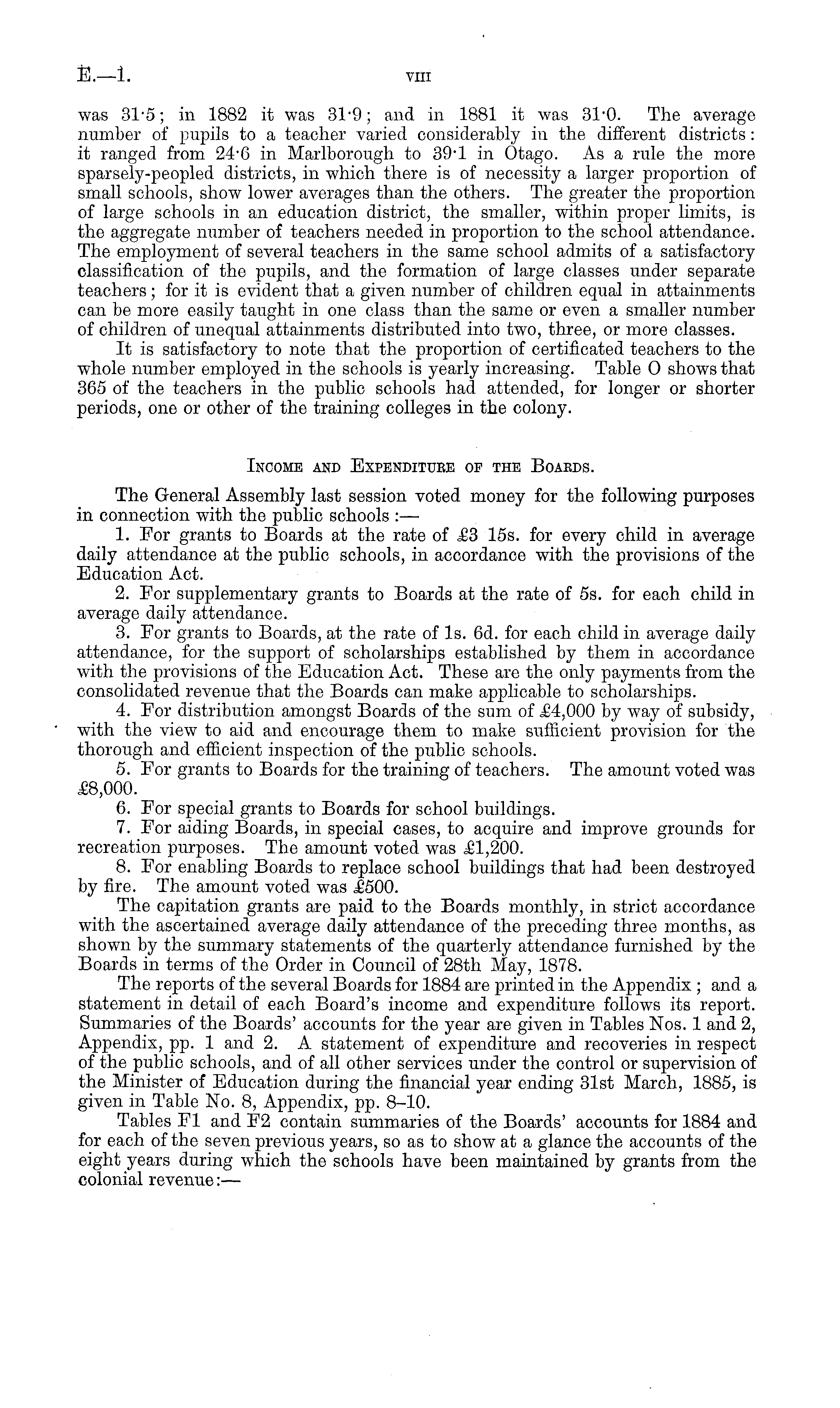 was 31-5; in 1882 it was 31*9; and in 1881 it was 31-0. The average number of pupils to a teacher varied considerably in the different districts: it ranged from 24'G in Marlborough to 89-l in Otago. As a rule the more sparsely-peopled districts, in which there is of necessity a larger proportion of small schools, show lower averages than the others. The greater the proportion of large schools in an education district, the smaller, within proper limits, is the aggregate number of teachers needed in proportion to the school attendance. The employment of several teachers in the same school admits of a satisfactory classification of the pupils, and the formation of large classes under separate teachers ; for it is evident that a given number of children equal in attainments can be more easily taught in one class than the same or even a smaller number of children of unequal attainments distributed into two, three, or more classes. It is satisfactory to note that the proportion of certificated teachers to the whole number employed in the schools is yearly increasing. Table 0 shows that 365 of the teachers in the public schools had attended, for longer or shorter periods, one or other of the training colleges in the colony. Income and Expenditure op the Boaeds. The General Assembly last session voted money for the following purposes in connection with the public schools :— 1. For grants to Boards at the rate of £3 15s. for every child in average daily attendance at the public schools, in accordance with the provisions of the Education Act. 2. For supplementary grants to Boards at the rate of ss. for each child in average daily attendance. 3. For grants to Boards, at the rate of Is. 6d. for each child in average daily attendance, for the support of scholarships established by them in accordance with the provisions of the Education Act. These are the only payments from the consolidated revenue that the Boards can make applicable to scholarships. 4. For distribution amongst Boards of the sum of £4,000 by way of subsidy, with the view to aid and encourage them to make sufficient provision for the thorough and efficient inspection of the public schools. 5. For grants to Boards for the training of teachers. The amount voted was .£B,OOO. 6. For special grants to Boards for school buildings. 7. For aiding Boards, in special cases, to acquire and improve grounds for recreation purposes. The amount voted was £1,200. 8. For enabling Boards to replace school buildings that had been destroyed by fire. The amount voted was £500. The capitation grants are paid to the Boards monthly, in strict accordance with the ascertained average daily attendance of the preceding three months, as shown by the summary statements of the quarterly attendance furnished by the Boards in terms of the Order in Council of 28th May, 1878. The reports of the several Boards for 1884 are printed in the Appendix ; and a statement in detail of each Board's income and expenditure follows its report. Summaries of the Boards' accounts for the year are given in Tables Nos. 1 and 2, Appendix, pp. 1 and 2. A statement of expenditure and recoveries in respect of the public schools, and of all other services under the control or supervision of the Minister of Education during the financial year ending 31st March, 1885, is given in Table No. 8, Appendix, pp. 8-10. Tables Fl and F2 contain summaries of the Boards' accounts for 1884 and for each of the seven previous years, so as to show at a glance the accounts of the eight years during which the schools have been maintained by grants from the colonial revenue:—