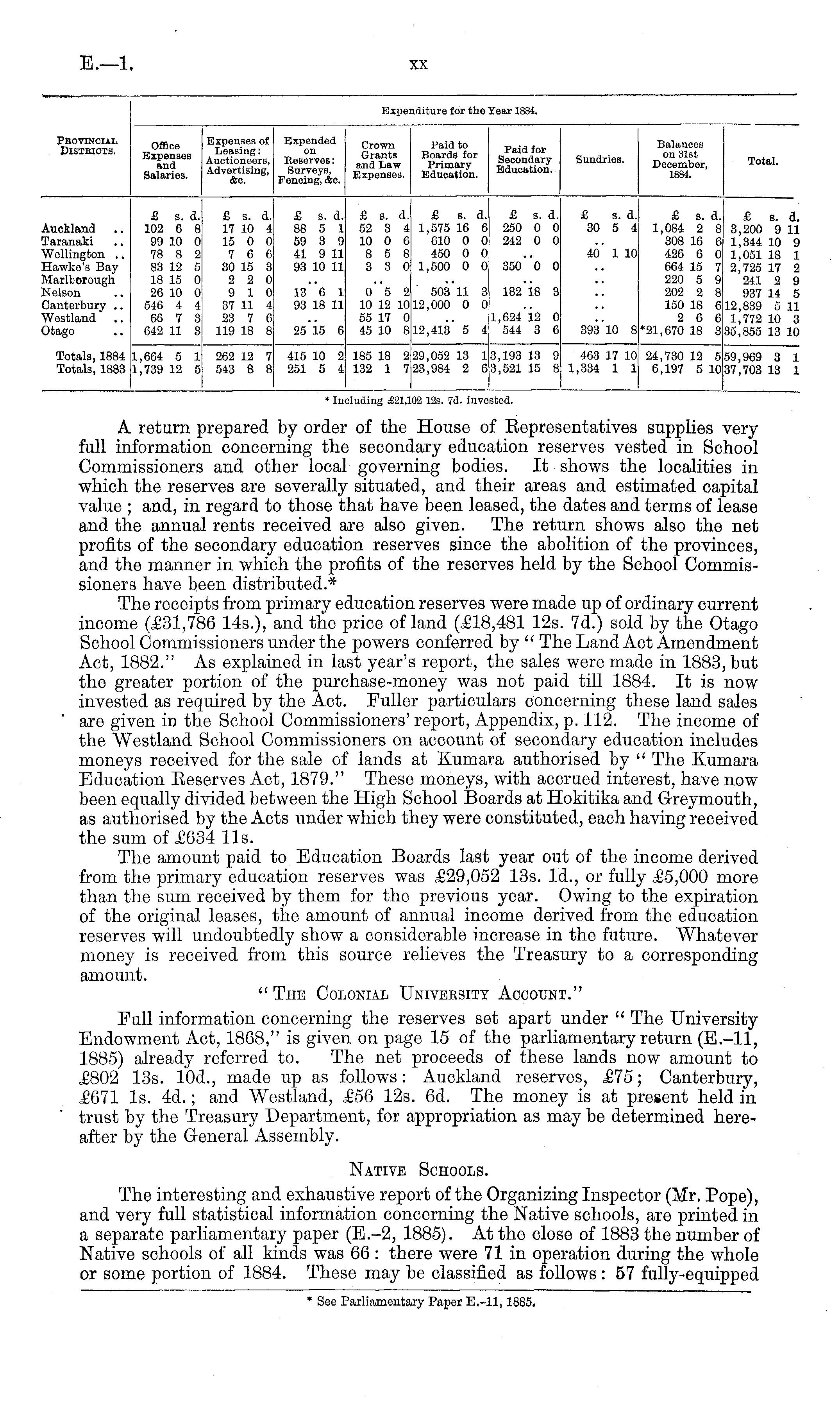 Pbovincial Districts. Office Expenses and Salaries. Expenses of Leasing: Auctioneers, Advertising, &a. Expended on Reserves: Surveys, Fencing, &c. Crown Grants and Law Exponses. Paid to Boards for Primary Education. Paid for Secondary Education. Sundries. Balances on 31st December, 1884. Total. Auckland Taranaki Wellington .. Hawke's Bay Maryborough Nelson Canterbury .. Westland Otago £ s. d. 102 6 8 99 10 0 78 8 2 83 12 5 18 15 0 2G 10 0 546 4 4 66 7 3 642 11 8 £ s. d. 17 10 4 15 0 0 7 6 6 30 15 3 2 2 0 9 10 37 11 4 23 7 6 119 18 8 £ s. d. 88 5 1 59 3 9 41 9 11 93 10 11 £ s. d. 52 3 4 10 0 6 8 5 8 3 3 0 £ s. d. 1,575 16 6 610 0 0 450 0 0 1,500 0 0 £ s. d. 250 0 0 242 0 0 £ s. d. 30 5 4 46' 1 10 £ s. d. 1,084 2 8 308 16 6 426 6 0 664 15 7 220 5 9 202 2 8 150 18 6 2 6 6 •21,670 18 3 £ s. a. 3,200 9 11 1,344 10 9 1,051 18 1 2,725 17 2 24.1 2 9 937 14 5 12,839 5 11 1,772 10 3 35,855 13 10 350"0 0 13 G 1 93 18 11 0 5 2 10 12 10 55 17 0 45 10 8 503*11 3 12,000 0 0 182'18 3 25 i5 6 12,413' 5 4 1,624 12 0 544 3 6 393'lO 8 Totals, 1884 Totals, 1883 1,664 5 1 1,739 12 5 2G2 12 7 543 8 8 415 10 2 251 5 4 185 18 2 132 1 7 29,052 13 1 23,984 2 6 3,193 13 9 3,521 15 8 463 17 10 1,334 1 1 24,730 12 5 6,197 5 10 59,969 3 1 37,703 13 1