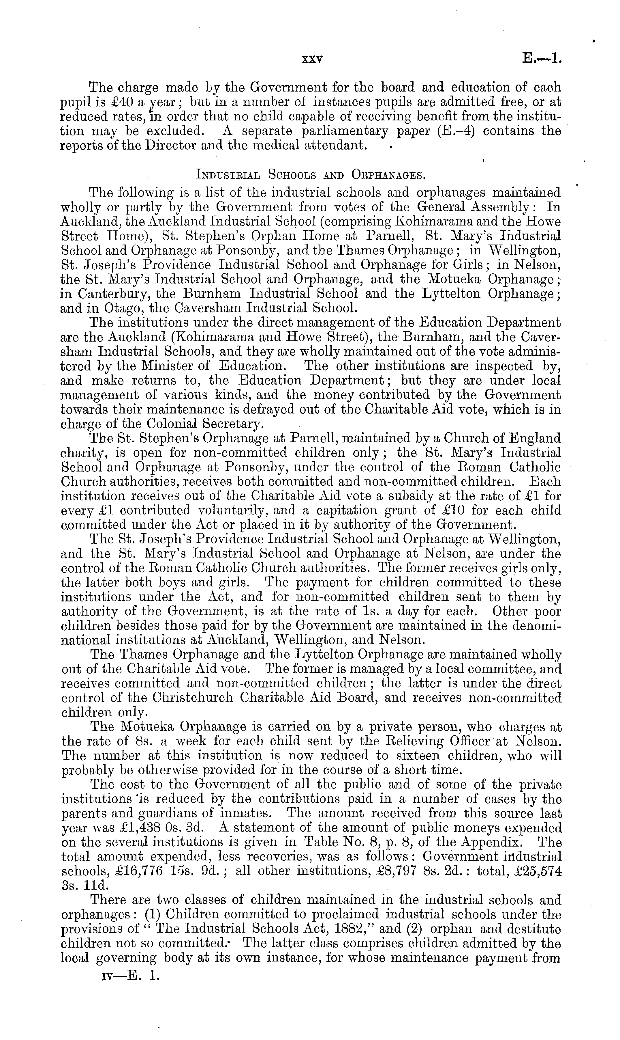 The charge made by the Government for the board and education of each pupil is £40 a year; but in a number of instances pupils are admitted free, or at reduced rates, in order that no child capable of receiving benefit from the institution may be excluded. A separate parliamentary paper (E.-4) contains the reports of the Director and the medical attendant. Indtjstbial Schools and Orphanages. The following is a list of the industrial schools and orphanages maintained wholly or partly by the Government from votes of the General Assembly: In Auckland, the Auckland Industrial School (comprising Kohimarama and the Howe Street Home), St. Stephen's Orphan Home at Parnell, St. Mary's Industrial School and Orphanage at Ponsonby, and the Thames Orphanage ; in Wellington, St. Joseph's Providence Industrial School and Orphanage for Girls; in Nelson, the St. Mary's Industrial School and Orphanage, and the Motueka Orphanage; in Canterbury, the Burnham Industrial School and the Lyttelton Orphanage; and in Otago, the Caversham Industrial School. The institutions under the direct management of the Education Department are the Auckland (Kohimarama and Howe Street), the Burnham, and the Caversham Industrial Schools, and they are wholly maintained out of the vote administered by the Minister of Education. The other institutions are inspected by, and make returns to, the Education Department; but they are under local management of various kinds, and the money contributed by the Government towards their maintenance is defrayed out of the Charitable Aid vote, which is in charge of the Colonial Secretary. The St. Stephen's Orphanage at Parnell, maintained by a Church of England charity, is open for non-committed children only; the St. Mary's Industrial School and Orphanage at Ponsonby, under the control of the Eoman Catholic Church authorities, receives both committed and non-committed children. Each institution receives out of the Charitable Aid vote a subsidy at the rate of £1 for every =£1 contributed voluntarily, and a capitation grant of ,£lO for each child committed under the Act or placed in it by authority of the Government. The St. Joseph's Providence Industrial School and Orphanage at Wellington, and the St. Mary's Industrial School and Orphanage at Nelson, are under the control of the Eoman Catholic Church authorities. The former receives girls only, the latter both boys and girls. The payment for children committed to these institutions under the Act, and for non-committed children sent to them by authority of the Government, is at the rate of Is. a day for each. Other poor children besides those paid for by the Government are maintained in the denominational institutions at Auckland, Wellington, and Nelson. The Thames Orphanage and the Lyttelton Orphanage are maintained wholly out of the Charitable Aid vote. The former is managed by a local committee, and receives committed and non-committed children; the latter is under the direct control of the Christchurch Charitable Aid Board, and receives non-committed children only. The Motueka Orphanage is carried on by a private person, who charges at the rate of Bs. a week for each child sent by the Believing Officer at Nelson. The number at this institution is now reduced to sixteen children, who will probably be otherwise provided for in the course of a short time. The cost to the Government of all the public and of some of the private institutions "is reduced by the contributions paid in a number of cases by the parents and guardians of inmates. The amount received from this source last year was £1,438 os. 3d. A statement of the amount of public moneys expended on the several institutions is given in Table No. 8, p. 8, of the Appendix. The total amount expended, less recoveries, was as follows: Government industrial schools, £16,776 15s. 9d. ; all other institutions, £8,797 Bs. 2d.: total, £25,574 3s. lid. There are two classes of children maintained in the industrial schools and orphanages : (1) Children committed to proclaimed industrial schools under the provisions of " The Industrial Schools Act, 1882," and (2) orphan and destitute children not so committed/ The latter class comprises children admitted by the local governing body at its own instance, for whose maintenance payment from iv—E. 1.