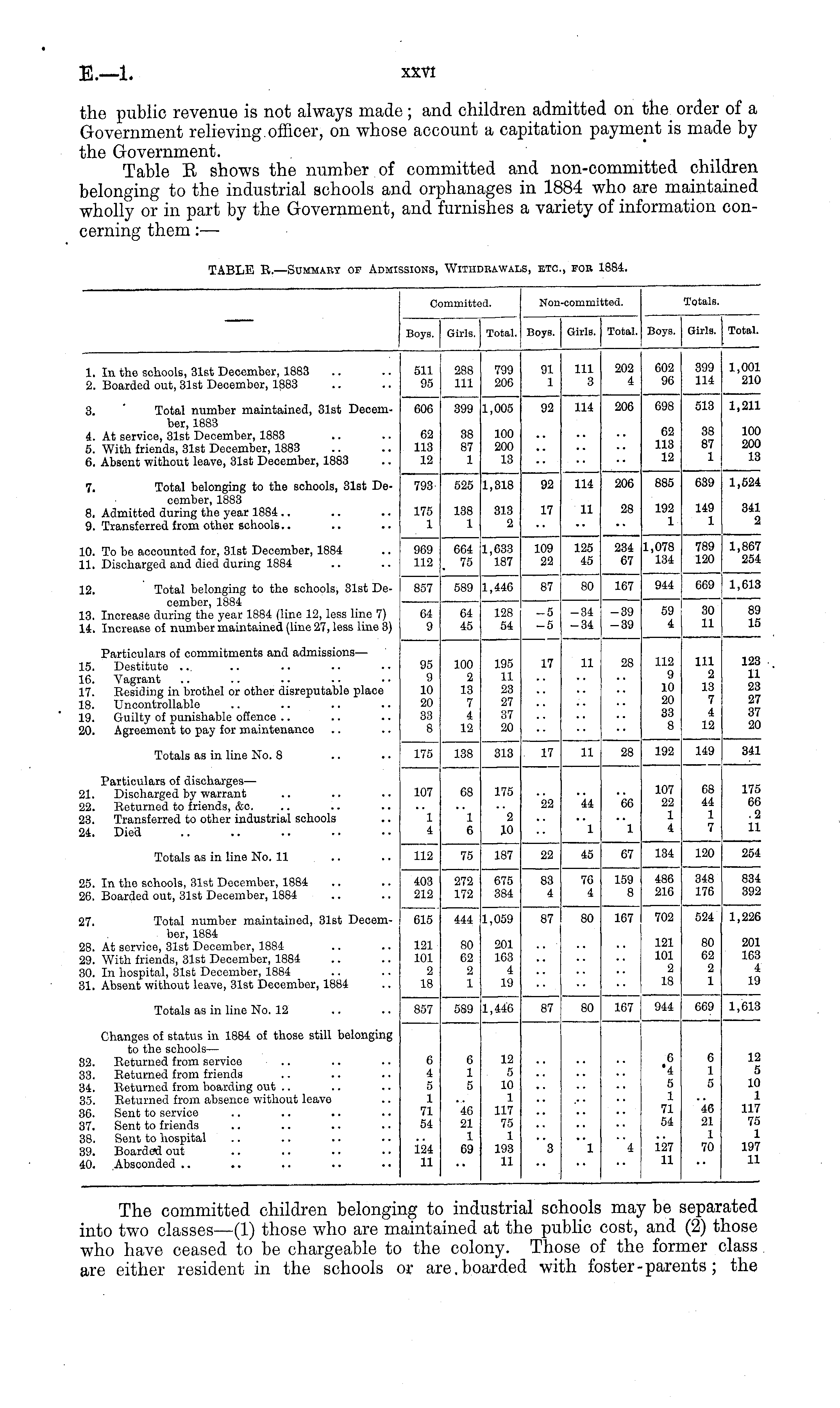 the public revenue is not always made ; and children admitted on the order of a Government relieving.officer, on whose account a capitation payment is made by the Government. Table E shows the number of committed and non-committed children belonging to the industrial schools and orphanages in 1884 who are maintained wholly or in part by the Government, and furnishes a variety of information concerning them: —