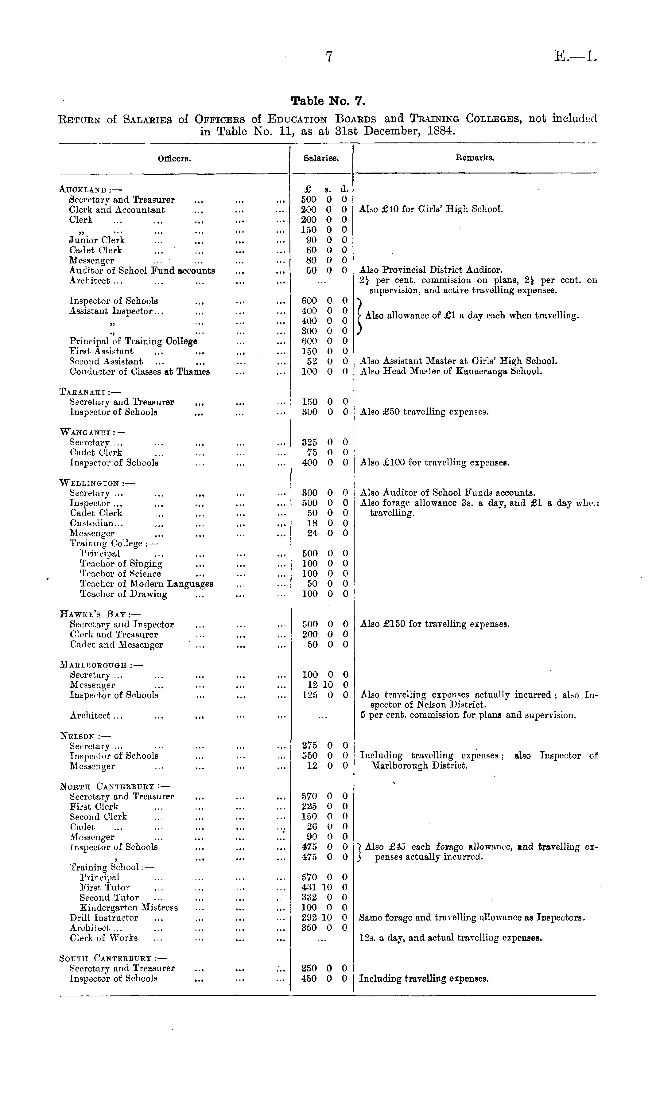 Table No. 7. Return of Salaries of Officers of Education Boards and Training Colleges, not included in Table No. 11, as at 31st December, 1884.