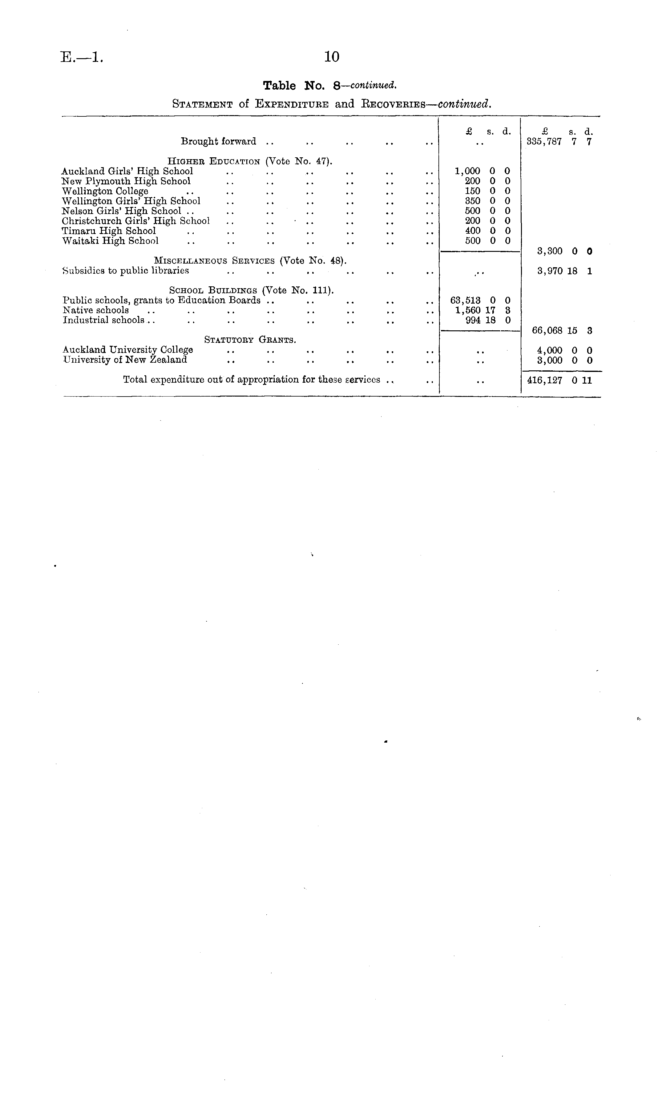 £ s. d. £ s. d. 335,787 7 7 Brought forward .. Higheb Education (Vote No. 47). Auckland Girls' High School New Plymouth High School Wellington College Wellington Girls' High School Nelson Girls' High School Ghristchurch Girls' High School .. .. • .. Timaru High School Waitaki High School 1,000 0 0 200 0 0 150 0 0 350 0 0 500 0 0 200 0 0 400 0 0 500 0 0 3,300 0 0 Miscellaneous Services (Vote No. iff). Subsidies to public libraries 3,970 18 1 School Buildings (Vote No. 111). Public schools, grants to Education Boards Native schools Industrial schools 63,513 0 0 1,560 17 3 994 18 0 66,068 15 3 Statutory Grants. Auckland University College University of New Zealand 4,000 0 0 3,000 0 0 Total expenditure out of appropriation for theoO services .. 416,127 0 11