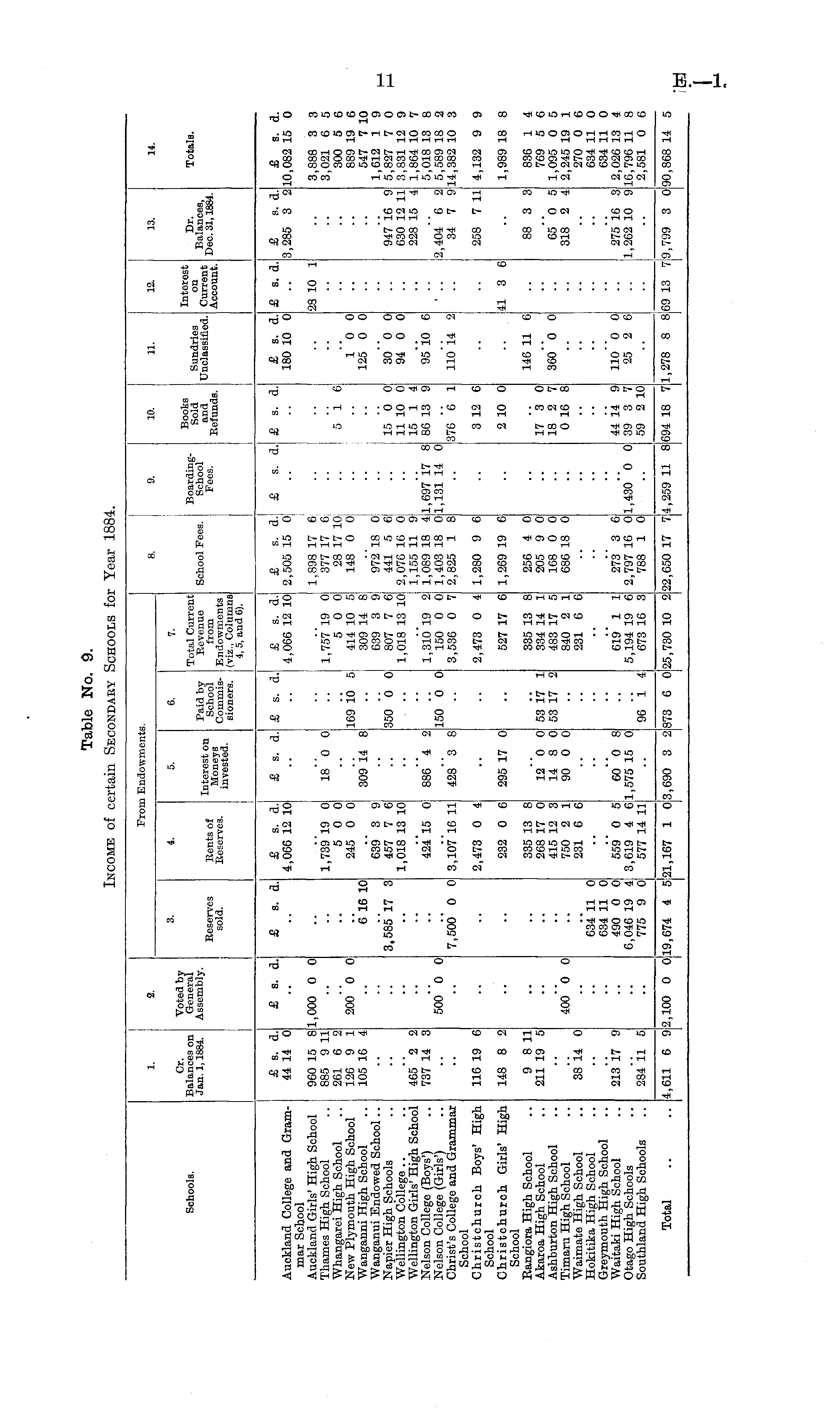 Froi Endowment: l. 8. 9. 10. 11. 12. 13. 14. Cr. Balances on Jan. 1,1884. Voted by General Assembly. 3. 4. 5. 6. 7. Total Current Revenue from Endowments (viz., Columns 4, 5, and 6). School Fees. BoardingSchool Fees. Books Sold and Refunds. Sundries Unclassified. Interest on Current Account. Dr. Balances, Dec. 31,1884. Totals. Schools. Reserves sold. Eents of Reserves. Interest on Moneys invested. Paid by School Commissioners. Auckland College and Grammar School Auckland Girls' High School Thames High School Whangarei High School New Plymouth High School Wanganni High School Wanganui Endowed School.. Napier High Schools Wellington College Wellington Girls' High School Nelson College (Boys') Nelson College (Girls') Christ's College and Grammar School Christchurch Boys' High School Christchurch Girls' High School Eangiora High School Akaroa High School Ashhurton High School Timaru High School Waimate High School Hokitika High School Greymouth High School Waitaki High School Otago High Schools Southland High Schools £ s. d. 44 14 0 £ s. a. £ s. a. £ s. d. 4,066 12 10 £ s. a. £ s. d.l £ s. d. 4,066 12 10 £ s. d. 2,505 15 0 £ s. d. i £ s. d. £ s. d. 180 10 0 £ s. a. £ s. d. 3,285 3 2 & s. d. 10,082 15 C .. 960 15 8 885 9 11 261 6 2 126 9 1 105 16 4 1,000 0 0 200 'o 0 1,739 19 0 5 0 0 245 0 o! 18 0 0 .. .. 169 10 5 1,757 19 0 5 0 0 414 10 5 309 14 8 639 3 9 807 7 6 1,018 13 10 1,898 17 6 377 17 6 28 17 10 148 0 0j i " 5 'i 6 .. I 10 0 125 0 0 28 10 1 3,888 3 S 3,021 6 S 300 5 e 889 19 £ 547 7 1C 1,612 1 £ 5,827 7 C 3,831 12 S 1,864 10 7 5,018 13 6 5,589 18 £ 14,382 10 3 6'16 10 ! 30914 8 3,58517 3 639" 3 9, 457 7 6 1,018 13 10 * * 350 0 0 972 18 0: 441 5 6! 2,070 16 0 1,155 11 9 1,089 18 4. 1,403 18 0: 2,825 1 8 • ■ i J 1,697 17 8 1,131 14 0 15 0 0 11 10 0 15 1 4 86 13 9 30 0 0 94 0 0 •• 947 16 9 630 12 11 228 15 41 465 '2 2 737 14 3 424*15 0 886"4 2 1,310 19 2 150 0 0 3,536 0 7 95 10 6 .. 500*'o 0 150 '6 0 * ■ ■ 2,404 6 2 34 7 9 7,500 0 0 3,10716 11 428"3 81 I 376 6 1 110 14 2! ■• 116 19 6 2,473 0 4 2,473 0 4 1,280 9 6 3 12 6 258 7 11 4,132 9 S 148 8 2 232 0 6 295 17 0 527 17 6 1,269 19 6 2 10 0 41 3 6 1,989 18 e 9 8 11 211 19 5 335 13 8 268 17 0 415 12 3 750 2 1 231 6 6 12 0 0 14 8 0 90 0 0 53 17 1 53 17 2 335 13 8 334 14 1 483 17 5 840 2 1 231 6 6 256 4 0 205 9 0 168 0 0 686 18 0 i 17 3 0 18 2 7 0 16 8 146 11 6 88 3 3 836 1 4 769 5 e 1,095 0 £ 2,245 19 ] 270 0 6 634 11 C 634 11 C 2,026 13 4 16,796 11 6 2,581 0 £ 360 "o 0 65 "o 5 318 2 4 400"0 0 38'i4 0 213 17 9 634 11 0 634 11 0 490 0 0 6,046 19 4 775 9 0 559 0 5 3,619 4 6 577 14 111 60 "o 8 11,575 15 0 619 1 1 5,194 19 6 673 16 3 273 3 6 2,797 16 0: 788 1 0 1,430*0 0 44 14 9 39 3 7 59 2 10 110 0 0| 25 2 6l 275' 16 3 1,262 10 9 mm 284 11 5 96 I 4 ! • • .. .. • • Total !2,650 17 7! 4,259 11 8 1,278 8 8 4,611 6 9 '2,100 0 0 19,674 4 5 21,167 1 0 3,690 3 2 873 6 0 25,730 10 2 22,650 17 7 694 18 7 69 13 7 [9,799 3 0 '90,868 14