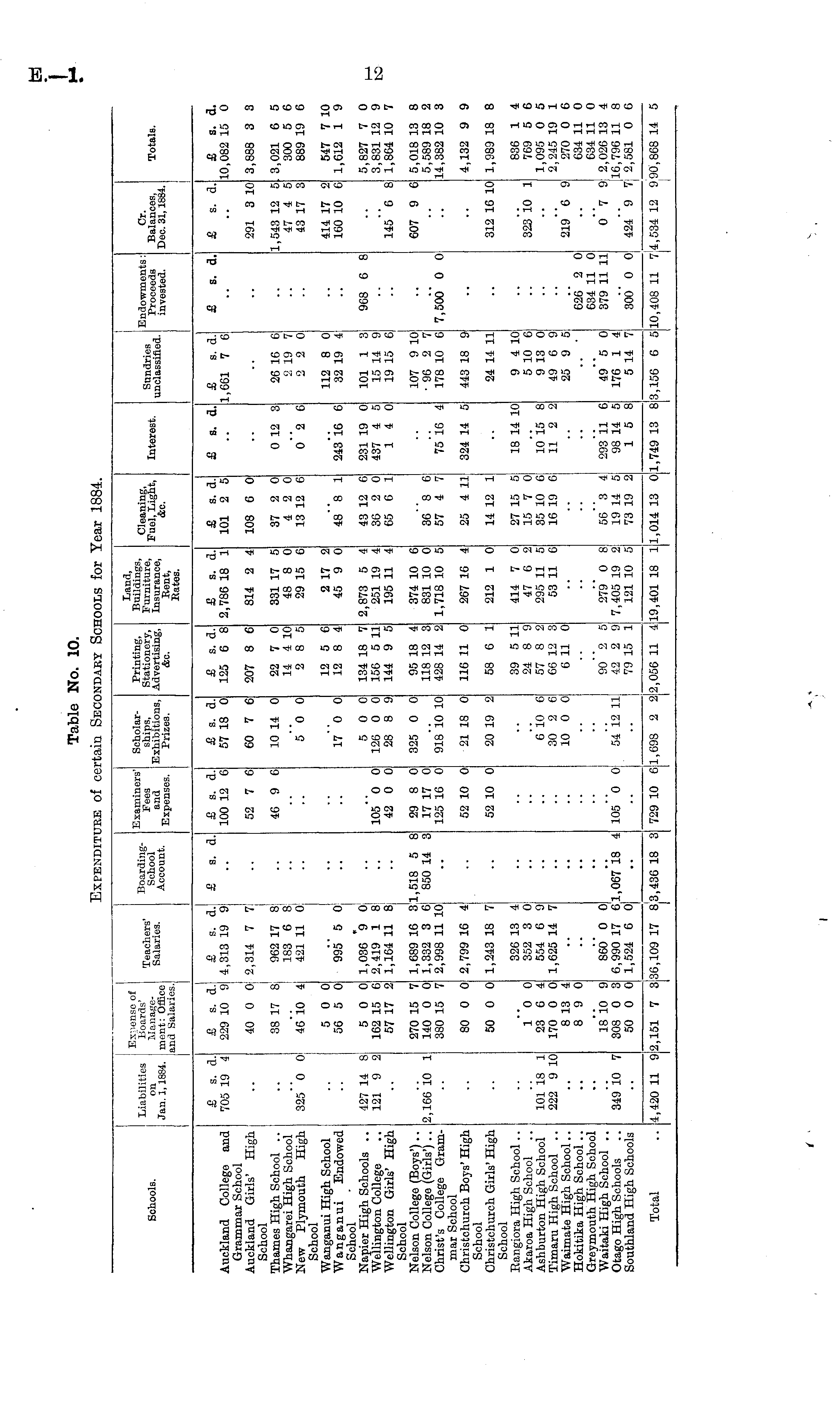 Table No. 10. Expenditure of certain Secondary Schools for Year 1884.
