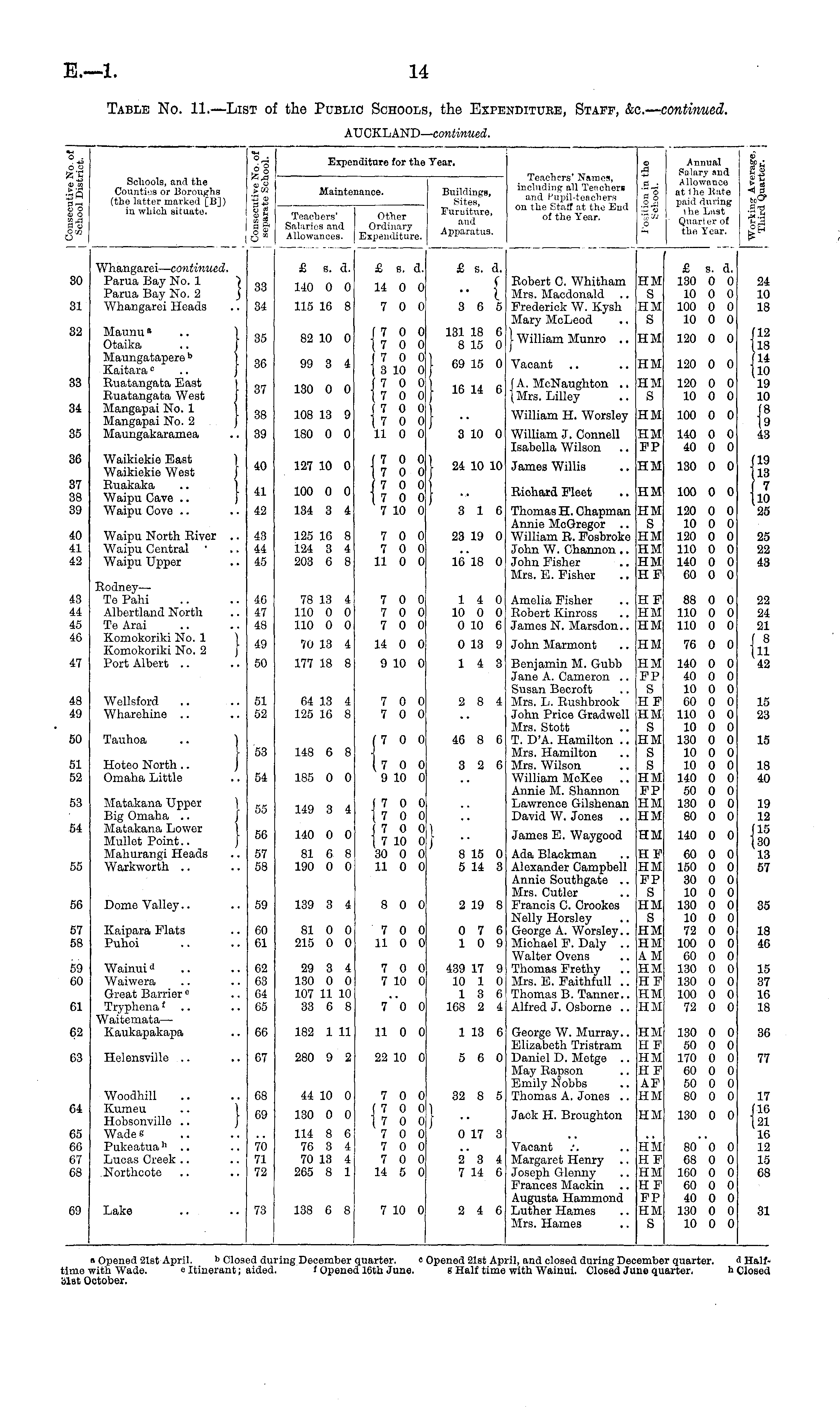Table No. 11.—List of the Public Schools, the Expenditure, Staff, &c.— continued. AUCKLAND— continued.