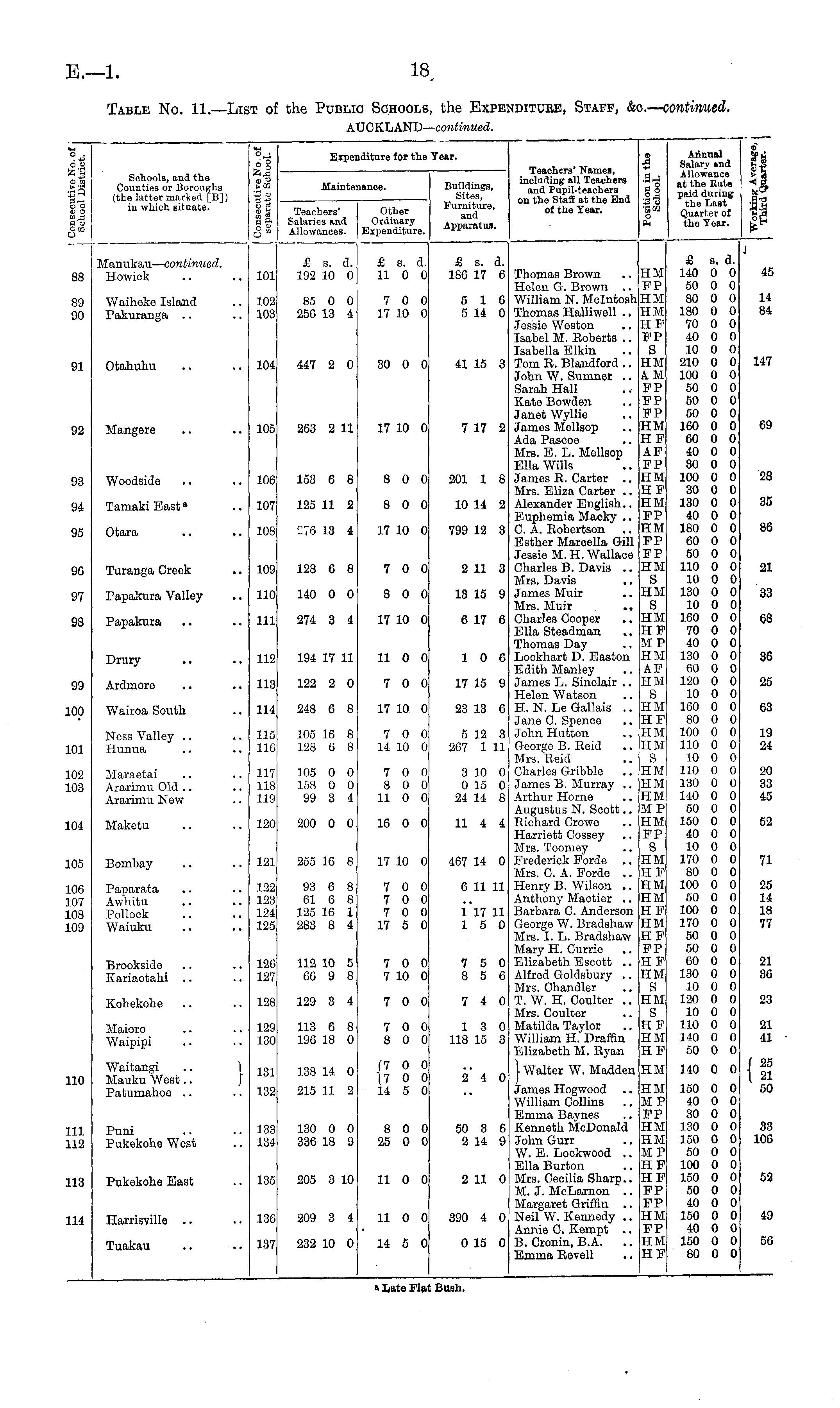 Table No. 11.—List of the Public Schools, the Expenditure, Staff, &c.— continued. AUCKLAND— continued.