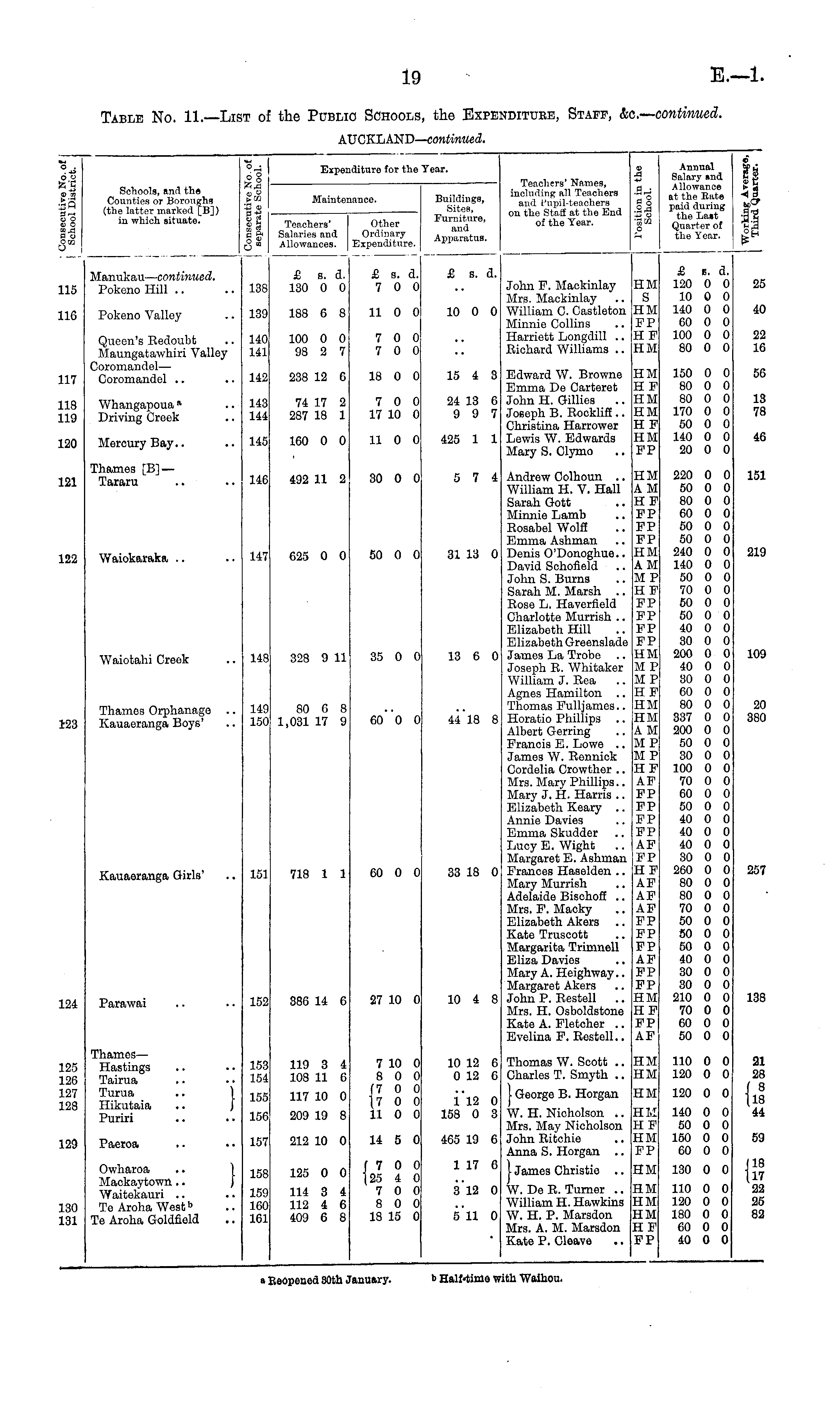 Table No. 11.—List of the Public Schools, the Expenditure, Staff, &c.— continued. AUCKLAND— continued.