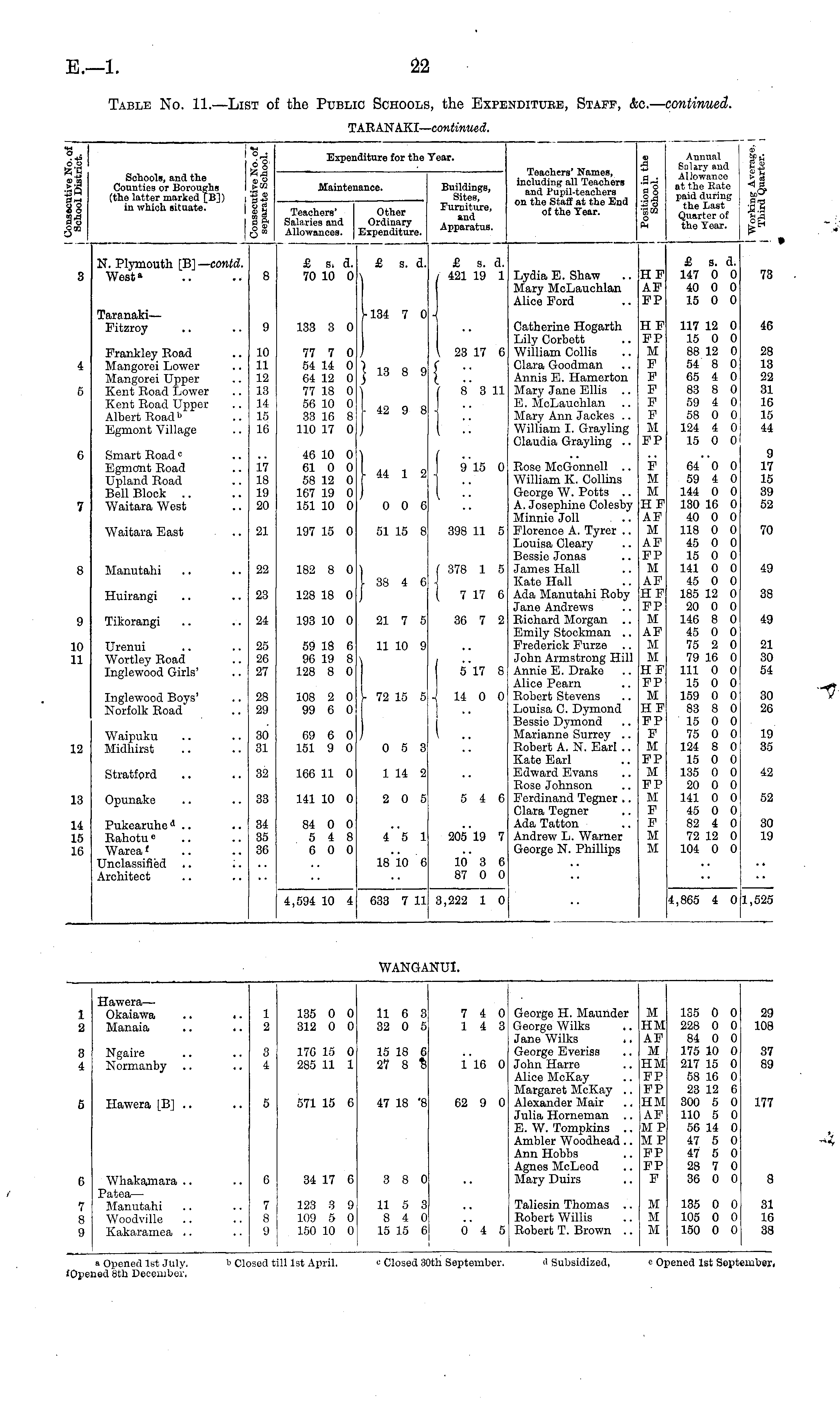 Table No. 11.—List of the Public Schools, the Expenditure, Staff, &c. — continued. TARANAKI— continued.
