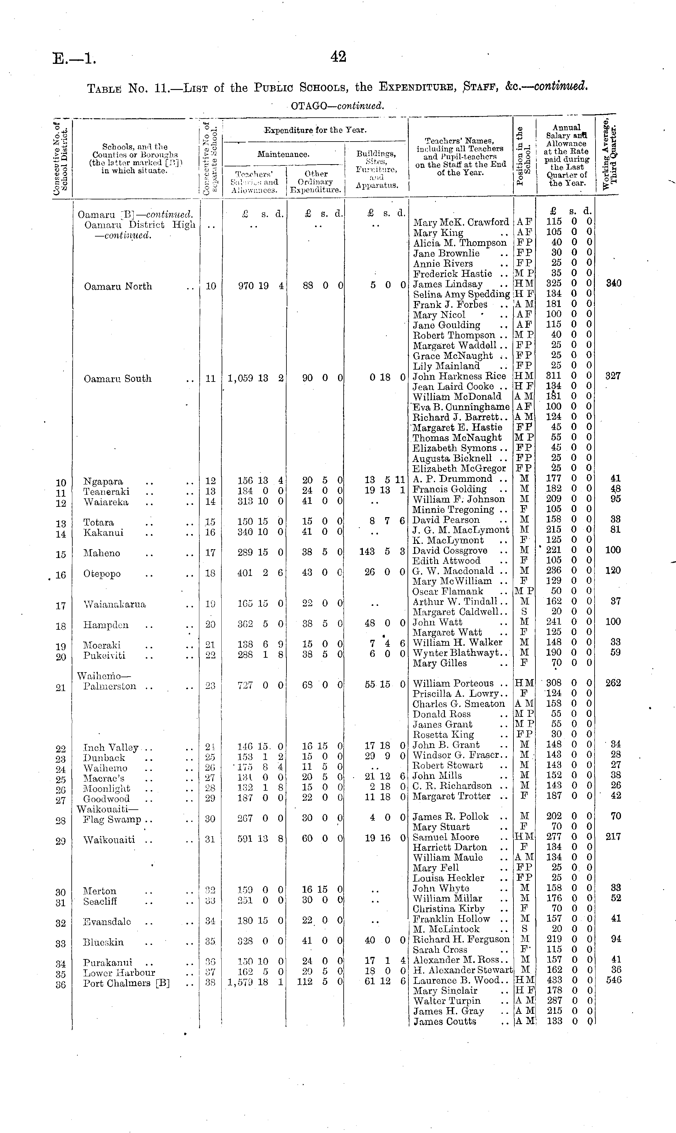 Table No. 11.—List of the Public Schools, the Expenditure, Staff, &c.— continued. OTAGO— continued.