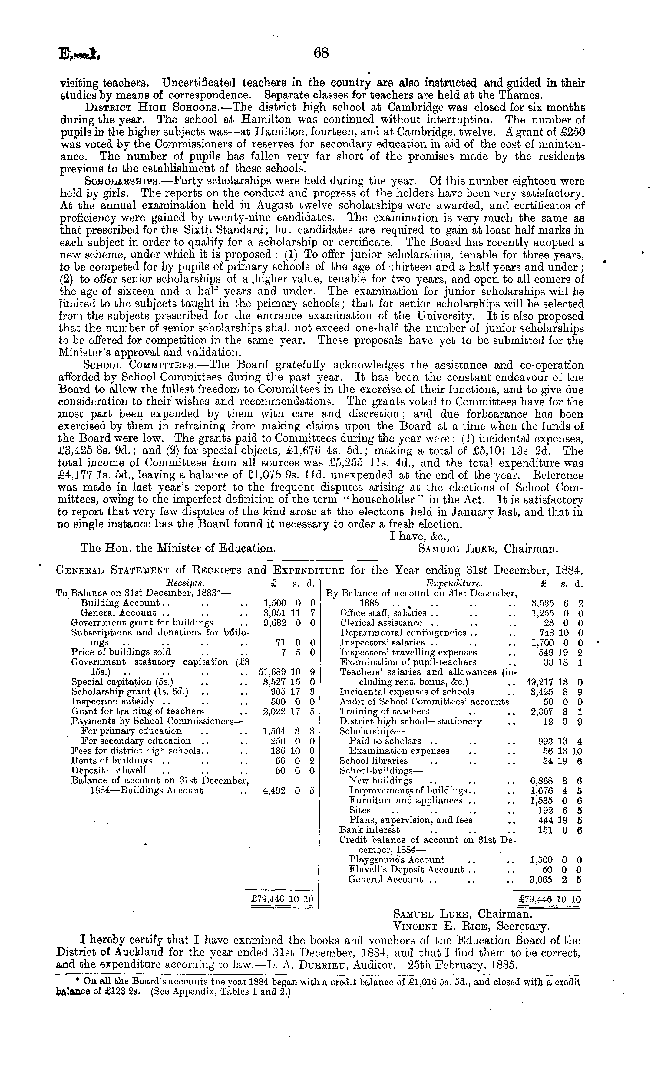 Genebal Statement of Eeceipts and Expenditube for the Year ending 31st December, 1884. Receipts. £ s. d. Expenditure. £ s. d. To Balance on 31st December, 1883*— By Balance of account on 31st December, Building Account.. .. .. 1,500 0 0 1883 .. .. .. .. 3,535 6 2 General Account .. .. .. 3,051 11 7 Office staff, salaries .. .. .. 1,255 0 0 Government grant for buildings .. 9,682 0 0 Clerical assistance .. .. .. 23 0 0 Subscriptions and donations for bilild- Departmental contingencies .. .. 748 10 0 ings .. .. .. .. 71 0 0 Inspectors' salaries .. .. .. 1,700 0 0 Price of buildings sold .. .. 7 5 0 Inspectors' travelling expenses .. 549 19 2 Government statutory capitation (£3 Examination of pupil-teachers .. 33 18 1 155.) .. .. .. .. 51,089 10 9 Teachers' salaries and allowances (inSpecial capitation (55.) .. .. 3,527 15 0 eluding rent, bonus, &c.) .. 49,217 13 0 Scholarship grant (Is. 6d.) .. .. 905 17 3 Incidental expenses of schools .. 3,425 8 9 Inspection subsidy .. .. .. 500 0 0 Audit of School Committees' accounts 50 0 0 Grant for training of teachers .. 2,022 17 5 Training of teachers .. .. 2,307 3 1 Payments by School Commissioners— District high school —stationery .. 12 3 9 For primary education .. .. 1,504 3 3 Scholarships— For secondary education ~ .. 250 0 0 Paid to scholars .. .. .. 993 13 i Fees for district high schools.. .. 136 10 0 Examination expenses .. .. 56 13 10 Bents of buildings .. .. .. 56 0 2 School libraries .. .. .. 54 19 6 Deposit—Flavell .. .. .. 50 0 0 School-buildings— Balance of account on 31st December, New buildings .. .. .. 6,868 8 6 1884 —Buildings Account .. 4,492 0 5 Improvements of buildings.. .. 1,676 4 5 Furniture and appliances .. .. 1,535 0 6 Sites .. .. .. .. 192 6 5 Plans, supervision, and fees .. 444 19 5 Bank interest .. .. .. 151 0 6 , Credit balance of account on 31st December, 1884 — Playgrounds Account .. .. 1,500 0 0 Flavell's Deposit Account .. .. 50 0 0 General Account .. .. .. 3,065 2 5 £79,446 10 10 £79,446 10 10 Samuel Luke, Chairman. Vincent E. Rice, Secretary. I hereby certify that I have examined the books and vouchers of the Education Board of the District of Auckland for the year ended 31st December, 1884, and that I find them to be correct, and the expenditure according to law.—L. A. Dukrieu, Auditor. 25th February, 1885.