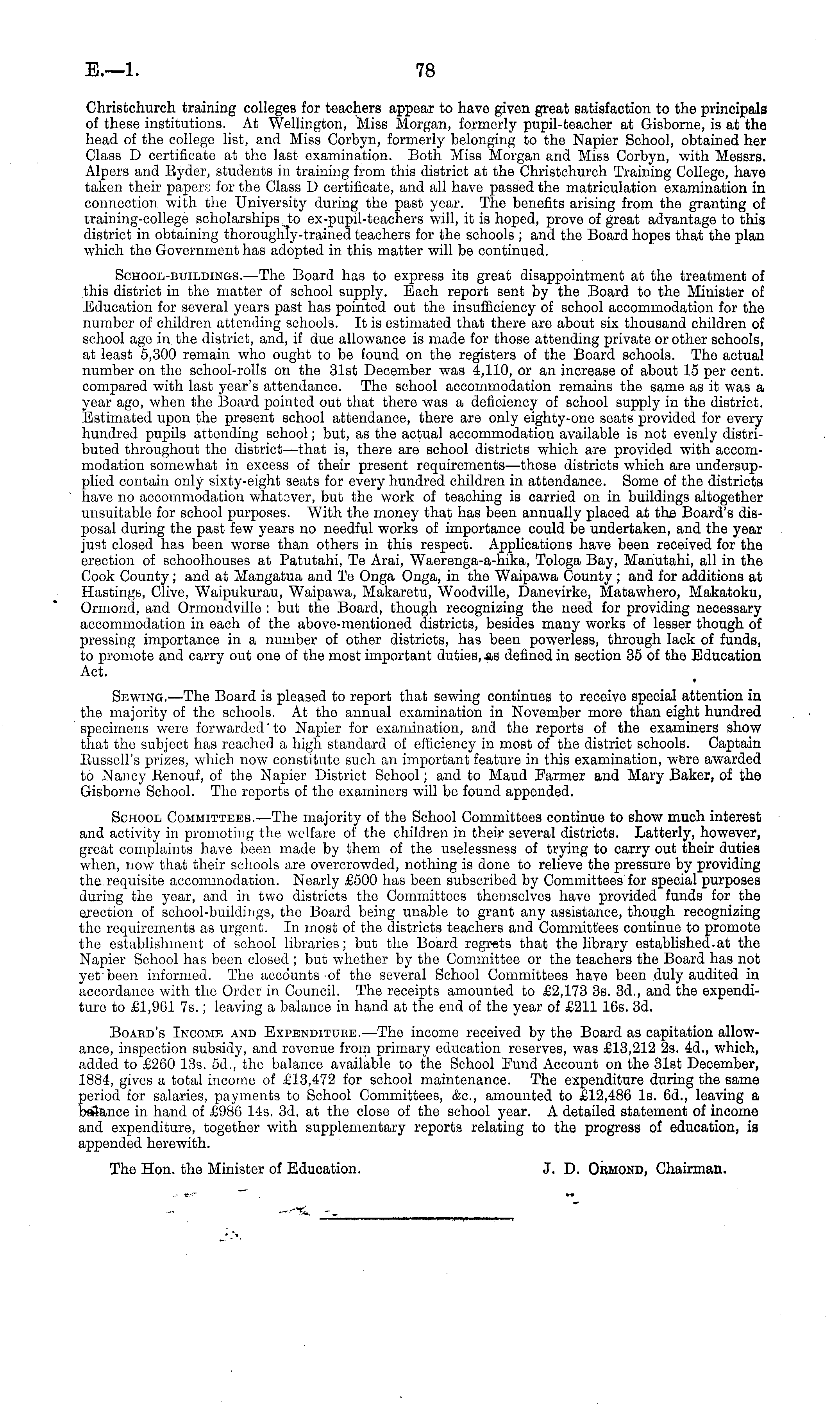 Christchurch training colleges for teachers appear to have given great satisfaction to the principals of these institutions. At Wellington, Miss Morgan, formerly pupil-teacher at Gisborne, is at the head of the college list, and Miss Gorbyn, formerly belonging to the Napier School, obtained her Class D certificate at the last examination. Both Miss Morgan and Miss Corbyn, with Messrs. Alpers and Eydor, students in training from this district at the Christchurch Training College, have taken their papers for the Class D certificate, and all have passed the matriculation examination in connection with the University during the past year. The benefits arising from the granting of training-college scholarships to ex-pupil-teachers will, it is hoped, prove of great advantage to thia district in obtaining thoroughly-trained teachers for the schools ; and the Board hopes that the plan which the Government has adopted in this matter will be continued. School-buildings.—The Board has to express its great disappointment at the treatment of this district in the matter of school supply. Bach report sent by the Board to the Minister of Education for several years past has pointed out the insufficiency of school accommodation for the number of children attending schools. It is estimated that there are about six thousand children of school age in the district, and, if due allowance is made for those attending private or other schools, at least 5,300 remain who ought to be found on the registers of the Board schools. The actual number on the school-rolls on the 31st December was 4,110, or an increase of about 15 per cent, compared with last year's attendance. The school accommodation remains tho same as it was a year ago, when the Board pointed out that there was a deficiency of school supply in the district. Estimated upon the present school attendance, there are only eighty-one seats provided for every hundred pupils attending school; but, as the actual accommodation available is not evenly distributed throughout the district—that is, there are school districts which are provided with accommodation somewhat in excess of their present requirements—those districts which are undersupplied contain only sixty-eight seats for every hundred children in attendance. Some of the districts have no accommodation whatever, but the work of teaching is carried on in buildings altogether unsuitable for school purposes. With the money that has been annually placed at the Board's disposal during the past few years no needful works of importance could bo undertaken, and the year just closed has been worse than others in this respect. Applications have been received for the erection of schoolhouses at Patutahi, Te Arai, Waerenga-a-hika, Tologa Bay, Manutahi, all in the Cook County; and at Mangatua and Te Onga Onga, in the Waipawa County ; and for additions at Hastings, Clive, Waipukurau, Waipawa, Makaretu, Woodville, Danevirke, Matawhero, Makatoku, Ormond, and Ormondville : but the Board, though recognizing tho need for providing necessary accommodation in each of the above-mentioned districts, besides many works of lesser though of pressing importance in a number of other districts, has been powerless, through lack of funds, to promote and carry out one of the most important duties, as defined in section 35 of the Education Act. Sewing.—The Board is pleased to report that sewing continues to receive special attention in the majority of tho schools. At the annual examination in November more than eight hundred specimens were forwarded' to Napier for examination, and the reports of the examiners show that tho subject has reached a high standard of efficiency in most of tho district schools. Captain Eussell's prizes, which now constitute such an important feature in this examination, were awarded to Nancy Eenouf, of the Napier District School; and to Maud Farmer and Mary Baker, of the Gisborne School. Tho reports of tho examiners will be found appended. School Committees.—The majority of tho School Committees continue to show much interest and activity in promoting the welfare of the children in their several districts. Latterly, however, great complaints have been made by them of the uselessness of trying to carry out their duties when, now that their schools are overcrowded, nothing is done to relieve the pressure by providing the requisite accommodation. Nearly £500 has been subscribed by Committees for special purposes during the year, and in two districts the Committees themselves have provided funds for tho erection of school-buildings, the Board being unable to grant any assistance, though recognizing the requirements as urgent. In most of the districts teachers and Committees continue to promote the establishment of school libraries; but the Board regrets that the library established.at the Napier School has been closed ; but whether by the Committee or the teachers the Board has not yet been informed. The accounts 'of the several School Committees have been duly audited in accordance with the Order in Council. Tho receipts amounted to £2,173 3s. 3d., and the expenditure to £1,961 75.; leaving a balance in hand at the end of the year of £211 16s. 3d. Board's Income and Expenditure . —The income received by the Board as capitation allowance, inspection subsidy, and revenue from primary education reserves, was £13,212 2s. 4d., which, added to £260 13s. 5d., the balance available to the School Fund Account on the 31st December, 1884, gives a total income of £13,472 for school maintenance. The expenditure during the same period for salaries, payments to School Committees, &c, amounted to £12,486 Is. 6d., leaving a balance in hand of £986 14s. 3d. at the close of the school year. A detailed statement of income and expenditure, together with supplementary reports relating to the progress of education, is appended herewith. The Hon. the Minister of Education. J. D. Ormond, Chairman. -"* ~.
