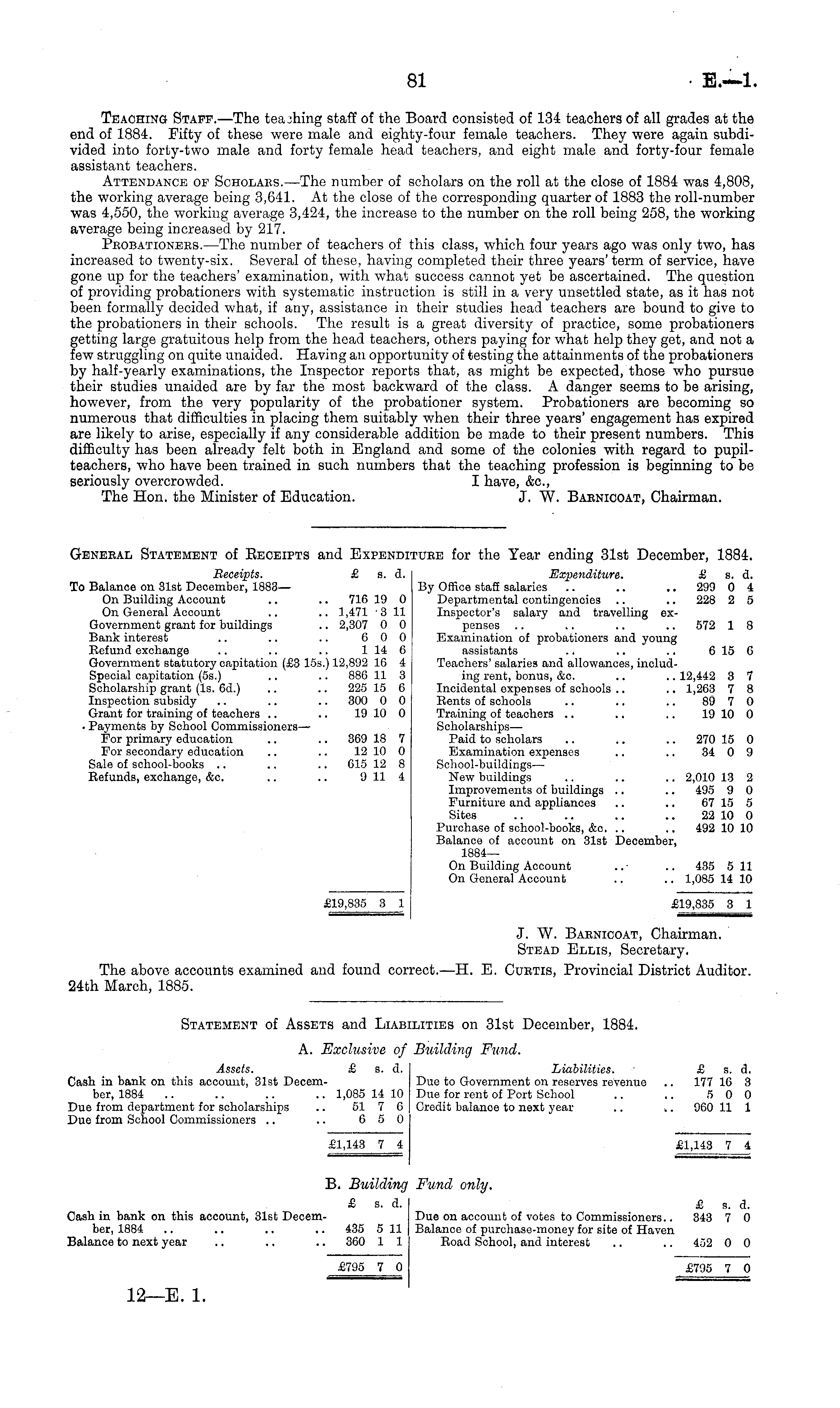 Geneeal Statement of Eeceipts and Expendituee for the Year ending 31st December, 1884. Receipts. £ s. d. Expenditure. £ s. d. To Balance on 31st December, 1883— By Office staff salaries .. .. .. 299 0 4 On Building Account .. .. 716 19 0 Departmental contingencies .. .. 228 2 5 On General Account .. .. 1,471 '3 11 Inspector's salary and travelling exGovcrnment grant for buildings .. 2,307 0 0 penses .. .. .. .. 572 1 8 Bank interest .. .. .. 6 0 0 Examination of probationers and young Refund exchange .. .. .. 114 6 assistants .. .. .. 615 0 Government statutory capitation (£3 155.) 12,892 16 4 Teachers'salaries and allowances, includSpecial capitation (55.) .. .. 886 11 3 ing rent, bonus, &c. .. .. 12,442 3 7 Scholarship grant (Is. 6d.) .. .. 225 15 6 Incidental expenses of schools .. .. 1,263 7 8 Inspection subsidy .. .. .. 300 0 0 Rents of schools .. .. .. 89 7 0 Grant for training of teachers .. .. 19 10 0 Training of teachers .. .. .. 19 10 0 • Payments by School Commissioners — Scholarships— For primary education .. .. 369 18 7 Paid to scholars .. .. .. 270 15 0 For secondary education .. .. 12 10 0 Examination expenses .. .. 34 0 9 Sale of school-books .. .. .. 615 12 8 School-buildings— Refunds, exchange, &c. .. .. 911 4 New buildings .. .. .. 2,010 13 2 Improvements of buildings .. .. 495 9 0 Furniture and appliances .. .. 67 15 5 Sites .. .. .. .. 22 10 0 Purchase of school-books, &c, .. .. 492 10 10 Balance of account on 31st December, 1884— On Building Account .. ■ .. 435 5 11 On General Account .. .. 1,085 14 10 £19,835 3 1 £19,835 3 1 J. W. Baenicoat, Chairman. Stead Ellis, Secretary. The above accounts examined and found correct.—H. E. Cuetis, Provincial District Auditor. 24th March, 1885.