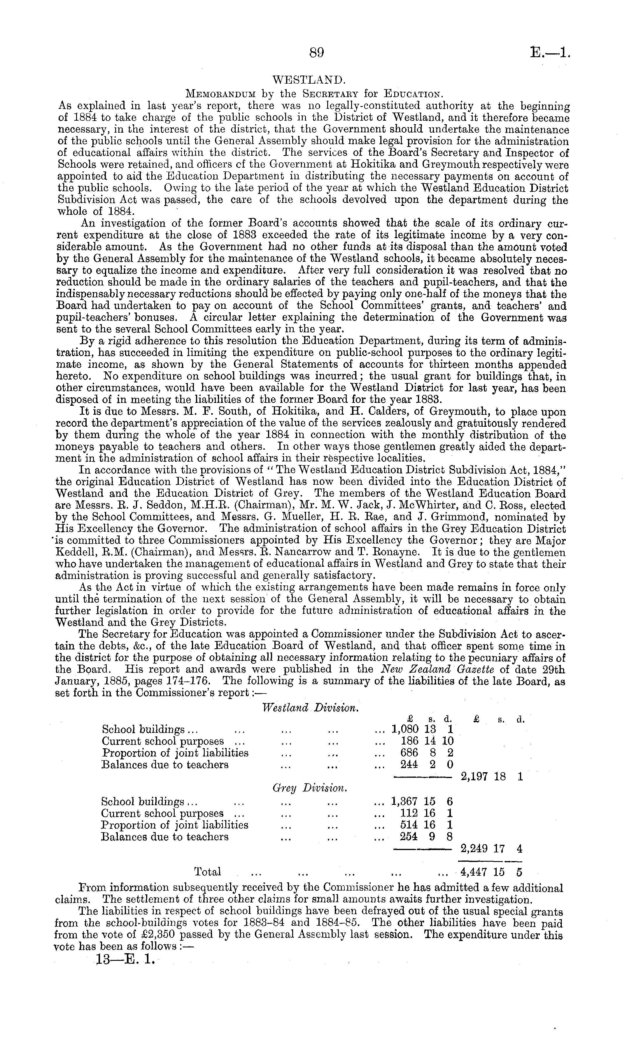 WE STL AND. Memorandum by the Secbetary for Education. As explained in last year's report, there was no legally-constituted authority at the beginning of 1884 to take charge of the public schools in the District of Westland, and it therefore became necessary, in the interest of the district, that the Government should undertake the maintenance of the public schools until the General Assembly should make legal provision for the administration of educational affairs within the district. The services of the Board's Secretary and Inspector of Schools were retained, and officers cf the Government at Hokitika and Greymouth respectively were appointed to aid the Education Department in distributing the necessary payments on account of the public schools. Owing to the late period of the year at which the Westland Education District Subdivision Act was passed, the care of the schools devolved upon the department during the whole of 1884. An investigation of the former Board's accounts showed that the scale of its ordinary current expenditure at the close of 1883 exceeded the rate of its legitimate income by a very considerable amount. As the Government had no other funds at its disposal than the amount voted by the General Assembly for the maintenance of the Westland schools, it became absolutely necessary to equalize the income and expenditure. After very full consideration it was resolved that no reduction should be made in the ordinary salaries of the teachers and pupil-teachers, and that the indispensably necessary reductions should be effected by paying only one-half of the moneys that the Board had undertaken to pay on account of the School Committees' grants, and teachers' and pupil-teachers' bonuses. A circular letter explaining the determination of the Government was sent to the several School Committees early in the year. By a rigid adherence to this resolution the Education Department, during its term of administration, has succeeded in limiting the expenditure on public-school purposes to the ordinary legitimate income, as shown by the General Statements of accounts for thirteen months appended hereto. No expenditure on school buildings was incurred; the usual grant for buildings that, in other circumstances, would have been available for the Westland District for last year, has been disposed of in meeting the liabilities of the former Board for the year 1883. It is due to Messrs. M. F. South, of Hokitika, and H. Calders, of Greymouth, to place upon record the department's appreciation of the value of the services zealously and gratuitously rendered by them during the whole of the year 1884 in connection with the monthly distribution of the moneys payable to teachers and others. In other ways those gentlemen greatly aided the department in the administration of school affairs in their respective localities. In accordance with the provisions of " The Westland Education District Subdivision Act, 1884," the original Education District of Westland has now been divided into the Education District of Westland and the Education District of Grey. The members of the Westland Education Board are Messrs. E. J. Seddon, M.H.E. (Chairman), Mr. M. W. Jack, J. McWhirter, and C. Boss, elected by the School Committees, and Messrs. G. Mueller, H. E. Eae, and J. Grimmond, nominated by His Excellency the Governor. The administration of school affairs in the Grey Education District 'is committed to three Commissioners appointed by His Excellency the Governor; they are Major Keddoll, E.M. (Chairman), and Messrs. E. Nancarrow and T. Eonayne. It is due to the gentlemen who have undertaken the management of educational affairs in Westland and Grey to state that their administration is proving successful and generally satisfactory. As the Act in virtue of which the existing arrangements have been made remains in force only until the termination of the next session of the General Assembly, it will be necessary to obtain further legislation in order to provide for the future administration of educational affairs in the Westland and the Grey Districts. The Secretary for Education was appointed a Commissioner under the Subdivision Act to ascertain the debts, &c, of the late Education Board of Westland, and that officer spent some time in the district for the purpose of obtaining all necessary information relating to the pecuniary affairs of the Board. His report and awards were published in the New Zealand Gazette of date 29th January, 1885, pages 174-176. The following is a summary of the liabilities of the late Board, as set forth in the Commissioner's report :■ — Westland Division. £ s. cl. £ s. d. School buildings... ... ... ... ...1,08013 1 Current school purposes ... ... ... ... 186 14 10 Proportion of joint liabilities ... ... ... 686 8 2 Balances due to teachers ... ... ... 244 2 0 2,197 18 1 Grey Division. School buildings... ... ... ... ... 1,367 15 6 Current school purposes ... ... ... ... 112 16 1 Proportion of joint liabilities ... ... ... 514 16 1 Balances due to teachers ... ... ... 254 9 8 2,249 17 4 Total ... ... ... ... ... 4,447 15 5 From information subsequently received by the Commissioner he has admitted a few additional claims. The settlement of three other claims for small amounts awaits further investigation. The liabilities in respect of school buildings have been defrayed out of the usual special grants from the school-buildings votes for 1883-84 and 1884-85. The other liabilities have been paid from the vote of £2,350 passed by the General Assembly last session. The expenditure under this vote has been as follows :— 13—E. 1.
