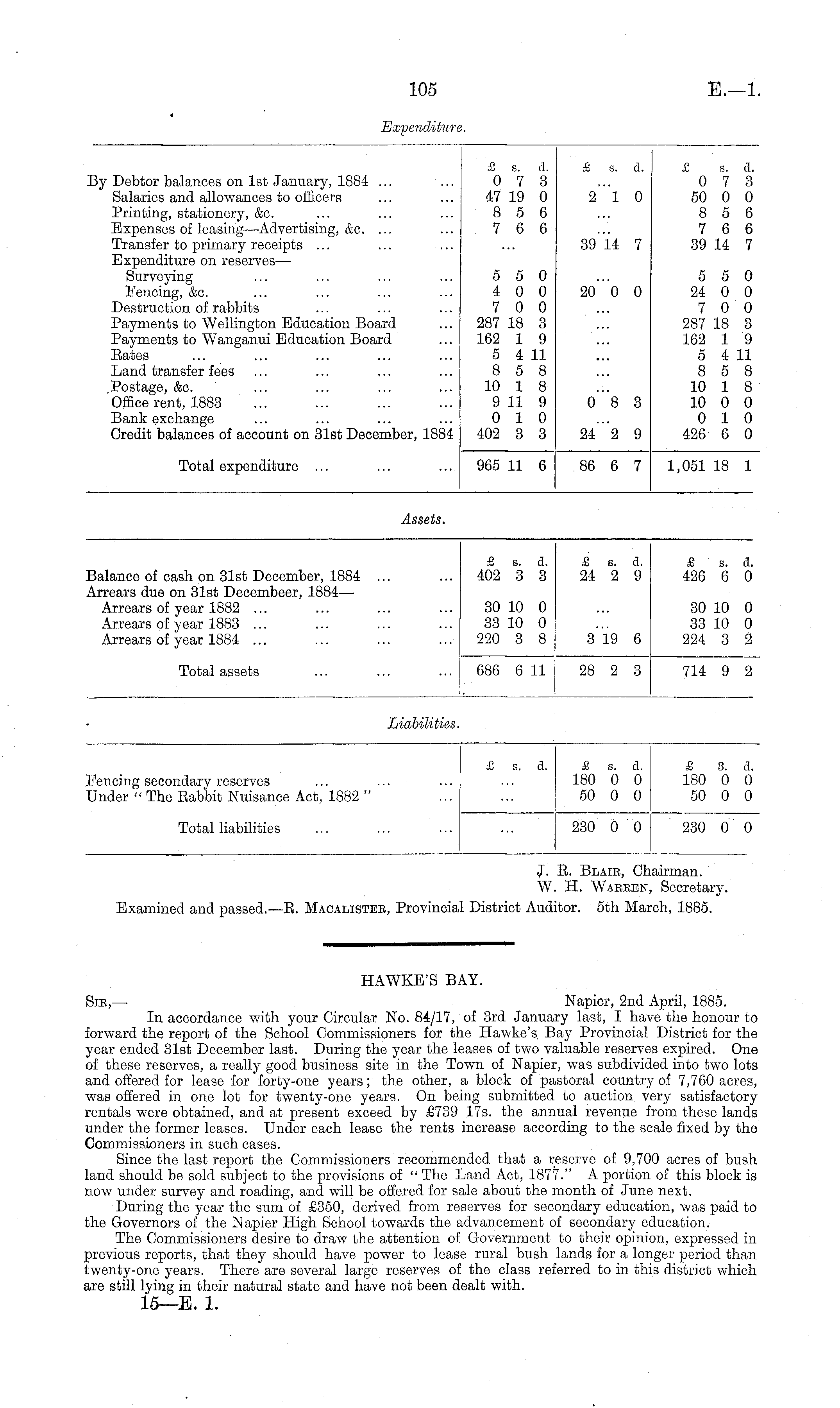HAWKE'S BAY. Bm,— Napier, 2nd April, 1885. In accordance with your Circular No. 84/17, of 3rd January last, I have the honour to forward the report of the School Commissioners for the Hawke's. Bay Provincial District for the year ended 31st December last. During the year the leases of two valuable reserves expired. One of these reserves, a really good business site in the Town of Napier, was subdivided into two lots and offered for lease for forty-one years; the other, a block of pastoral country of 7,760 acres, was offered in one lot for twenty-one years. On being submitted to auction very satisfactory rentals were obtained, and at present exceed by £739 17s. the annual revenue from these lands under the former leases. Under each lease the rents increase according to the scale fixed by the Commissioners in such cases. Since the last report the Commissioners recommended that a reserve of 9,700 acres of bush land should be sold subject to the provisions of " The Land Act, 1877." A portion of this block is now under survey and roading, and will be offered for sale about the month of June next. During the year the sum of £350, derived from reserves for secondary education, was paid to the Governors of the Napier High School towards the advancement of secondary education. The Commissioners desire to draw the attention of Government to their opinion, expressed in previous reports, that they should have power to lease rural bush lands for a longer period than twenty-one years. There are several large reserves of the class referred to in this district which are still lying in their natural state and have not been dealt with. 15—B. 1.