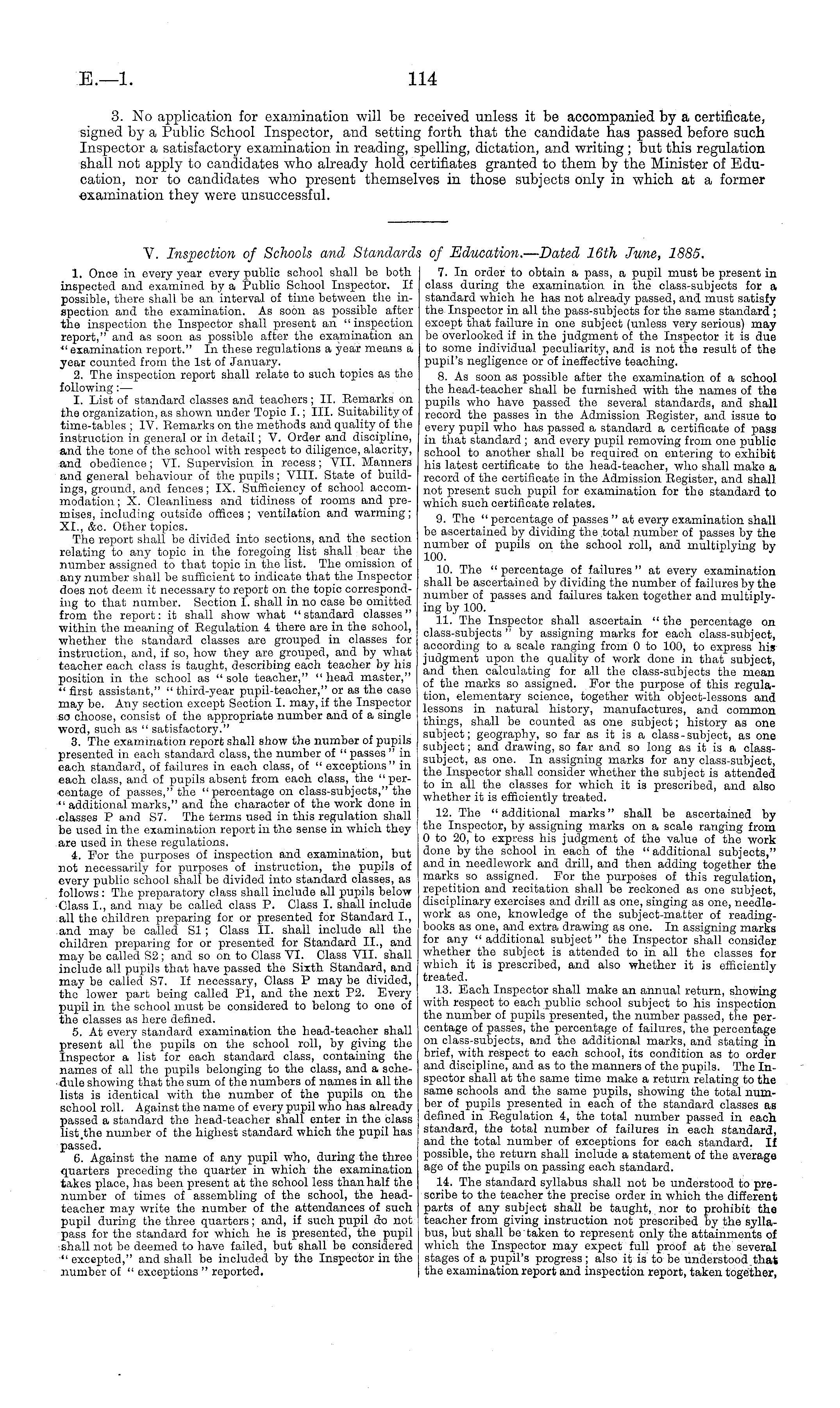 V. Inspection of Schools and Standards of Education. — Dated 16th June, 1885.
