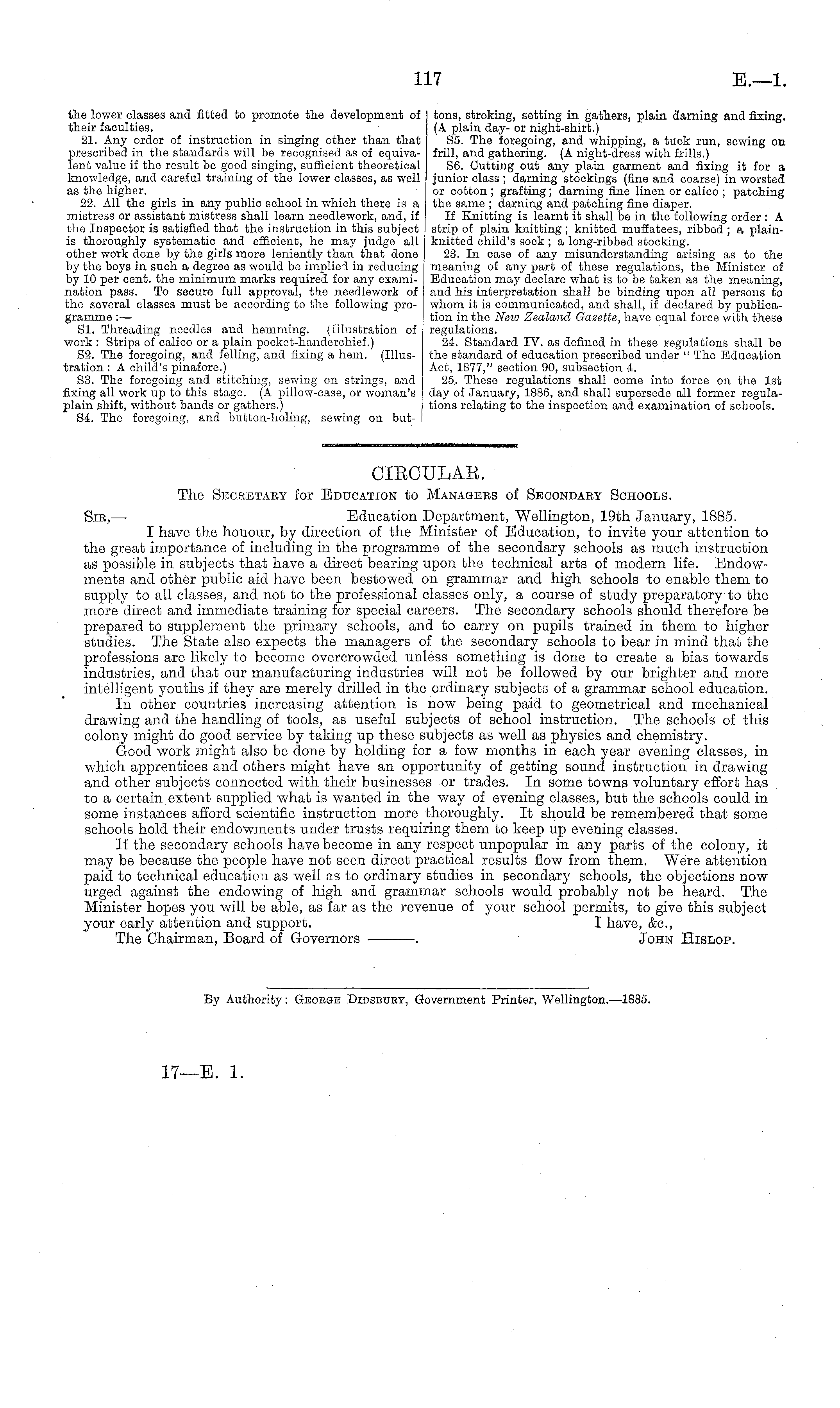 CIEOULAE. The Secbbtaey for Education to Managers of Secondary Schools. Sib, — Education Department, Wellington, 19th January, 1885. I have the honour, by direction of the Minister of Education, to invite your attention to the great importance of including in the programme of the secondary schools as much instruction as possible in subjects that have a direct bearing upon the technical arts of modern life. Endowments and other public aid have been bestowed on grammar and high schools to enable them to supply to all classes, and not to the professional classes only, a course of study preparatory to the more direct and immediate training for special careers. The secondary schools should therefore be prepared to supplement the primary schools, and to carry on pupils trained in them to higher studies. The State also expects the managers of the secondary schools to bear in mind that the professions are likely to become overcrowded unless something is done to create a bias towards industries, and that our manufacturing industries will not be followed by our brighter and more intelligent youths if they are merely drilled in the ordinary subjects of a grammar school education. In other countries increasing attention is now being paid to geometrical and mechanical drawing and the handling of tools, as useful subjects of school instruction. The schools of this colony might do good service by taking up these subjects as well as physics and chemistry. Good work might also be done by holding for a few months in each year evening classes, in which apprentices and others might have an opportunity of getting sound instruction in drawing and other subjects connected with their businesses or trades. In some towns voluntary effort has to a certain extent supplied what is wanted in the way of evening classes, but the schools could in some instances afford scientific instruction more thoroughly. It should be remembered that some schools hold their endowments under trusts requiring them to keep up evening classes. If the secondary schools have become in any respect unpopular in any parts of the colony, it may be because the people have not seen direct practical results flow from them. Were attention paid, to technical education as well as to ordinary studies in secondary schools, the objections now urged against the endowing of high and grammar schools would probably not be heard. The Minister hopes you will be able, as far as the revenue of your school permits, to give this subject your early attention and support. I have, &c, The Chairman, Board of Governors . John Hislop.