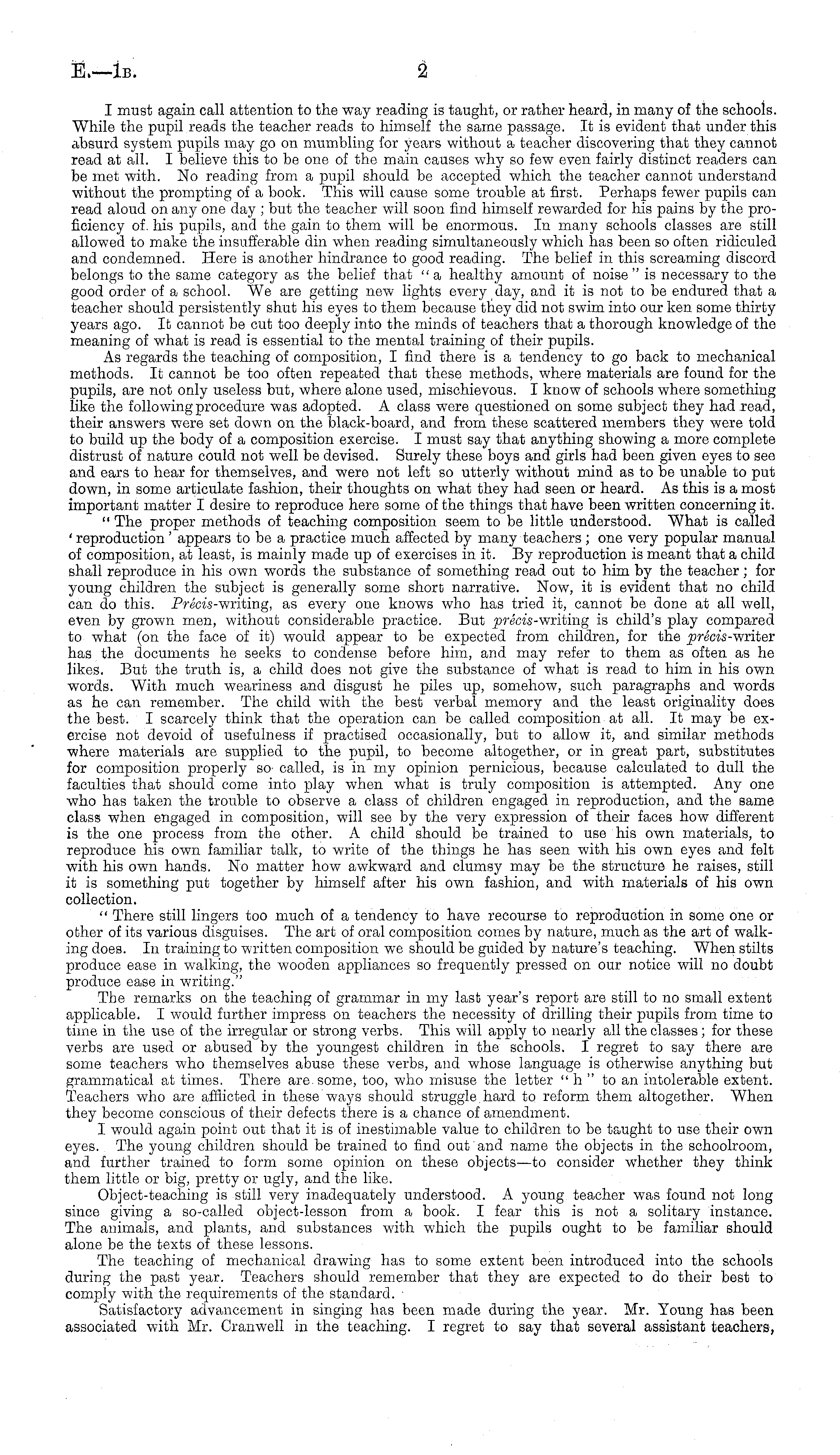 I must again call attention to the way reading is taught, or rather heard, in many of the schools. While the pupil reads the teacher reads to himself the same passage. It is evident that under this absurd system pupils may go on mumbling for years without a teacher discovering that they cannot read at all. I believe this to be one of the main causes why so few even fairly distinct readers can be met with. No reading from a pupil should be accepted which the teacher cannot understand without the prompting of a book. This will cause some trouble at first. Perhaps fewer pupils can read aloud on any one day ; but the teacher will soon find himself rewarded for his pains by the proficiency of. his pupils, and the gain to them will be enormous. In many schools classes are still allowed to make the insufferable din when reading simultaneously which has been so often ridiculed and condemned. Here is another hindrance to good reading. The belief in this screaming discord belongs to the same category as the belief that "a healthy amount of noise" is necessary to the good order of a school. We are getting new lights every day, and it is not to be endured that a teacher should persistently shut his eyes to them because they did not swim into our ken some thirty years ago. It cannot be cut too deeply into the minds of teachers that a thorough knowledge of the meaning of what is read is essential to the mental training of their pupils. As regards the teaching of composition, I find there is a tendency to go back to mechanical methods. It cannot be too often repeated that these methods, where materials are found for the pupils, are not only useless but, where alone used, mischievous. I know of schools where something like the following procedure was adopted. A class were questioned on some subject they had read, their answers were set down on the black-board, and from these scattered members they were told to build up the body of a composition exercise. I must say that anything showing a more complete distrust of nature could not well be devised. Surely these boys and girls had been given eyes to see and ears to hear for themselves, and were not left so utterly without mind as to be unable to put down, in some articulate fashion, their thoughts on what they had seen or heard. As this is a most important matter I desire to reproduce here some of the things that have been written concerning it. " The proper methods of teaching composition seem to be little understood. What is called ' reproduction ' appears to be a practice much affected by many teachers ; one very popular manual of composition, at least, is mainly made up of exercises in it. By reproduction is meant that a child shall reproduce in his own words the substance of something read out to him by the teacher; for young children the subject is generally some short narrative. Now, it is evident that no child can do this. Precis-writing, as every one knows who has tried it, cannot be done at all well, even by grown men, without considerable practice. But precis-writing is child's play compared to what (on the face of it) would appear to be expected from children, for the precis-writer has the documents he seeks to condense before him, and may refer to them as often as he likes. But the truth is, a child does not give the substance of what is read to him in his own words. With much weariness and disgust he piles up, somehow, such paragraphs and words as he can remember. The child with the best verbal memory and the least originality does the best. I scarcely think that the operation can be called composition at all. It may be exercise not devoid of usefulness if practised occasionally, but to allow it, and similar methods where materials are supplied to the pupil, to become altogether, or in great part, substitutes for composition properly so called, is in my opinion pernicious, because calculated to dull the faculties that should come into play when what is truly composition is attempted. Any one who has taken the trouble to observe a class of children engaged in reproduction, and the same class when engaged in composition, will see by the very expression of their faces how different is the one process from the other. A child should be trained to use his own materials, to reproduce his own familiar talk, to write of the things he has seen with his own eyes and felt with his own hands. No matter how awkward and clumsy may be the structure he raises, still it is something put together by himself after his own fashion, and with materials of his own collection. " There still lingers too much of a tendency to have recourse to reproduction in some one or other of its various disguises. The art of oral composition comes by nature, much as the art of walking does. In training to written composition we should be guided by nature's teaching. When stilts produce ease in walking, the wooden appliances so frequently pressed on our notice will no doubt produce ease in writing." The remarks on the teaching of grammar in my last year's report are still to no small extent applicable. I would further impress on teachers the necessity of drilling their pupils from time to time in the use of the irregular or strong verbs. This will apply to nearly all the classes ; for these verbs are used or abused by the youngest children in the schools. I regret to say there are some teachers who themselves abuse these verbs, and whose language is otherwise anything but grammatical at times. There are. some, too, who misuse the letter "h " to an intolerable extent. Teachers who are afflicted in these ways should struggle. hard to reform them altogether. When they become conscious of their defects there is a chance of amendment. I would again point out that it is of inestimable value to children to be taught to use their own eyes. The young children should be trained to find out and name the objects in the schoolroom, and further trained to form some opinion on these objects—to 