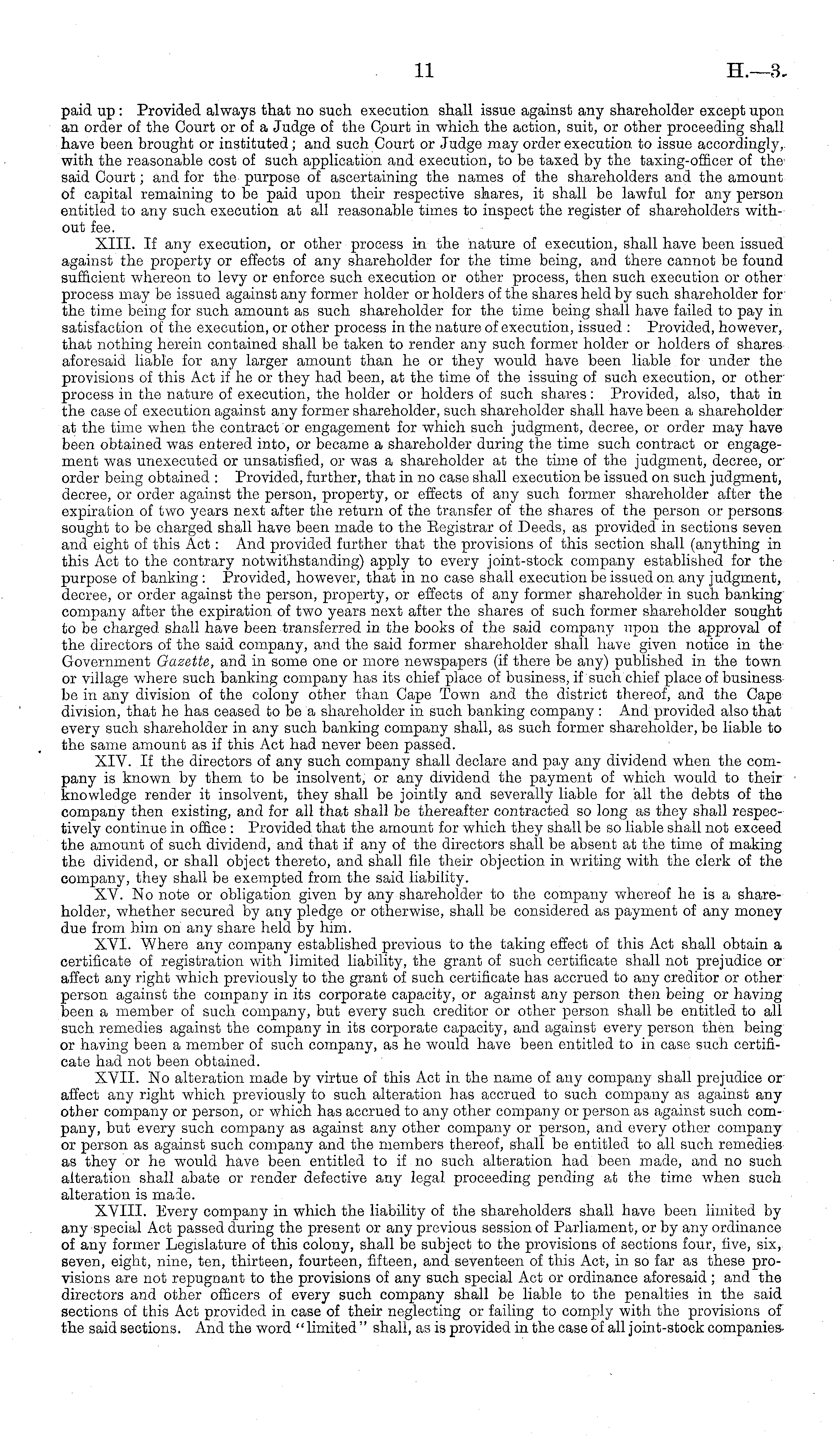 paid up: Provided always that no such execution shall issue against any shareholder except upon an order of the Court or of a Judge of the Court in which the action, suit, or other proceeding shall have been brought or instituted; and such Court or Judge may order execution to issue accordingly, with the reasonable cost of such application and execution, to be taxed by the taxing-officer of the said Court; and for the purpose of ascertaining the names of the shareholders and the amount of capital remaining to be paid upon their respective shares, it shall be lawful for any person entitled to any such execution at all reasonable times to inspect the register of shareholders without fee. XIII. If any execution, or other process in the nature of execution, shall have been issued against the property or effects of any shareholder for the time being, and there cannot be found sufficient whereon to levy or enforce such execution or other process, then such execution or other process may be issued against any former holder or holders of the shares held by such shareholder for the time being for such amount as such shareholder for the time being shall have failed to pay in satisfaction of the execution, or other process in the nature of execution, issued : Provided, however, that nothing herein contained shall be taken to render any such former holder or holders of shares aforesaid liable for any larger amount than he or they would have been liable for under the provisions of this Act if he or they had been, at the time of the issuing of such execution, or other* process in the nature of execution, the holder or holders of such shares : Provided, also, that in the case of execution against any former shareholder, such shareholder shall have been a shareholder at the time when the contract or engagement for which such judgment, decree, or order may have been obtained was entered into, or became a shareholder during the time such contract or engagement was unexecuted or unsatisfied, or was a shareholder at the time of the judgment, decree, or order being obtained : Provided, further, that in no case shall execution be issued on such judgment, decree, or order against the person, property, or effects of any such former shareholder after the expiration of two years next after the return of the transfer of the shares of the person or persons sought to be charged shall have been made to the Begistrar of Deeds, as provided in sections seven and eight of this Act : And provided further that the provisions of this section shall (anything in this Act to the contrary notwithstanding) apply to every joint-stock company established for the purpose of banking : Provided, however, that in no case shall execution be issued on any judgment, decree, or order against the person, property, or effects of any former shareholder in such banking company after the expiration of two years next after the shares of such former shareholder sought to be charged shall have been transferred in the books of the said company upon the approval of the directors of the said company, and the said former shareholder shall have given notice in the Government Gazette, and in some one or more newspapers (if there be any) published in the town or village where such banking company has its chief place of business, if such chief place of business be in any division of the colony other than Cape Town and the district thereof, and the Cape division, that he has ceased to be a shareholder in such banking company : And provided also that every such shareholder in any such banking company shall, as such former shareholder, bo liable to the same amount as if this Act had never been passed. XIV. If the directors of any such company shall declare and pay any dividend when the company is known by them to be insolvent, or any dividend the payment of which would to their knowledge render it insolvent, they shall be jointly and severally liable for all the debts of the company then existing, and for all that shall be thereafter contracted so long as they shall respectively continue in office : Provided that the amount for which they shall be so liable shall not exceed the amount of such dividend, and that if any of the directors shall be absent at the time of making the dividend, or shall object thereto, and shall file their objection in writing with the clerk of the company, they shall be exempted from the said liability. XV. No note or obligation given by any shareholder to the company whereof he is a shareholder, whether secured by any pledge or otherwise, shall be considered as payment of any money due from him on any share held by him. XVI. Where any company established previous to the taking effect of this Act shall obtain a certificate of registration with limited liability, the grant of such certificate shall not prejudice or' affect any right which previously to the grant of such certificate has accrued to any creditor or other person against the company in its corporate capacity, or against any person then being or having been a member of such company, but every such creditor or other person shall be entitled to all such remedies against the company in its corporate capacity, and against every person then being or having been a member of such company, as he would have been entitled to in case such certificate had not been obtained. XVII. No alteration made by virtue of this Act in the name of any company shall prejudice or affect any right which previously to such alteration has accrued to such company as against any other company or person, or which has accrued to any other company or person as against such company, but every such company as against any other company or person, and every other company or person as against such company and the members thereof, shall be entitled to all such remedies as they or he would have been entitled to if no such alteration had been made, and no such alteration shall abate or render defective any legal p
