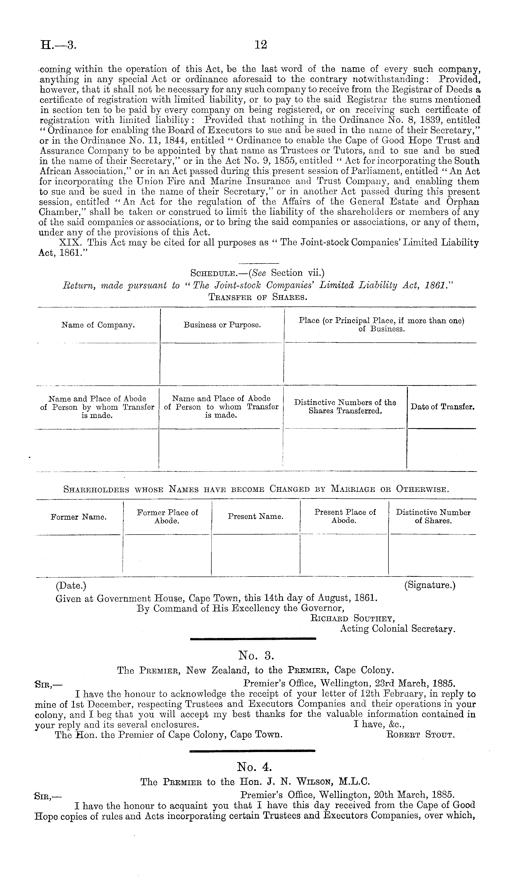 No. 4. The Peemiee to the Hon. J. N. Wilson, M.L.C. Sie,— Premier's Office, Wellington, 20th March, 1885. I have the honour to acquaint you that I have this day received from the Cape of Good Hope copies of rules and Acts incorporating certain Trustees and Executors Companies, over which,