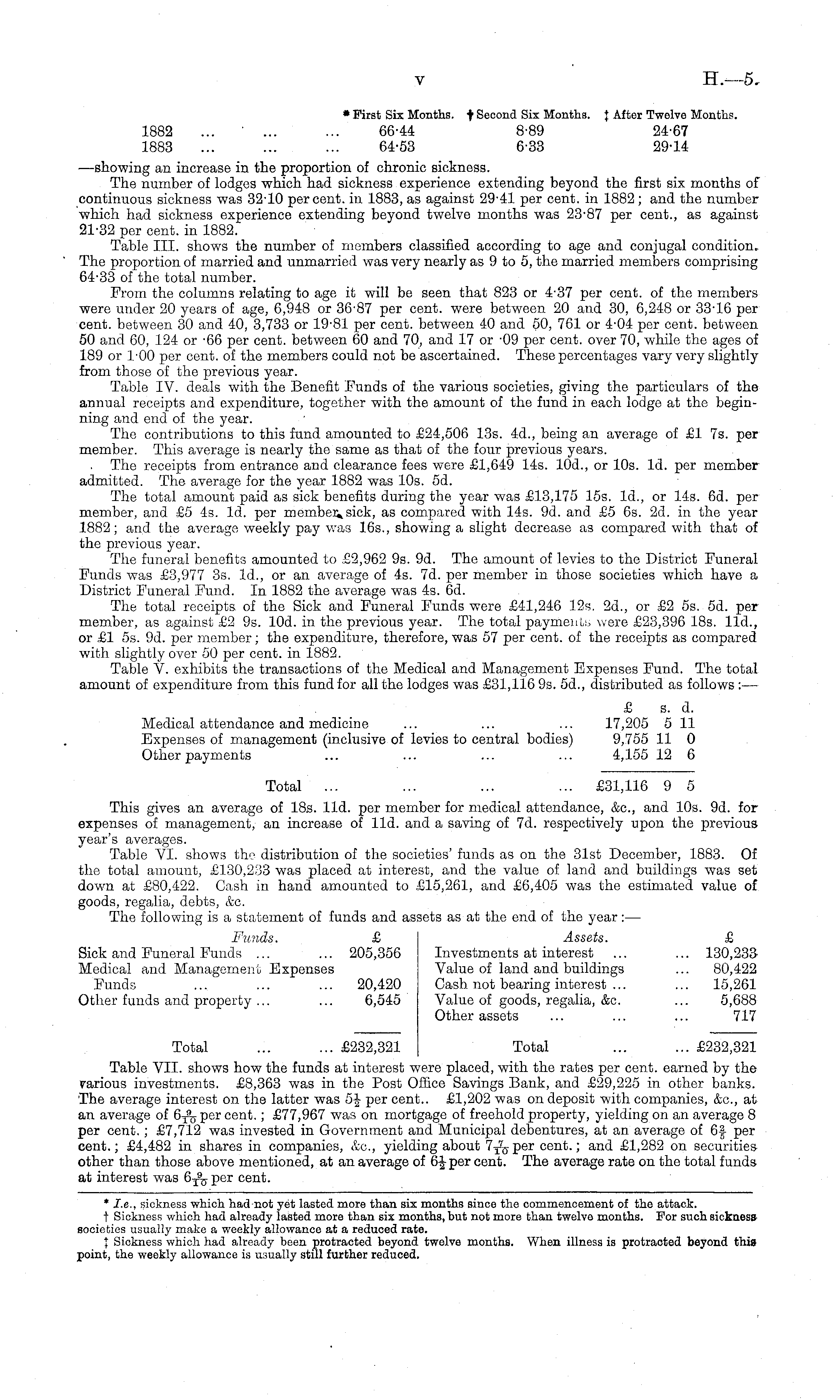 * First Six Months. + Second Six Months. } After Twelve Months. 1882 ... ' ... ... 66-44 8-89 24-67 1883 ... ... ... 64-53 6-33 29-14 —showing an increase in the proportion of chronic sickness. The number of lodges which had sickness experience extending beyond the first six months of continuous sickness was 32-10 percent, in 1883, as against 29-41 per cent, in 1882 ; and the number which had sickness experience extending beyond twelve months was 23-87 per cent., as against 21-32 per cent, in 1882. Table 111. shows the number of members classified according to age and conjugal condition. The proportion of married and unmarried was very nearly as 9 to 5, the married members comprising 64-33 of the total number. From the columns relating to age it will be seen that 823 or 4-37 per cent, of the members were under 20 years of age, 6,948 or 36-87 per cent, were between 20 and 30, 6,248 or 33-16 per cent, between 30 and 40, 3,733 or 19-81 per cent, between 40 and 50, 761 or 4-04 per cent, between 50 and 60, 124 or -66 per cent, between 60 and 70, and 17 or -09 per cent, over 70, while the ages of 189 or 1-00 per cent, of the members could not be ascertained. These percentages vary very slightly from those of the previous year. Table IV. deals with the Benefit Funds of the various societies, giving the particulars of the annual receipts and expenditure, together with the amount of the fund in each lodge at the beginning and end of the year. The contributions to this fund amounted to £24,506 13s. 4d., being an average of £1 7s. per member. This average is nearly the same as that of the four previous years. The receipts from entrance and clearance fees were £1,649 14s. 10d., or 10s. Id. per member admitted. The average for the year 1882 was 10s. sd. The total amount paid as sick benefits during the year was £13,175 15s. Id., or 14s. 6d. per member, and £5 4s. Id. per member»sick, as compared with 14s. 9d. and £5 6s. 2d. in the year 1882; and the average weekly pay was 165., showing a slight decrease as compared with that of the previous year. The funeral benefits amounted to £2,962 9s. 9d. The amount of levies to the District Funeral Funds was £3,977 3s. Id., or an average of 4s. 7d. per member in those societies which have a District Funeral Fund. In 1882 the average was 4s. 6d. The total receipts, of the Sick and Funeral Funds were £41,246 12s. 2d., or £2 ss. sd. per member, as against £2 9s. lOd. in the previous year. The total payments were £23,396 18s. lid., or £1 ss. 9d. per member; the expenditure, therefore, was 57 per cent, of the receipts as compared with slightly over 50 per cent, in 1882. Table V. exhibits the transactions of the Medical and Management Expenses Fund. The total amount of expenditure from this fund for all the lodges was £31,116 9s. 5d., distributed as follows : — £ s. d. Medical attendance and medicine ... ... ... 17,205 5 11 Expenses of management (inclusive of levies to central bodies) 9,755 11 0 Other payments ... ... ... ... 4,155 12 6 Total ... ... ... ... £31,116 9 5 This gives an average of 18s. lid. per member for medical attendance, &c, and 10s. 9d. for expenses of management, an increase of lid. and a saving of 7d. respectively upon the previous year's averages. Table VI. shows the distribution of the societies' funds as on the 31st December, 1883. Of the total amount, £130,233 was placed at interest, and the value of land and buildings was set down at £80,422. Cash in hand amounted to £15,261, and £6,405 was the estimated value of goods, regalia, debts, &c. The following is a statement of funds and assets as at the end of the year:— Funds. £ Assets. £ Sick and Funeral Funds ... ... 205,356 Investments at interest ... ... 130,233 Medical and Management Expenses Value of land and buildings ... 80,422 Funds ... ... ... 20,420 Cash not bearing interest ... ... 15,261 Other funds and property ... ... 6,545 Value of goods, regalia, &c. ... 5,688 Other assets ... ... ... 717 Total ... ... £232,321 Total ... ... £232,321 Table VII. shows how the funds at interest were placed, with the rates per cent, earned by the various investments. £8,363 was in the Post Office Savings Bank, and £29,225 in other banks. The average interest on the latter was 5J per cent.. £1,202 was on deposit with companies, &c, at an average of 6 t 9q per cent.; £77,967 was on mortgage of freehold property, yielding on an average 8 per cent. ; £7,712 was invested in Government and Municipal debentures, at an average of 6f per cent.; £4,482 in shares in companies, &c, yielding about 7-j^per cent.; and £1,282 on securities other than those above mentioned, at an average of 6J per cent. The average rate on the total funds at interest was 6 T % per cent.