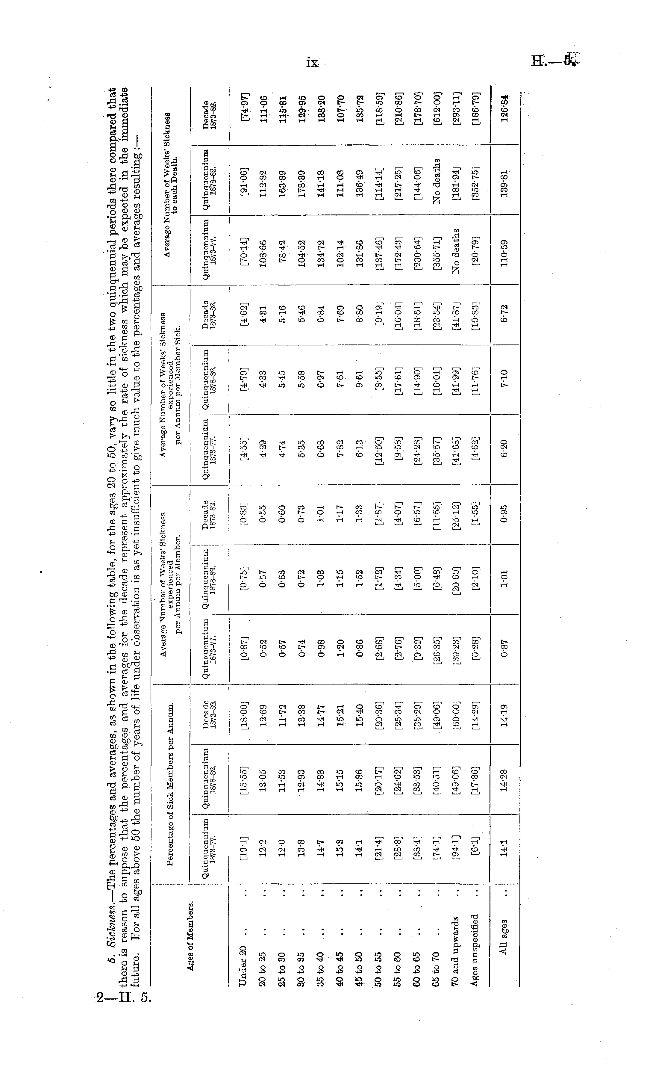 Percentage of Sick Members per Annum. Average Number of Weeks' Sickness experienced per Annum per Member. Average Number of Weeks' Sickness experienced per Annum per Member Sick. Average Number of Weeks' Sickness to each Death. Quinquennium 1873-77. Quinquennium 1878-82. Decade 1873-82. Quinquennium 1873-77. Quinquennium 1878-S2. Decade 1S73-S2. Quinquenniura 1873-77. Quinquennium 1S78-82. Decade 1873-82. Quinquennium 1873-77. Quinquennium 1878-82. Decade 1873-82. Under 20 .. [19-1] [15-55] [18-00] [0-87] [0-75] [0-83] [4-55] [4-79] [4-62] [70-14] [91-06] [74-97] 20 to 25 12-2 13-05 12-69 0-52 0-57 0-55 4-29 4-33 4-31 108-66 112-82 111-06 25 to 30 12-0 11-53 11-72 0-57 0-63 0-60 4-74 5-45 5-16 78-42 163-89 115-81 30 to 35 13-8 12-93 13-38 0-74 0-72 0-73 5-35 5-58 5-46 104-52 178-39 129-95 35 to 40 .. 14-7 14-83 14-77 0-98 1-03 1-01 6-68 6-97 6-84 134-72 141-18 138-20 40 to 45 15-3 15-15 15-21 1-20 1-15 1-17 7-82 7-61 7-69 102-14 111-08 107-70 45 to 50 14-1 15-86 15-40 0-86 1-52 1-33 6-13 9-61 8-80 131-86 136-49 135-72 50 to 55 [21-4] [20-17] [20-36] [2-68] [1-72] [1-87] [12-50] [8-55] [9-19] [137-46] [114-14] [118-59] 55 to 60 [28-8] [24-62] [25-34] [2-76] [4-34] [4-07] [9-58] [17-61] [16-04] [172-43] [217-25] [210-86] 60 to 65 [38-4] [33-53] [35-29] [9-32] [5-00] [6-57] [24-28] [14-90] [18-61] [230-64] [144-06] [178-70] 65 to 70 [74-1] [40-51] [49-06] [26-35] [6-48] [11-55] [35-57] [16-01] [23-54] [355-71] No deaths [612-00] 70 and upwards [94-1] [49-06] [60-00] [39-23] [20-60] [25-12] [41-68] [41-99] [41-87] No deaths [181-94] [293-11] Ages unspecified [6-1] [17-86] [14-29] [0-28] [2-10] [1-55] [4-62] [11-76] [10-83] [20-79] [352-75] [186-79] All ages 14-1 14-28 14-19 0-87 1-01 0-95 6-20 710 6-72 110-59 139-81 126-84