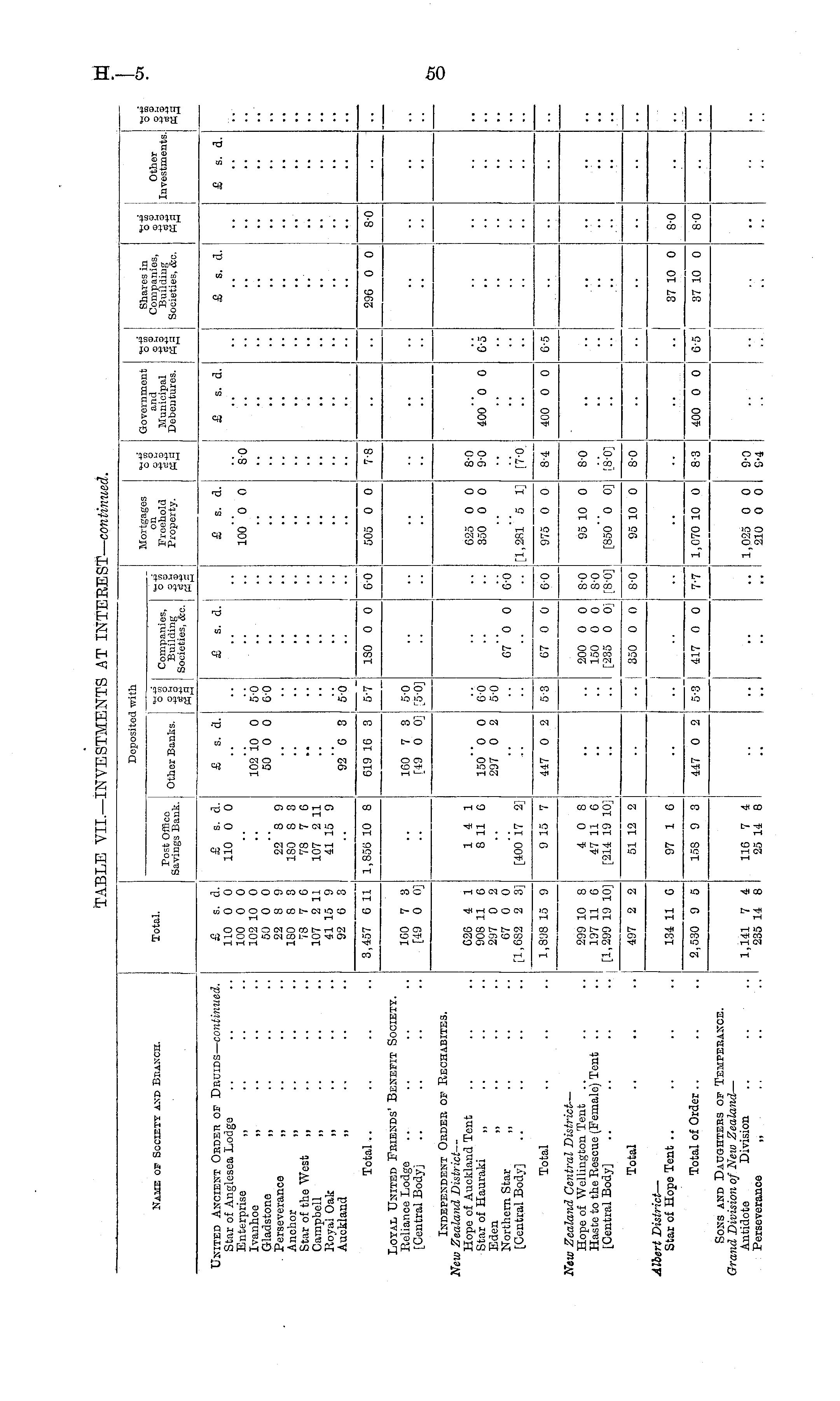 Name of Society and Branch. Total. Depositee with q_ 4_ © c. _! on Freehold Property. ih-« © «_ and Municipal Debentures. ©s «_ Shares in Companies, Building Societies, &c. t-l 43 ©g _a tw 43 Other o £ Investments, "g_g «_ Post Office Savings Bank. Other Banks. Companies, Building Societies, &c. United Ancient Order of Druids — continued. Star of Anglesea Lodge Enterprise ,, Ivanhoe ,, Gladstone „ . Perseverance ,, Anchor ,, Star of the West „ Campbell „ Royal Oak „ Auckland ,, £ s. d. 110 0 0 100 0 0 102 10 0 50 0 0 22 8 9 180 8 3 78 7 6 107 2 11 41 15 9 92 6 3 £ s. d. 110 0 0 22 8 9 180 8 3 78 7 6 107 2 11 41 15 9 £ s. a. 102 'io 0 50 0 0 5-6 6-0 £ s. d. •• '• - £ s. d. 100*0 0 80 £ s. d. £ s. d. " £ s. a. j .. 92'*6 3 5*0 .. ,, ... Total 3,457 0 11 1,856 10 8 180 0 0 | I 6-0 505 0 0 7-8 8-0 619 16 3 5-7 .. 296 0 0 •• •• •• Loyal United Friends' Benefit Society. Reliance Lodge [Central Body] I ! I [ 1G0 7 3 [49 0 0] 160 7 3 [49 0 0] 5-0 [5-0] •' [ •• ■• I i I I Independent Order of Rechabites. New Zealand District — Hope of Auckland Tent Star of Hauraki ,, Eden ,, Northern Star ,, [Central Body] 626 4 1 908 11 0 297 0 2 07 0 0 [1,682 2 3] 14 1 8 11 6 150**0 0 297 0 2 6*6 50 •• 625 0 0 350 0 0 8-0 9-0 400 "o 0 6-5 '' [400* i7 2] 07 "o 0 G-6 5-3 67 0 0 00 [1,2,31**5 1] [7-0 8-4 I 400 0 0 I I 6-5 •• Total 1,898 15 9 9 15 7 447 0 2 975 0 0 I -. New Zealand Central District — Hope of Wellington Tent Haste to the Rescue (Female) Tent [Central Body] 299 10 8 197 11 G [1,299 19 10] 4 0 8 47 11 6 [214 19 10] 200 0 0 150 0 0 [235 0 0] 8-0 8-0 [8-0] J 11 8-0 95 10 0 80 .. ! [850 "o 0] 95 10 0 [8*0] 8-0 I i ... ! Total I 497 2 2 51 12 2 350 0 0 •• Albert District — Star of Hope Tent 37 10 0 8-0 134 11 6 97 1 6 Total of Order 2,530 9 5 8-3 8-0 158 9 3 447 0 2 5-3 417 0 0 7-7 1,070 10 0 400 0 0 6-5 37 10 0 •■ Sons and Daughters of Temperance. Grand Division of New Zealand — Antidote Division Perseverance ,, 1,141 7 4 235 14 8 116 7 4 25 14 8 1,025 0 0 210 0 0 0-0 G-4