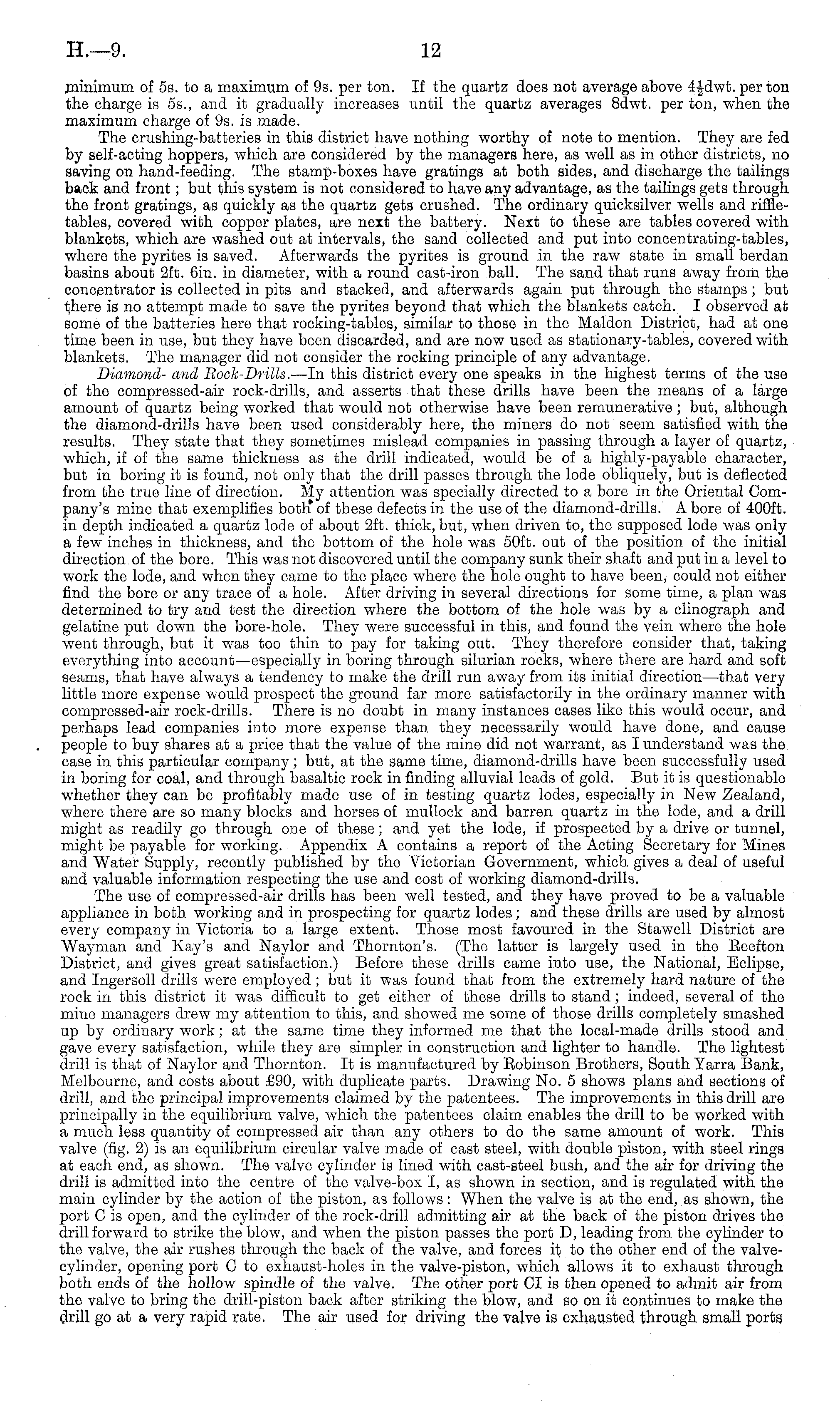 minimum of ss. to a maximum of 9s. per ton. If the quartz does not average above 4-|dwt. per ton the charge is 55., and it gradually increases until the quartz averages Bdwt. per ton, when the maximum charge of 9s. is made. The crushing-batteries in this district have nothing worthy of note to mention. They are fed by self-acting hoppers, which are considered by the managers here, as well as in other districts, no saving on hand-feeding. The stamp-boxes have gratings at both sides, and discharge the tailings back and front; but this system is not considered to have any advantage, as the tailings gets through the front gratings, as quickly as the quartz gets crushed. The ordinary quicksilver wells and riffletables, covered with copper plates, are next the battery. Next to these are tables covered with blankets, which are washed out at intervals, the sand collected and put into concentrating-tables, where the pyrites is saved. Afterwards the pyrites is ground in the raw state in small berdan basins about 2ft. 6in. in diameter, with a round cast-iron ball. The sand that runs away from the concentrator is collected in pits and stacked, and afterwards again put through the stamps; but tjhere is no attempt made to save the pyrites beyond that which the blankets catch. I observed at some of the batteries here that rocking-tables, similar to those in the Maldon District, had at one time been in use, but they have been discarded, and are now used as stationary-tables, covered with blankets. The manager did not consider the rocking principle of any advantage. Diamond,- and Bock-Drills. —ln this district every one speaks in the highest terms of the use of the compressed-air rock-drills, and asserts that these drills have been the means of a large amount of quartz being worked that would not otherwise have been remunerative ; but, although the diamond-drills have been used considerably here, the miners do not seem satisfied with the results. They state that they sometimes mislead companies in passing through a layer of quartz, which, if of the same thickness as the drill indicated, would be of a highly-payable character, but in boring it is found, not only that the drill passes through the lode obliquely, but is deflected from the true line of direction. My attention was specially directed to a bore in the Oriental Company's mine that exemplifies both* of these defects in the use of the diamond-drills. A bore of 400 ft. in depth indicated a quartz lode of about 2ft. thick, but, when driven to, the supposed lode was only a few inches in thickness, and the bottom of the hole was 50ft. out of the position of the initial direction of the bore. This was not discovered until the company sunk their shaft and put in a level to work the lode, and when they came to the place where the hole ought to have been, could not either find the bore or any trace of a hole. After driving in several directions for some time, a plan was determined to try and test the direction where the bottom of the hole was by a clinograph and gelatine put down the bore-hole. They were successful in this, and found the vein where the hole went through, but it was too thin to pay for taking out. They therefore consider that, taking everything into account —especially in boring through silurian rocks, where there are hard and soft seams, that have always a tendency to make the drill run away from its initial direction—that very little more expense would prospect the ground far more satisfactorily in the ordinary manner with compressed-air rock-drills. There is no doubt in many instances cases like this would occur, and perhaps lead companies into more expense than they necessarily would have done, and cause people to buy shares at a price that the value of the mine did not warrant, as I understand was the case in this particular company; but, at the same time, diamond-drills have been successfully used in boring for coal, and through basaltic rock in finding alluvial leads of gold. But it is questionable whether they can be profitably made use of in testing quartz lodes, especially in New Zealand, where there are so many blocks and horses of mullock and barren quartz in the lode, and a drill might as readily go through one of these; and yet the lode, if prospected by a drive or tunnel, might be payable for working. Appendix A contains a report of the Acting Secretary for Mines and Water Supply, recently published by the Victorian Government, which gives a deal of useful and valuable information respecting the use and cost of working diamond-drills. The use of compressed-air drills has been well tested, and they have proved to be a valuable appliance in both working and in prospecting for quartz lodes; and these drills are used by almost every company in Victoria to a large extent. Those most favoured in the Stawell District are Wayman and Kay's and Naylor and Thornton's. (The latter is largely used in the Eeefton District, and gives great satisfaction.) Before these drills came into use, the National, Eclipse, and Ingersoll drills were employed ; but it was found that from the extremely hard nature of the rock in this district it was difficult to get either of these drills to stand ; indeed, several of the mine managers drew my attention to this, and showed me some of those drills completely smashed up by ordinary work; at the same time they informed me that the local-made drills stood and gave every satisfaction, while they are simpler in construction and lighter to handle. The lightest drill is that of Naylor and Thornton. It is manufactured by Robinson Brothers, South Yarra Bank, Melbourne, and costs about £90, with duplicate parts. Drawing No. 5 shows plans and sections of drill, and the principal improvements claimed by the patentees. The improvements in this drill are principally in the equilibrium valve, which the patentees claim enables the drill to be worked with a much less quantity of compressed air than any others to do