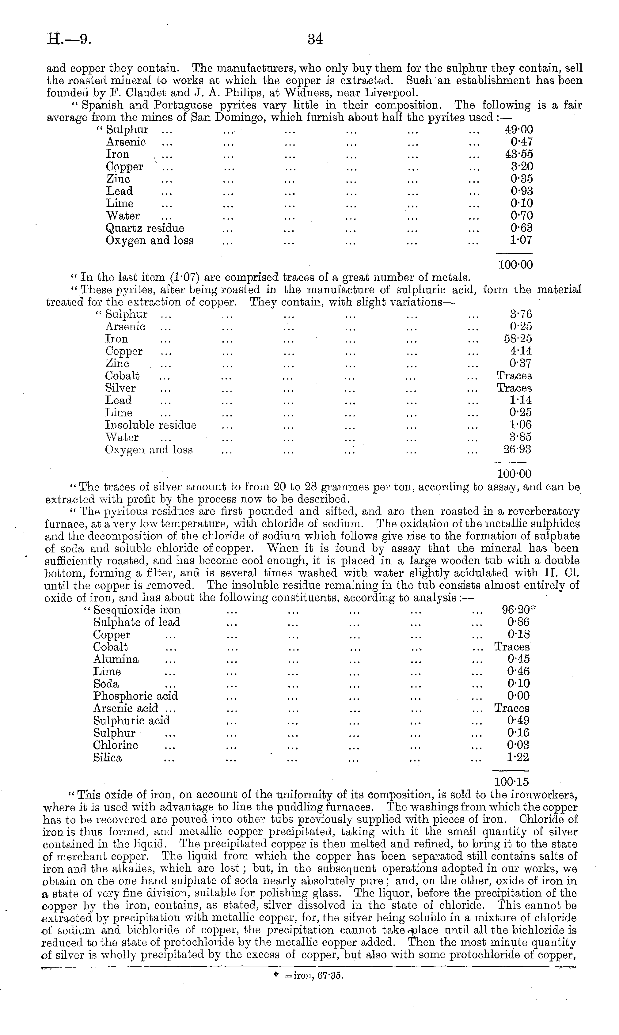 and copper they contain. The manufacturers, who only buy them for the sulphur they contain, sell the roasted mineral to works at which the copper is extracted. Such an establishment has been founded by F. Claudet and J. A. Philips, at Widness, near Liverpool. " Spanish and Portuguese pyrites vary little in their composition. The following is a fair average from the mines of San Domingo, which furnish about half the pyrites used : — "Sulphur ... ... ... ... ... ... 49-00 Arsenic ... ... ... ... ... ... 0-47 Iron ... ... ... ... ... ... 43-55 Copper ... ... ... ... ... ... 3-20 Zinc ... ... ... ... ... ... 0-35 Lead ... ... ... ... ... ... 0-93 Lime ... ... ... ... ... ... 0-10 Water ... ... ... ... ... ... 0-70 Quartz residue ... ... ... ... ... 0-63 Oxygen and loss ... ... ... ... ... l-07 100-00 " In the last item (1-07) are comprised traces of a great number of metals. "These pyrites, after being roasted in the manufacture of sulphuric acid, form the material treated for the extraction of copper. They contain, with slight variations— "Sulphur ... ... ... ... ... ... 3-76 Arsenic ... ... ... ... ... ... 0-25 Iron ... ... ... ... ... ... 58-25 Copper ... ... ... ... ... ... 4-14 Zinc ... ... ... ... ... ... 0-37 Cobalt ... ... ... ... ... ... Traces Silver ... ... ... ... ... ... Traces Lead ... ... ... ... ... ... 1-14 Lime ... ... ... ... ... ... 0-25 Insoluble residue ... ... ... ... ... 1-06 Water ... ... ... ... ... ... 3-85 Oxygen and loss ... ... ... ... ... 26-93 100-00 " The traces of silver amount to from 20 to 28 grammes per ton, according to assay, and can be extracted with profit by the process now to be described. " The pyritous residues are first pounded and sifted, and are then roasted in a reverberatory furnace, at a very low temperature, with chloride of sodium. The oxidation of the metallic sulphides and the decomposition of the chloride of sodium which follows give rise to the formation of sulphate of soda and soluble chloride of copper. When it is found by assay that the mineral has been sufficiently roasted, and has become cool enough, it is placed in a large wooden tub with a double bottom, forming a filter, and is several times washed with water slightly acidulated with H. 01. until the copper is removed. The insoluble residue remaining in the tub consists almost entirely of oxide of iron, and has about the following constituents, according to analysis :— " Sesquioxide iron ... ... ... ... ... 96-20* Sulphate of lead ... ... ... ... ... 0-86 Copper ... ... ... ... ... ... 0-18 Cobalt ... ... ... ... ... ... Traces Alumina ... ... ... ... ... ... 0-45 Lime ... ... ... ... ... ... 0-46 Soda ... ... ... ... ... ... 0-10 Phosphoric acid ... ... ... ... ... 0-00 Arsenic acid ... ... ... ... ... ... Traces Sulphuric acid ... ... ... ... ... 0-49 Sulphur- ... ... ... ... ... ... 0-16 Chlorine ... ... ... ... ... ... 0-03 Silica ... ... ... ... ... ... 1-22 100-15 " This oxide of iron, on account of the uniformity of its composition, is sold to the ironworkers, where it is used with advantage to line the puddling furnaces. The washings from which the copper has to be recovered are poured into other tubs previously supplied with pieces of iron. Chloride of iron is thus formed, and metallic copper precipitated, taking with it the small quantity of silver contained in the liquid. The precipitated copper is then melted and refined, to bring it to the state of merchant copper. The liquid from which the copper has been separated still contains salts of iron and the alkalies, which are lost; but, in the subsequent operations adopted in our works, we obtain on the one hand sulphate of soda nearly absolutely pure; and, on the other, oxide of iron in a state of very fine division, suitable for polishing glass. The liquor, before the precipitation of the copper by the iron, contains, as stated, silver dissolved in the state of chloride. This cannot be extracted by precipitation with metallic copper, for, the silver being soluble in a mixture of chloride of sodium and bichloride of copper, the precipitation cannot take place until all the bichloride is reduced to the state of protochloride by the metallic copper added. Then the most minute quantity of silver is wholly precipitated by the excess of copper, but also with some protochloride of copper,