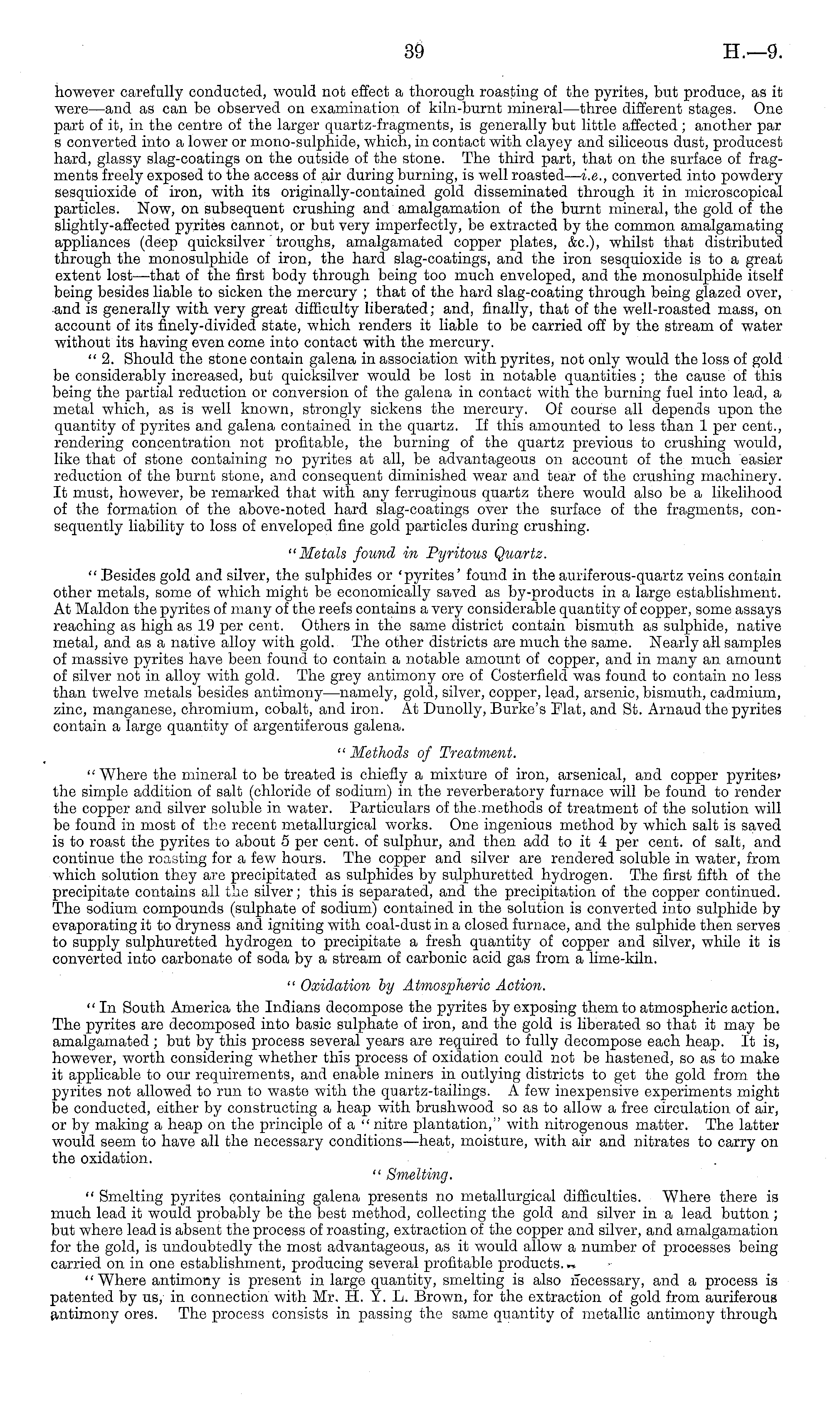 however carefully conducted, would not effect a thorough roasting of the pyrites, but produce, as it were —and as can be observed on examination of kiln-burnt mineral —three different stages. One part of it, in the centre of the larger quartz-fragments, is generally but little affected; another par S converted into a lower or mono-sulphide, which, in contact with clayey and siliceous dust, producest hard, glassy slag-coatings on the outside of the stone. The third part, that on the surface of fragments freely exposed to the access of air during burning, is well roasted— i.e., converted into powdery sesquioxide of iron, with its originally-contained gold disseminated through it in microscopical particles. Now, on subsequent crushing and amalgamation of the burnt mineral, the gold of the slightly-affected pyrites cannot, or but very imperfectly, be extracted by the common amalgamating appliances (deep quicksilver troughs, amalgamated copper plates, &c), whilst that distributed through the monosulphide of iron, the hard slag-coatings, and the iron sesquioxide is to a great extent lost—that of the first body through being too much enveloped, and the monosulphide itself being besides liable to sicken the mercury ; that of the hard slag-coating through being glazed over, ■and is generally with very great difficulty liberated; and, finally, that of the well-roasted mass, on account of its finely-divided state, which renders it liable to be carried off by the stream of water without its having even come into contact with the mercury. " 2. Should the stone contain galena in association with pyrites, not only would the loss of gold be considerably increased, but quicksilver would be lost in notable quantities ; the cause of this being the partial reduction or conversion of the galena in contact with the burning fuel into lead, a metal which, as is well known, strongly sickens the mercury. Of course all depends upon the quantity of pyrites and galena contained in the quartz. If this amounted to less than 1 per cent., rendering concentration not profitable, the burning of the quartz previous to crushing would, like that of stone containing no pyrites at all, be advantageous on account of the much easier reduction of the burnt stone, and consequent diminished wear and tear of the crushing machinery. It must, however, be remarked that with any ferruginous quartz there would also be a likelihood of the formation of the above-noted hard slag-coatings over the surface of the fragments, consequently liability to loss of enveloped fine gold particles during crushing. "Metals found in Pyritous Quarts. " Besides gold and silver, the sulphides or 'pyrites' found in the auriferous-quartz veins contain other metals, some of which might be economically saved as by-products in a large establishment. At Maldon the pyrites of many of the reefs contains a very considerable quantity of copper, some assays reaching as high as 19 per cent. Others in the same district contain bismuth as sulphide, native metal, and as a native alloy with gold. The other districts are much the same. Nearly all samples of massive pyrites have been found to contain a notable amount of copper, and in many an amount of silver not in alloy with gold. The grey antimony ore of Costerfield was found to contain no less than twelve metals besides antimony—namely, gold, silver, copper, lead, arsenic, bismuth, cadmium, zinc, manganese, chromium, cobalt, and iron. At Dunolly, Burkes Hat, and St. Arnaud the pyrites contain a large quantity of argentiferous galena. "Methods of Treatment. " Where the mineral to be treated is chiefly a mixture of iron, arsenical, and copper pyrites* the simple addition of salt (chloride of sodium) in the reverberatory furnace will be found to render the copper and silver soluble in water. Particulars of the methods of treatment of the solution will be found in most of the recent metallurgical works. One ingenious method by which salt is saved is to roast the pyrites to about 5 per cent, of sulphur, and then add to it 4 per cent, of salt, and continue the roasting for a few hours. The copper and silver are rendered soluble in water, from which solution they are precipitated as sulphides by sulphuretted hydrogen. The first fifth of the precipitate contains all the silver; this is separated, and the precipitation of the copper continued. The sodium compounds (sulphate of sodium) contained in the solution is converted into sulphide by evaporating it to dryness and igniting with coal-dust in a closed furnace, and the sulphide then serves to supply sulphuretted hydrogen to precipitate a fresh quantity of copper and silver, while it is converted into carbonate of soda by a stream of carbonic acid gas from a lime-kiln. " Oxidation by Atmospheric Action. "In South America the Indians decompose the pyrites by exposing them to atmospheric action. The pyrites are decomposed into basic sulphate of iron, and the gold is liberated so that it may be amalgamated; but by this process several years are required to fully decompose each heap. It is, however, worth considering whether this process of oxidation could not be hastened, so as to make it applicable to our requirements, and enable miners in outlying districts to get the gold from, the pyrites not allowed to run to waste with the quartz-tailings. A few inexpensive experiments might be conducted, either by constructing a heap with brushwood so as to allow a free circulation of air, or by making a heap on the principle of a " nitre plantation," with nitrogenous matter. The latter would seem to have all the necessary conditions—heat, moisture, with air and nitrates to carry on the oxidation. " Smelting. " Smelting pyrites containing galena presents no metallurgical difficulties. Where there is much lead it would probably be the best method, collecting the gold and silver in a lead button ; but where lead is absent the process of roasting, extraction of the copper and silve