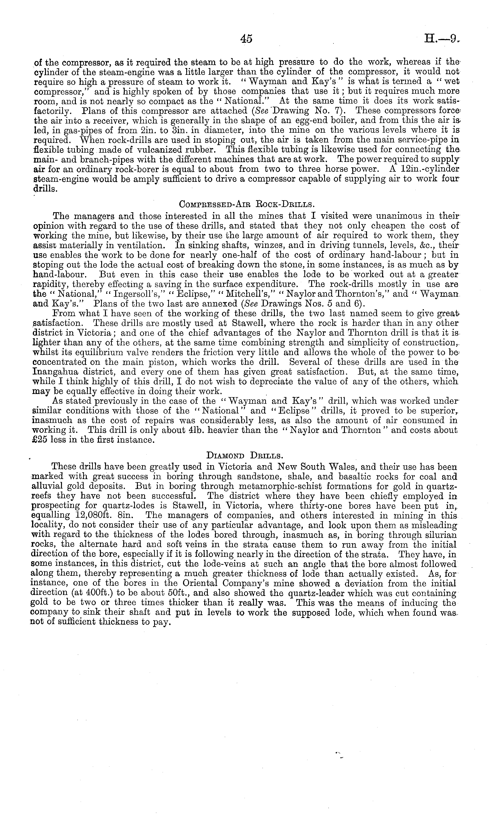 of the compressor, as it required the steam to be at high pressure to do the work, whereas if the cylinder of the steam-engine was a little larger than the cylinder of the compressor, it would not require so high a pressure of steam to work it. " Wayman and Kay's " is what is termed a " wet compressor," and is highly spoken of by those companies that use it; but it requires much more room, and is not nearly so compact as the " National." At the same time it does its work satisfactorily. Plans of this compressor are attached (See Drawing No. 7). These compressors force; the air into a receiver, which is generally in the shape of an egg-end boiler, and from this the air isled, in gas-pipes of from 2in. to 3in. in diameter, into the mine on the various levels where it is required. When rock-drills are used in stoping out, the air is taken from the main service-pipe in flexible tubing made of vulcanized rubber. This flexible tubing is likewise used for connecting the main- and branch-pipes with the different machines that are at work. The power required to supply air for an ordinary rock-borer is equal to about from two to three horse power. A 12in.-cylinder steam-engine would be amply sufficient to drive a compressor capable of supplying air to work fourdrills. COMPEBSSED-AlB BoCK-DbiLLS. The managers and those interested in all the mines that I visited were unanimous in their opinion with regard to the use of these drills, and stated that they not only cheapen the cost of working the mine, but likewise, by their use the large amount of air required to work them, they assist materially in ventilation. In sinking shafts, winzes, and in driving tunnels, levels, &c, their use enables the work to be done for nearly one-half of the cost of ordinary hand-labour; but in stoping out the lode the actual cost of breaking down the stone, in some instances, is as much as by hand-labour. But even in this case their use enables the lode to be worked out at a greater rapidity, thereby effecting a saving in the surface expenditure. The rock-drills mostly in use are the " National," " Ingersoll's," " Eclipse," " Mitchell's," " Naylor and Thornton's," and " Wayman and Kay's." Plans of the two last are annexed (See Drawings Nos. 5 and 6). From what I have seen of the working of these drills, the two last named seem to give great satisfaction. These drills are mostly used at Stawell, where the rock is harder than in any other district in Victoria; and one of the chief advantages of the Naylor and Thornton drill is that it is lighter than any of the others, at the same time combining strength and simplicity of construction,, whilst its equilibrium valve renders the friction very little and allows the whole of the power to beconcentrated on the main piston, which works the drill. Several of these drills are used in the Inangahua district, and every one of them has given great satisfaction. But, at the same time, while I think highly of this drill, I do not wish to depreciate the value of any of the others, which may be equally effective in doing their work. As stated previously in the case of the " Wayman and Kay's " drill, which was worked under similar conditions with those of the "National" and "Eclipse" drills, it proved to be superior, inasmuch as the cost of repairs was considerably less, as also the amount of air consumed in working it. This drill is only about 41b. heavier than the " Naylor and Thornton " and costs about. £25 less in the first instance. Diamond Drills. These drills have been greatly used in Victoria and New South Wales, and their use has been marked with great success in boring through sandstone, shale, and basaltic rocks for coal and alluvial gold deposits. But in boring through metamorphic-schist formations for gold in quartzreefs they have not been successful. The district where they have been chiefly employed in prospecting for quartz-lodes is Stawell, in Victoria, where thirty-one bores have been put in, equalling 12,080 ft. Bin. The managers of companies, and others interested in mining in this locality, do not consider their use of any particular advantage, and look upon them, as misleading ■with regard to the thickness of the lodes bored through, inasmuch as, in boring through silurian rocks, the alternate hard and soft veins in the strata cause them to run away from the initial direction of the bore, especially if it is following nearly in the direction of the strata. They have, in some instances, in this district, cut the lode-veins at such an angle that the bore almost followed along them, thereby representing a much greater thickness of lode than actually existed. As, for instance, one of the bores in the Oriental Company's mine showed a deviation from the initial direction (at 400 ft.) to be about 50ft., and also showed the quartz-leader which was cut containing gold to be two or three times thicker than it really was. This was the means of inducing the company to sink their shaft and put in levels to work the supposed lode, which when found wasnot of sufficient thickness to pay.