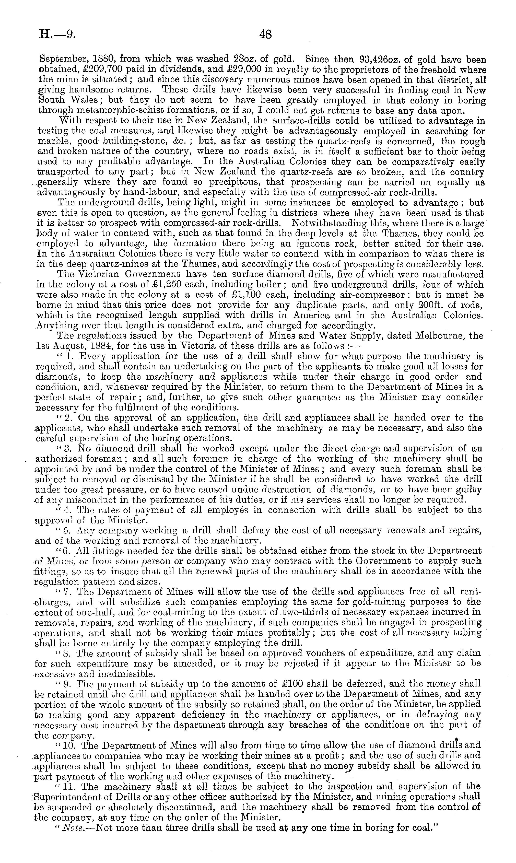 September, 1880, from which was washed 28oz. of gold. Since then 93,4260z. of gold have been obtained, £209,700 paid in dividends, and £29,000 in royalty to the proprietors of the freehold where the mine is situated; and since this discovery numerous mines have been opened in that district, all giving handsome returns. These drills have likewise been very successful in finding coal in New South Wales; but they do not seem to have been greatly employed in that colony in boring through metamorphic-schist formations, or if so, I could not get returns to base any data upon. With respect to their use in New Zealand, the surface-drills could be utilized to advantage in testing the coal measures, and likewise they might be advantageously employed in searching for marble, good building-stone, &c. ; but, as far as testing the quartz-reefs is concerned, the rough and broken nature of the country, where no roads exist, is in itself a sufficient bar to their being used to any profitable advantage. In the Australian Colonies they can be comparatively easily transported to any part; but in New Zealand the quartz-reefs are so broken, and the country . generally where they are found so precipitous, that prospecting can be carried on equally as advantageously by hand-labour, and especially with the use of compressed-air rock-drills. The underground drills, being light, might in some instances be employed to advantage ; but even this is open to question, as the general feeling in districts where they have been used is that it is better to prospect with compressed-air rock-drills. Notwithstanding this, where there is a large body of water to contend with, such as that found in the deep levels at the Thames, they could be employed to advantage, the formation there being an igneous rock, better suited, for their use. In the Australian Colonies there is very little water to contend with in comparison to what there is in the deep quartz-mines at the Thames, and accordingly the cost of prospecting is considerably less. The Victorian Government have ten surface diamond drills, five of which were manufactured in the colony at a cost of £1,250 each, including boiler ; and five underground drills, four of which were also made in the colony at a cost of £1,100 each, including air-compressor : but it must be borne in mind that this price does not provide for any duplicate parts, and only 200 ft. of rods, which is the recognized length supplied with drills in America and in the Australian Colonies. Anything over that length is considered extra, and charged for accordingly. The regulations issued by the Department of Mines and Water Supply, dated Melbourne, the Ist August, 1884, for the use in Victoria of these drills are as follows : — "1. Every application for the use of a drill shall show for what purpose the machinery is required, and shall contain an undertaking on the part of the applicants to make good all losses for diamonds, to keep the machinery and appliances while under their charge in good order and condition, and, whenever required by the Minister, to return them to the Department of Mines in a perfect state of repair ; and, further, to give such other guarantee as the Minister may consider necessary for the fulfilment of the conditions. " 2. On the approval of an application, the drill and appliances shall be handed over to the applicants, who shall undertake such removal of the machinery as may be necessary, and also the careful supervision of the boring operations. "3. No diamond drill shall be worked except under the direct charge and supervision of an authorized foreman; and all such foremen in charge of the working of the machinery shall be appointed by and be under the control of the Minister of Mines ; and every such foreman shall be subject to removal or dismissal by the Minister if he shall be considered to have worked the drill under too great pressure, or to have caused undue destruction of diamonds, or to have been guilty of any misconduct in the performance of his duties, or if his services shall no longer be required. " 4. The rates of payment of all employes in connection with drills shall be subject to the approval of the Minister. " 5. Any company working a drill shall defray the cost of all necessary renewals and repairs, and of the working and removal of the machinery. "6. All fittings needed for the drills shall be obtained either from the stock in the Department ■of Mines, or from some person or company who may contract with the Government to supply such fittings, so as to insure that all the renewed parts of the machinery shall be in accordance with the regulation pattern and sizes. "7. The Department of Mines will allow the use of the drills and appliances free of all rentcharges, and will subsidize such companies employing the same for gold-mining purposes to the extent of one-half, and for coal-mining to the extent of two-thirds of necessary expenses incurred in removals, repairs, and working of the machinery, if such companies shall be engaged in prospecting operations, and shall not be working their mines profitably; but the cost of all necessary tubing shall be borne entirely by the company employing the drill. "8. The amount of subsidy shall be based on approved vouchers of expenditure, and any claim for such expenditure may be amended, or it may be rejected if it appear to the Minister to be excessive and inadmissible. " 9. The payment of subsidy up to the amount of £100 shall be deferred, and the money shall be retained until the drill and appliances shall be handed over to the Department of Mines, and any portion of the whole amount of the subsidy so retained shall, on the order of the Minister, be applied. to making good any apparent deficiency in the machinery or appliances, or in defraying any necessary cost incurred by the department through any breaches of the conditions on the part of the company. " 10. The Department of Mines will also from time to time all