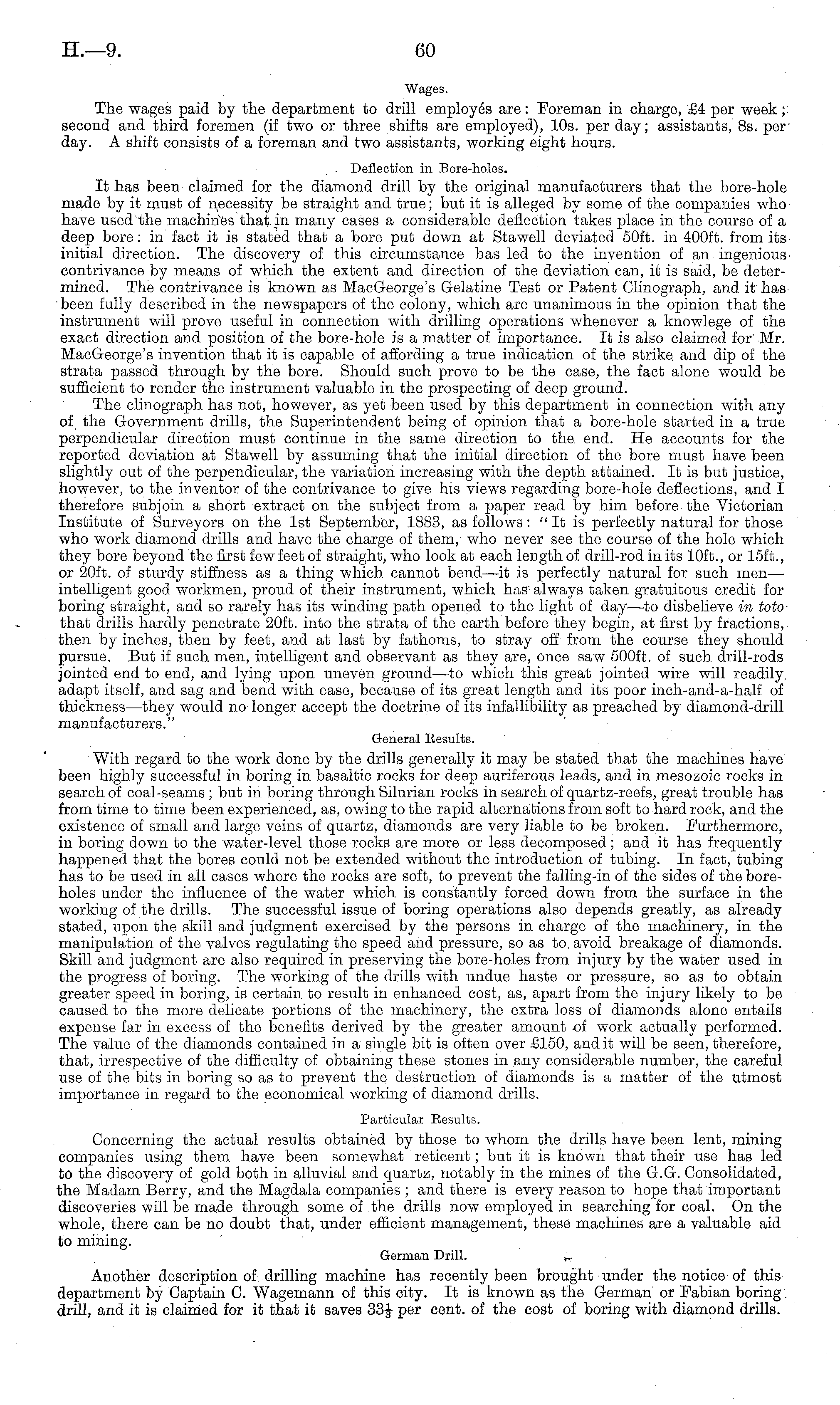 Wages. The wages paid by the department to drill employes are: Foreman in charge, £4 per week; second and third foremen (if two or three shifts are employed), 10s. per day; assistants, Bs. per day. A shift consists of a foreman and two assistants, working eight hours. Deflection in Bore-holes. It has been claimed for the diamond drill by the original manufacturers that the bore-hole made by it must of necessity be straight and true; but it is alleged by some of the companies who have used the machines that in many cases a considerable deflection takes place in the course of a deep bore: in fact it is stated that a bore put down at Stawell deviated 50ft. in 400 ft. from its initial direction. The discovery of this circumstance has led to the invention of an ingenious contrivance by means of which the extent and direction of the deviation can, it is said, be determined. The contrivance is known as Mac George's Gelatine Test or Patent Clinograph, and it has been fully described in the newspapers of the colony, which are unanimous in the opinion that the instrument will prove useful in connection with drilling operations whenever a knowlege of the exact direction and position of the bore-hole is a matter of importance. It is also claimed for' Mr. Mac George's invention that it is capable of affording a true indication of the strike, and dip of the strata passed through by the bore. Should such prove to be the case, the fact alone would be sufficient to render the instrument valuable in the prospecting of deep ground. The clinograph has not, however, as yet been used by this department in connection with any of the Government drills, the Superintendent being of opinion that a bore-hole started in a true perpendicular direction must continue in the same direction to the end. He accounts for the reported deviation at Stawell by assuming that the initial direction of the bore must have been slightly out of the perpendicular, the variation increasing with the depth attained. It is but justice, however, to the inventor of the contrivance to give his views regarding bore-hole deflections, and I therefore subjoin a short extract on the subject from a paper read by him before the Victorian Institute of Surveyors on the Ist September, 1883, as follows: "It is perfectly natural for those who work diamond drills and have the charge of them, who never see the course of the hole which they bore beyond the first few feet of straight, who look at each length of drill-rod in its 10ft., or loft., or 20ft. of sturdy stiffness as a thing which cannot bend—it is perfectly natural for such men— intelligent good workmen, proud of their instrument, which has always taken gratuitous credit for boring straight, and so rarely has its winding path opened to the light of day—to disbelieve in toto that drills hardly penetrate 20ft. into the strata of the earth before they begin, at first by fractions, then by inches, then by feet, and at last by fathoms, to stray off from the course they should pursue. But if such men, intelligent and observant as they are, once saw 500 ft. of such drill-rods jointed end to end, and lying upon uneven ground—to which this great jointed wire will readily adapt itself, and sag and bend with ease, because of its great length and its poor inch-and-a-half of thickness—they would no longer accept the doctrine of its infallibility as preached by diamond-drill manufacturers." General Results. With regard to the work done by the drills generally it may be stated that the machines have been highly successful in boring in basaltic rocks for deep auriferous leads, and in mesozoic rocks in search of coal-seams ; but in boring through Silurian rocks in search of quartz-reefs, great trouble has from time to time been experienced, as, owing to the rapid alternations from soft to hard rock, and the existence of small and large veins of quartz, diamonds are very liable to be broken. Furthermore, in boring down to the water-level those rocks are more or less decomposed; and it has frequently happened that the bores could not be extended without the introduction of tubing. In fact, tubing has to be used in all cases where the rocks are soft, to prevent the falling-in of the sides of the boreholes under the influence of the water which is constantly forced down from, the surface in the working of the drills. The successful issue of boring operations also depends greatly, as already stated, upon the skill and judgment exercised by the persons in charge of the machinery, in the manipulation of the valves regulating the speed and pressure, so as to avoid breakage of diamonds. Skill and judgment are also required in preserving the bore-holes from injury by the water used in the progress of boring. The working of the drills with undue haste or pressure, so as to obtain greater speed in boring, is certain to result in enhanced cost, as, apart from the injury likely to be caused to the more delicate portions of the machinery, the extra loss of diamonds alone entails expense far in excess of the benefits derived by the greater amount of work actually performed. The value of the diamonds contained in a single bit is often over £150, and it will be seen, therefore, that, irrespective of the difficulty of obtaining these stones in any considerable number, the careful use of the bits in boring so as to prevent the destruction of diamonds is a matter of the utmost importance in regard to the economical working of diamond drills. Particular Results. Concerning the actual results obtained by those to whom the drills have been lent, mining companies using them have been somewhat reticent; but it is known that their use has led to the discovery of gold both in alluvial and quartz, notably in the mines of the G.G. Consolidated, the Madam Berry, and the Magdala companies ; and there is every reason to hope that important discoveries will be made through some of the drills now employed in searching for coal. On the w