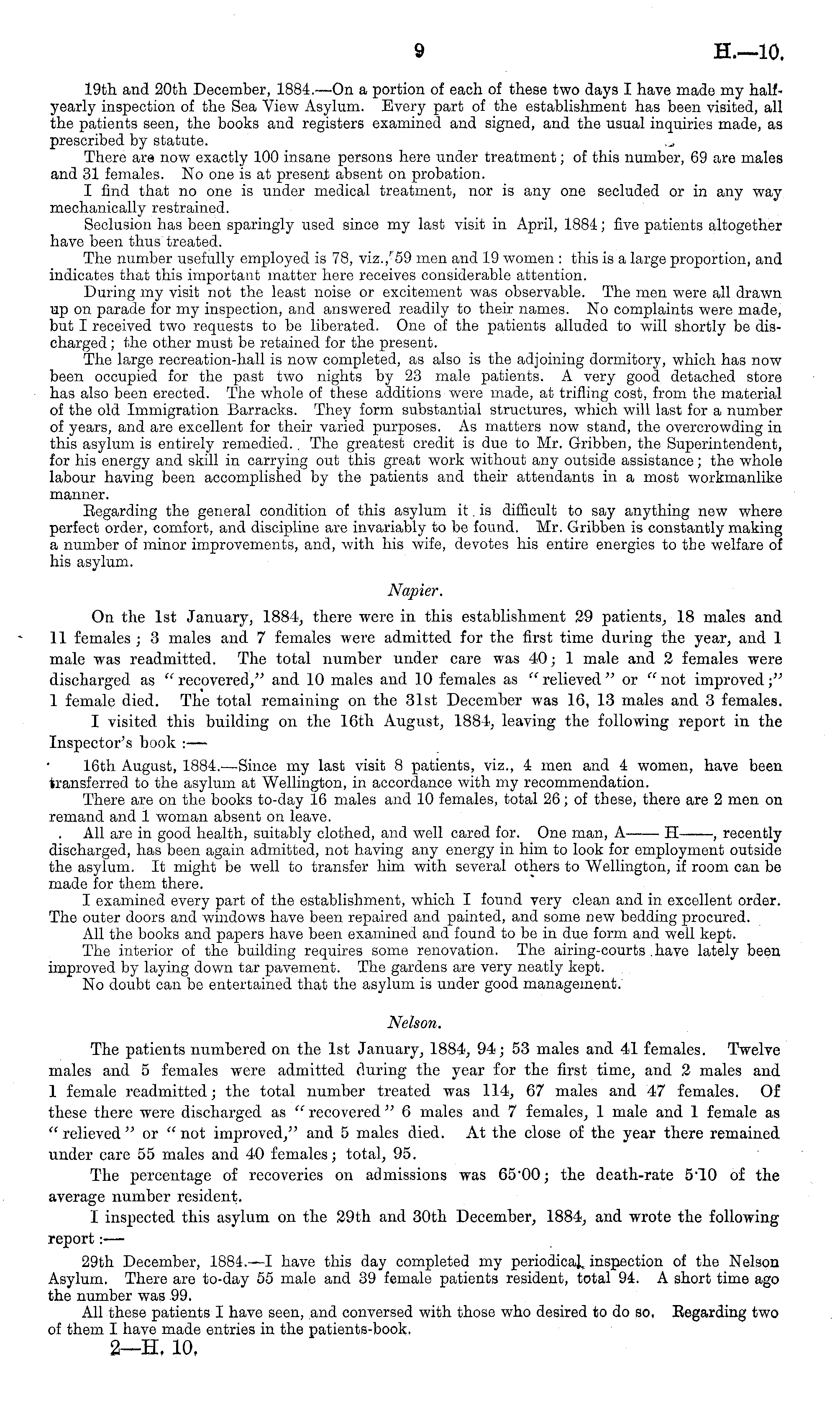 19th and 20th December, 1884. —On a portion of each of these two days I have made my halfyearly inspection of the Sea View Asylum. Every part of the establishment has been visited, all the patients seen, the books and registers examined and signed, and the usual inquiries made, as prescribed by statute. There are now exactly 100 insane persons here under treatment; of this number, 69 are males and 31 females. No one is at present absent on probation. I find that no one is under medical treatment, nor is any one secluded or in any way mechanically restrained. Seclusion has been sparingly used since my last visit in April, 1884; five patients altogether have been thus treated. The number usefully employed is 78, viz., r59 men and 19 women : this is a large proportion, and indicates that this important matter here receives considerable attention. During my visit not the least noise or excitement was observable. The men were all drawn up on parade for my inspection, and answered readily to their names. No complaints were made, but I received two requests to be liberated. One of the patients alluded to will shortly be discharged ; the other must be retained for the present. The large recreation-hall is now completed, as also is the adjoining dormitory, which has now been occupied for the past two nights by 23 male patients. A very good, detached store has also been erected. The whole of these additions were made, at trifling cost, from the material of the old Immigration Barracks. They form substantial structures, which will last for a number of years, and are excellent for their varied purposes. As matters now stand, the overcrowding in this asylum is entirely remedied., The greatest credit is due to Mr. Gribben, the Superintendent, for his energy and skill in carrying out this great work without any outside assistance; the whole labour having been accomplished by the patients and their attendants in a most workmanlike manner. Regarding the general condition of this asylum it. is difficult to say anything new where perfect order, comfort, and discipline are invariably to be found. Mr. Gribben is constantly making a number of minor improvements, and, with his wife, devotes his entire energies to the welfare of his asylum. Napier. On the Ist January, 1884, there were in this establishment 29 patients, 18 males and 11 females ; 3 males and 7 females were admitted for the first time during the year, and 1 male was readmitted. The total number under care was 40; 1 male and 2 females were discharged as " recovered," and 10 males and 10 females as " relieved " or " not improved;" 1 female died. The total remaining on the 31st December was 16, 13 males and 3 females. I visited this building on the 16th August, 1884, leaving the following report in the Inspector's book : — 16th August, 1884.—Since my last visit 8 patients, viz., 4 men and 4 women, have been transferred to the asylum at Wellington, in accordance with my recommendation. There are on the books to-day 16 males and 10 females, total 26; of these, there are 2 men on remand and 1 woman absent on leave. All are in good health, suitably clothed, and well cared for. One man, A H , recently discharged, has been again admitted, not having any energy in him to look for employment outside the asylum. It might be well to transfer him with several others to Wellington, if room can be made for them there. I examined every part of the establishment, which I found very clean and in excellent order. The outer doors and windows have been repaired and painted, and some new bedding procured. All the books and papers have been examined and found to be in due form and well kept. The interior of the building requires some renovation. The airing-courts have lately been improved by laying down tar pavement. The gardens are very neatly kept. No doubt can be entertained that the asylum is under good management. Nelson. The patients numbered on the Ist January, 1884, 94; 53 males and 41 females. Twelve males and 5 females were admitted during the year for the first time, and 2 males and 1 female readmitted; the total number treated was 114, 67 males and 47 females. Of these there were discharged as " recovered" 6 males and 7 females, 1 male and 1 female as " relieved "or " not improved," and 5 males died. At the close of the year there remained under care 55 males and 40 females; total, 95. The percentage of recoveries on admissions was 65"00; the death-rate 5"10 of the average number resident. I inspected this asylum on the 29th and 30th December, 1884, and wrote the following report: — 29th December, 1884. —I have this day completed my periodical inspection of the Nelson Asylum. There are to-day 55 male and 39 female patients resident, total 94. A short time ago the number was 99. All these patients I have seen, and conversed with those who desired to do so, Regarding two of them I have made entries in the patients-book. 2—H. 10,