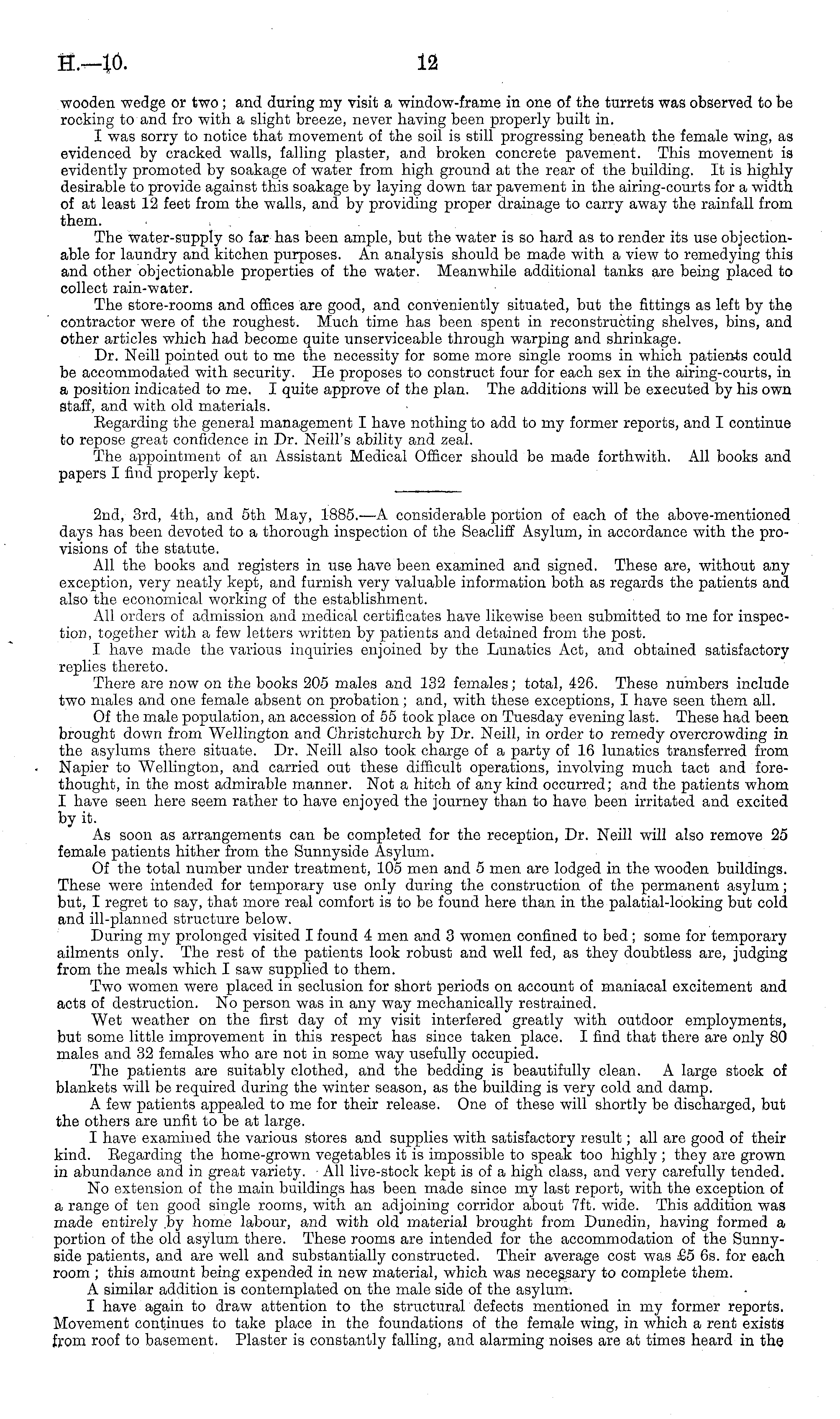 2nd, 3rd, 4th, and sth May, 1885.—A considerable portion of each of the above-mentioned days has been devoted to a thorough inspection of the Seacliff Asylum, in accordance with the provisions of the statute. All the books and registers in use have been examined and signed. These are, without any exception, very neatly kept, and furnish very valuable information both as regards the patients and also the economical working of the establishment. All orders of admission and medical certificates have likewise been submitted to me for inspection, together with a few letters written by patients and detained from the post. I have made the various inquiries enjoined by the Lunatics Act, and obtained satisfactory replies thereto. There are now on the books 205 males and 132 females; total, 426. These numbers include two males and one female absent on probation; and, with these exceptions, I have seen them all. Of the male population, an accession of 55 took place on Tuesday evening last. These had been brought down from Wellington and Christchurch by Dr. Neill, in order to remedy overcrowding in the asylums there situate. Dr. Neill also took charge of a party of 16 lunatics transferred from Napier to Wellington, and carried out these difficult operations, involving much tact and forethought, in the most admirable manner. Not a hitch of any kind occurred; and the patients whom I have seen here seem rather to have enjoyed the journey than to have been irritated and excited by it. As soon as arrangements can be completed for the reception, Dr. Neill will also remove 25 female patients hither from the Sunnyside Asylum. Of the total number under treatment, 105 men and 5 men are lodged in the wooden buildings. These were intended for temporary use only during the construction of the permanent asylum; but, I regret to say, that more real comfort is to be found here than in the palatial-looking but cold and ill-planned structure below. During my prolonged visited I found 4 men and 3 women confined to bed; some for temporary ailments only. The rest of the patients look robust and well fed, as they doubtless are, judging from the meals which I saw supplied to them. Two women were placed in seclusion for short periods on account of maniacal excitement and acts of destruction. No person was in any way mechanically restrained. Wet weather on the first day of my visit interfered greatly with outdoor employments, but some little improvement in this respect has since taken place. I find that there are only 80 males and 32 females who are not in some way usefully occupied. The patients are suitably clothed, and the bedding is beautifully clean. A large stock of blankets will be required during the winter season, as the building is very cold and damp. A few patients appealed to me for their release. One of these will shortly be discharged, but the others are unfit to be at large. I have examined the various stores and supplies with satisfactory result; all are good of their kind. Eegarding the home-grown vegetables it is impossible to speak too highly ; they are grown in abundance and in great variety. All live-stock kept is of a high class, and very carefully tended. No extension of the main buildings has been made since my last report, with the exception of a range of ten good single rooms, with an adjoining corridor about 7ft. wide. This addition was made entirely .by home labour, and with old material brought from Dunedin, having formed a portion of the old asylum there. These rooms are intended for the accommodation of the Sunnyside patients, and are well and substantially constructed. Their average cost was £5 6s. for each room ; this amount being expended in new material, which was necessary to complete them. A similar addition is contemplated on the male side of the asylum. I have again to draw attention to the structural defects mentioned in my former reports. Movement continues to take place in the foundations of the female wing, in which a rent exists from roof to basement. Plaster is constantly falling, and alarming noises are at times heard in the