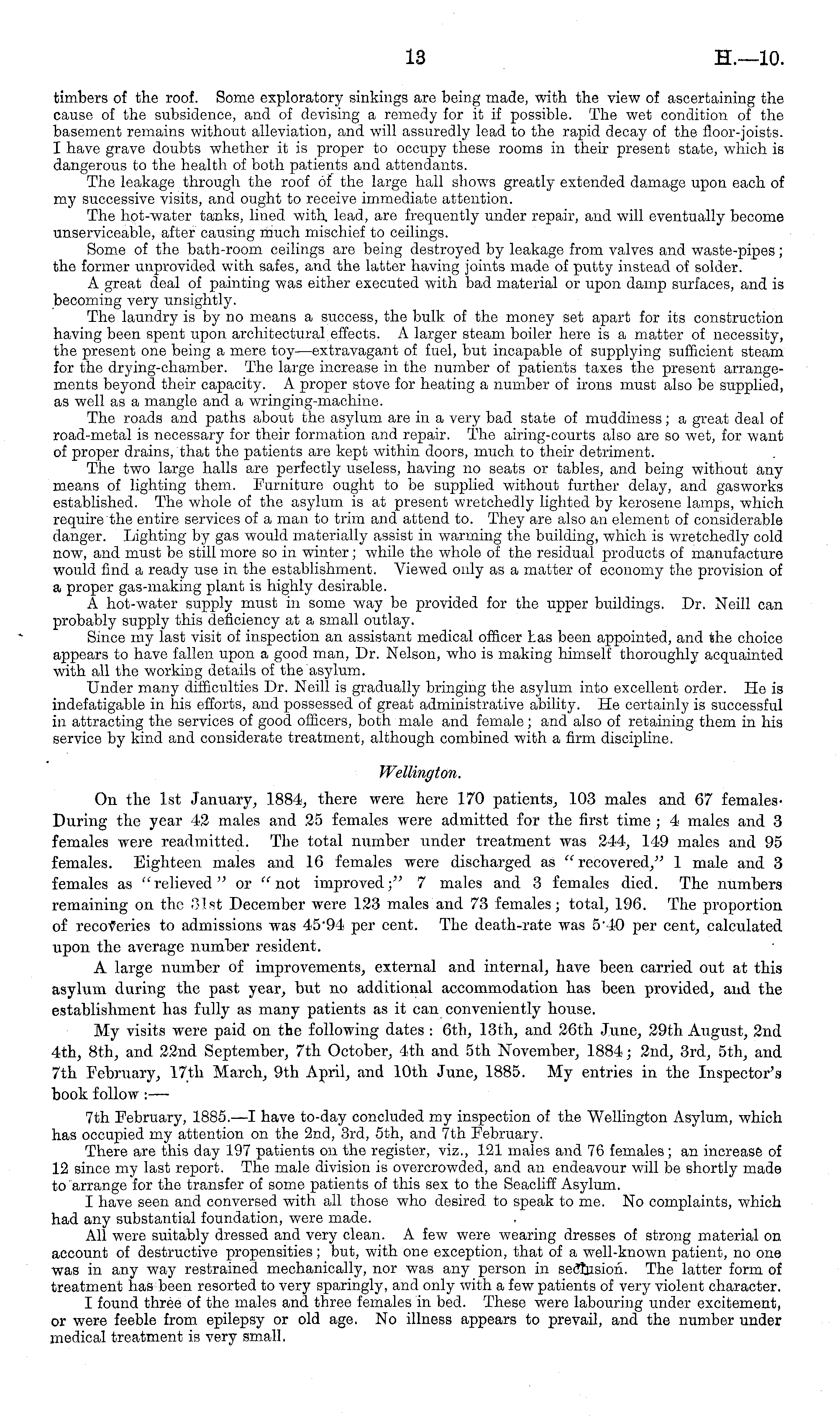 timbers of the roof. Some exploratory sinkings are being made, with the view of ascertaining the cause of the subsidence, and of devising a remedy for it if possible. The wet condition of the basement remains without alleviation, and will assuredly lead to the rapid decay of the floor-joists. I have grave doubts whether it is proper to occupy these rooms in their present state, which is dangerous to the health of both patients and attendants. The leakage through the roof of the large hall shows greatly extended damage upon each of my successive visits, and ought to receive immediate attention. The hot-water tanks, lined with, lead, are frequently under repair, and will eventually become unserviceable, after causing much mischief to ceilings. Some of the bath-room ceilings are being destroyed by leakage from valves and waste-pipes; the former unprovided with safes, and the latter having joints made of putty instead of solder. A great deal of painting was either executed with bad material or upon damp surfaces, and is becoming very unsightly. The laundry is by no means a success, the bulk of the money set apart for its construction having been spent upon architectural effects. A larger steam boiler here is a matter of necessity, the present one being a mere toy—extravagant of fuel, but incapable of supplying sufficient steam for the drying-chamber. The large increase in the number of patients taxes the present arrangements beyond their capacity. A proper stove for heating a number of irons must also be supplied, as well as a mangle and a wringing-machine. The roads and paths about the asylum are in a very bad state of muddiness; a great deal of road-metal is necessary for their formation and repair. The airing-courts also are so wet, for want of proper drains, that the patients are kept within doors, much to their detriment. The two large halls are perfectly useless, having no seats or tables, and being without any means of lighting them. Furniture ought to be supplied without further delay, and gasworks established. The whole of the asylum is at present wretchedly lighted by kerosene lamps, which require the entire services of a man to trim and attend to. They are also an element of considerable danger. Lighting by gas would materially assist in warming the building, which is wretchedly cold now, and must be still more so in winter; while the whole of the residual products of manufacture would find a ready use in the establishment. Viewed only as a matter of economy the provision of a proper gas-making plant is highly desirable. A hot-water supply must in some way be provided for the upper buildings. Dr. Neill can probably supply this deficiency at a small outlay. Since my last visit of inspection an assistant medical officer has been appointed, and the choice appears to have fallen upon a good man, Dr. Nelson, who is making himself thoroughly acqiiainted with all the working details of the asylum. Under many difficulties Dr. Neill is gradually bringing the asylum into excellent order. He is indefatigable in his efforts, and possessed of great administrative ability. He certainly is successful in attracting the services of good officers, both male and female ; and also of retaining them in his service by kind and considerate treatment, although combined with a firm discipline. Wellington. On the Ist January, 1884, there were here 170 patients, 103 males and 67 femalesDuring the year 42 males and 25 females were admitted for the first time ; 4 males and 3 females were readmitted. The total number under treatment was 244, 149 males and 95 females. Eighteen males and 16 females were discharged as "recovered," 1 male and 3 females as "relieved" or "not improved;" 7 males and 3 females died. The numbers remaining on the .31 st December were 123 males and 73 females; total, 196. The proportion of recoveries to admissions was 45"94 per cent. The death-rate was 540 per cent, calculated upon the average number resident. A large number of improvements, external and internal, have been carried out at this asylum during the past year, but no additional accommodation has been provided, and the establishment has fully as many patients as it can conveniently house. My visits were paid on the following dates : 6th, 13th, and 26th June, 29th August, 2nd 4th, Bth, and 22nd September, 7th October, 4th and sth November, 1884; 2nd, 3rd, sth, and 7th February, 17th March, 9th April, and 10th June, 1885. My entries in the Inspector's book follow : — 7th February, 1885. —I have to-day concluded my inspection of the Wellington Asylum, which has occupied my attention on the 2nd, 3rd, sth, and 7th February. There are this day 197 patients on the register, viz., 121 males and 76 females; an increase of 12 since my last report. The male division is overcrowded, and an endeavour will be shortly made to arrange for the transfer of some patients of this sex to the Seacliff Asylum. I have seen and conversed with all those who desired to speak to me. No complaints, which had any substantial foundation, were made. All were suitably dressed and very clean. A few were wearing dresses of strong material on account of destructive propensities; but, with one exception, that of a well-known patient, no one was in any way restrained mechanically, nor was any person in seclusion. The latter form of treatment has been resorted to very sparingly, and only with a few patients of very violent character. I found three of the males and three females in bed. These were labouring under excitement, or were feeble from epilepsy or old age. No illness appears to prevail, and the number under medical treatment is very small.