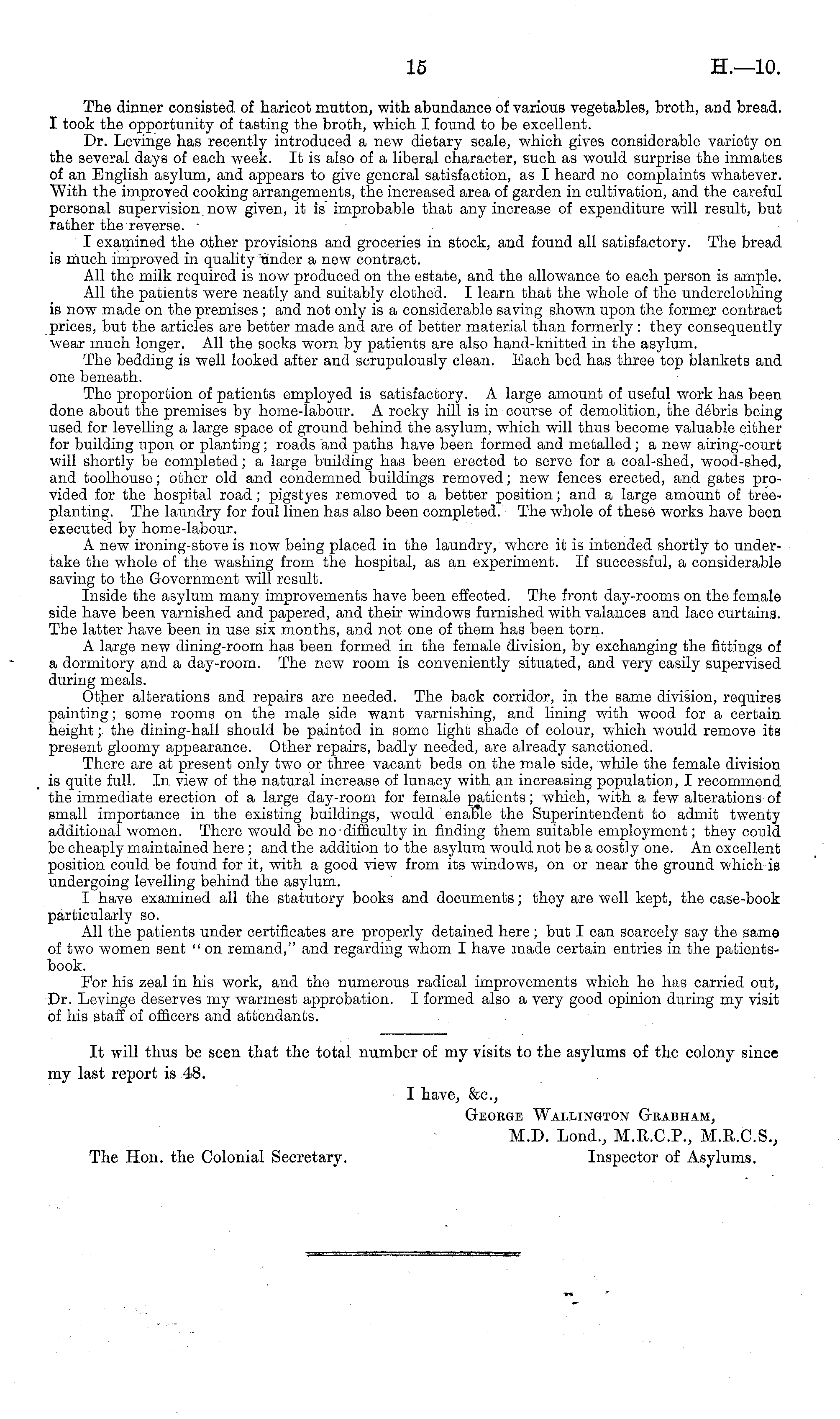 It will thus be seen that the total number of my visits to the asylums of the colony since my last report is 48. I have, Bee, George Wallington Grabham, M.D. Land.., M.R.C.P., M.R.C.S., The Hon. the Colonial Secretary. Inspector of Asylums,