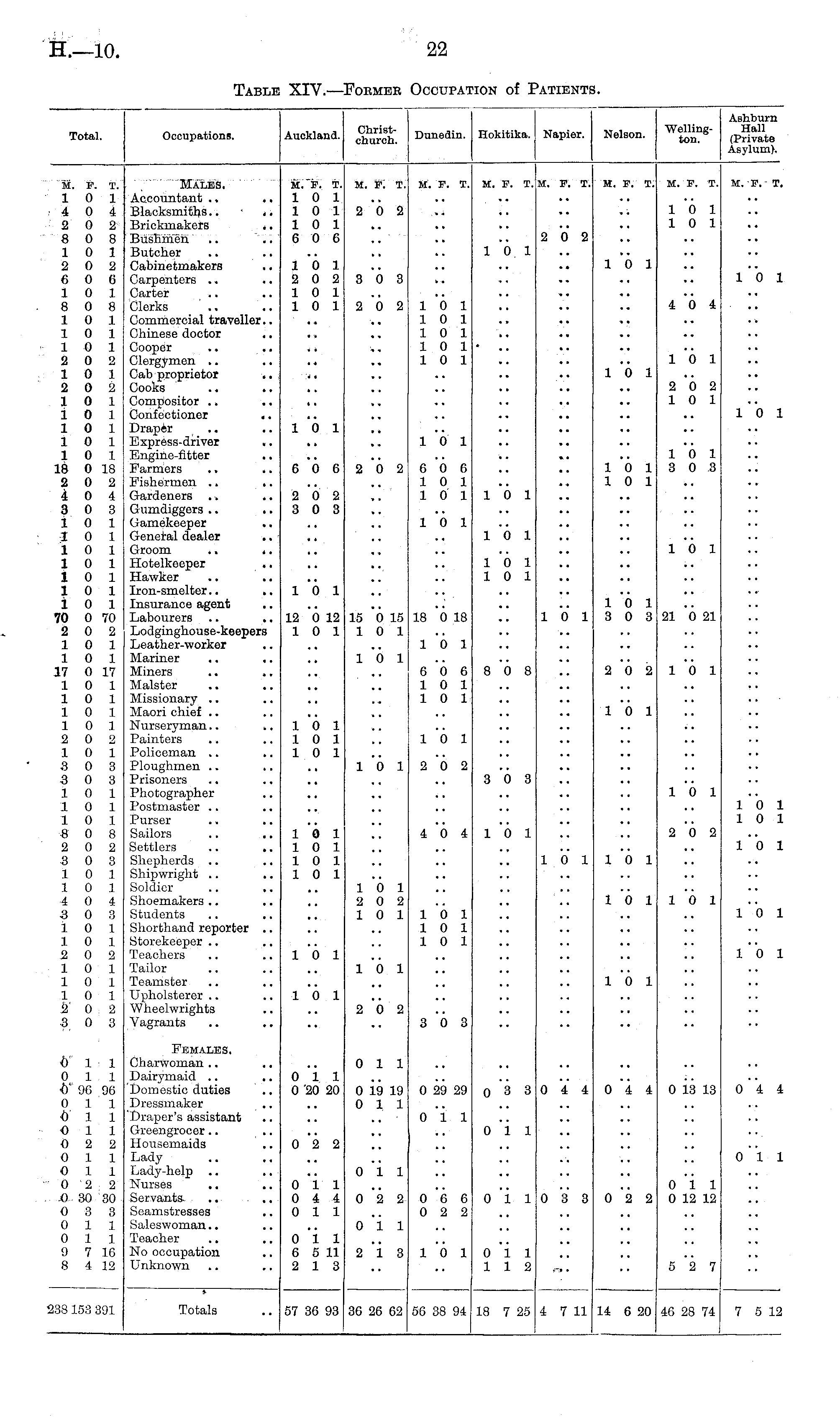Total. Occupations. Auckland. ?£™£ Dunedin. Hokltika. Napier. Nelson. Wellington. Ashburn Hall (Private Asylum). M. F. T. 10 1 4 0 4 2 0 2 8 0 8 10 1 2 0 2 6 0 6 10 1 8 0 8 10 1 10 1 10 1 2 0 2 10 1 2 0 2 10 1 10 1 10 1 10 1 10 1 18 0 18 2 0 2 4 0 4 3 0 3 10 1 10 1 10 1 10 1 10 1 10 1 10 1 70 0 70 2 0 2 10 1 10 1 17 0 17 10 1 10 1 10 1 10 1 2 0 2 10 1 5 0 3 3 0 3 10 1 10 1 10 1 8 0 8 2 0 2 3 0 S 10 1 10 1 4 0 4 5 0 8 10 1 10 1 2 0 2 10 1 10 1 10 1 2 0 2 3 0 3 Males. Accountant .. .. Blacksmiths.. .. Brickniakere .. Bushmen Butcher Cabinetmakers Carpenters Carter Clerks Commercial traveller.. Chinese doctor .. Cooper Clergymen Cab proprietor .. Cooks .. .. Compositor Confectioner ■. Draper Express-driver Engine-fitter .. Farmers Fishermen Gardeners .. .. Gumdiggers Gamekeeper General dealer .. Groom .. .. Hotelkeeper Hawker Iron-smelter.. .. Insurance agent Labourers .. .. Lodginghouse-keepers Leather-worker Mariner .. .. Miners .. .. Malster Missionary ., Maori chief Nurseryman Painters Policeman Ploughmen Prisoners Photographer Postmaster Purser Sailors Settlers .. .. Shepherds Shipwright Soldier Shoemakers .. .. Students Shorthand reporter .. Storekeeper Teachers Tailor Teamster Upholsterer Wheelwrights Vagrants M. F. T. 10 1 10 1 10 1 6 0 6 M. P. T. M. F. T. M. F. T. M. F. 1. M. P. T. M. F. T. M. F. ■ ! T, T. 2 '6 2 i '6 i 10 1 2 0 2 10 1 10 1 10 1 2 0 2 10 1 10 1 3 0 3 i "o 2 0 2 10 1 10 1 10 1 10 1 10 1 4 0 4 i '6 i 10 1 2 0 2 10 1 i "o 10 1 10 1 1 '6 1 3 0 3 6 0 6 2 0 2 6 0 6 10 1 10 1 i '6 i 10 1 10 1 2 0 2 3 0 3 10 1 10 1 10 1 10 1 10 1 10 1 18 0 18 10 1 3 0 3 12 0 12 10 1 15 0 15 10 1 10 1 21 0 21 10 1 1 '6 1 6 0 6 10 1 10 1 8 0 8 2 '6 2 10 1 10 1 10 1 10 1 10 1 10 1 10 1 2 0 2 3 0 3 10 1 i "o 1 0 10 1 10 1 10 1 10 1 4 0 4 1 '6 1 2 0 2 i "o 1 0 1 10 1 10 1 2 0 2 10 1 10 1 10 1 10 1 10 1 10 1 1 0 10 1 1 0 1 '6 1 10 1 10 1 2 0 2 3 0 3 0 1 ■ 1 0 11 O' 96 96 0 11 o i i Oil 0 2 2 Oil Oil 0 2 2 0 30 30 0 3 3 Oil Oil 9 7 16 8 4 12 Females. Charwoman Dairymaid Domestic duties Dressmaker Draper's assistant Greengrocer Housemaids Lady Lady-help Nurses Servants .. Seamstresses Saleswoman.. Teacher .. No occupation Unknown o 'i i 0 '20 20 0 2 2 Oil 0 19 19 Oil 0 29 29 Oil 0 3 3 Oil 0 4 4 0 4 4 0 13 13 0 4 0 1 Oil 0 4 4 Oil Oil oil 0 12 12 0 'h 2 0 6 6 0 2 2 Oil 0 3 3 0 2 2 Oil 6 5 11 2 13 0 'i 1 2 13 10 1 Oil 112 5 2 7 238 153 391 Totals 57 36 93 36 26 62 56 38 94 18 7 25 4 7 11 14 6 20 46 28 74 7 5 12
