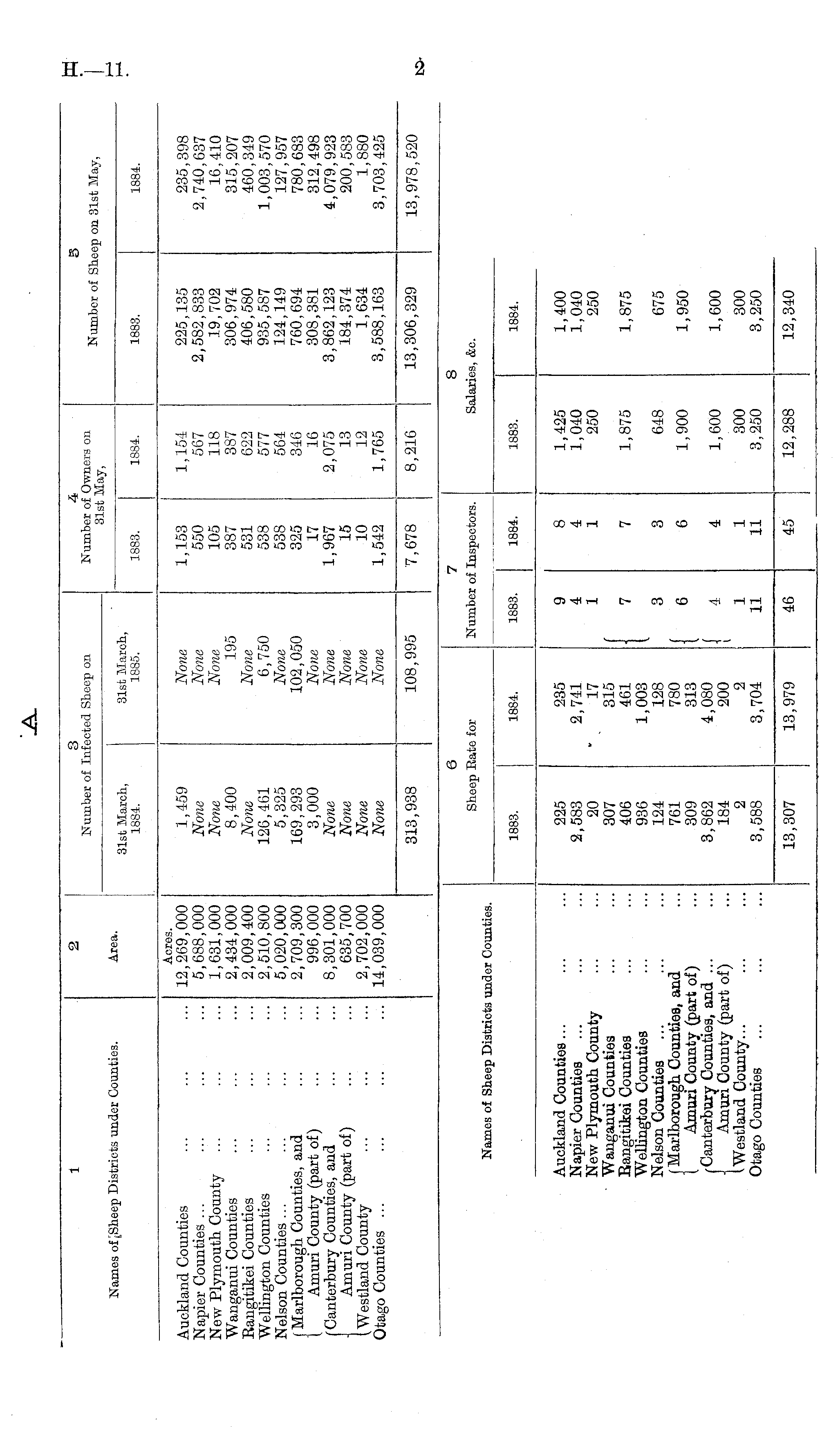 1 2 3 Number of Infected Sheep on 4 Number of Owners on 31st May, S Number of Sheep on 31st May, Names of Districts under Counties. Area. 31st March, 1884. 31st March, 1885. 1883. 1884. 1883. 1884. Auckland Counties Napier Counties ... New Plymouth County Wanganui Counties Eangitikei Counties Wellington Counties Nelson Counties ... ... Marlborough Counties, and Amuri County (part of) Canterbury Counties, and Amuri County (part of) .Westland County Otago Counties ... Acres. 12,269,000 5,688,000 1,631,000 2,434,000 2,009,400 2,510,800 5,020,000 2,709,300 996,000 8,301,000 635,700 2,702,000 14,039,000 1,459 None None 8,400 None 126,461 5,325 169,293 3,000 None None None None None None None 195 None 6,750 None 102,050 None None None None None 1,153 550 105 387 531 538 538 325 17 1,967 15 10 1,542 1,154 567 118 387 622 577 564 346 16 2,075 13 12 1,765 225,135 2,582,833 19,702 306,974 406,580 935,587 124,149 760,694 308,381 3,862,123 184,374 1,634 3,588,163 235,398 2,740,637 16,410 315,207 460,349 1,003,570 127,957 780,683 312,498 4,079,923 200,583 1,880 3,703,425 313,938 108,995 7,678 8,216 13,306,329 13,978,520 6 7 8 Sheep Bate for Number of Inspectors. Salaries, &c. Names of Sheep Districts under Counties. 1883. 1884. 1883. 1884. 1883. 1884. Auckland Counties... Napier Counties New Plymouth County Wanganui Counties Bangitikei Counties Wellington Counties Nelson Counties (Maryborough Counties, and I Amuri County (part of) (■Canterbury Counties, and ... Amuri County (part of) (Westland County... Otago Counties 225 2,583 20 307 406 936 124 761 309 3,862 184 2 3,588 235 2,741 17 315 461 1,003 128 780 313 4,080 200 2 3,704 { 9 4 1 7 3 8 4 1 7 3 1,425 1,040 250 1,875 648 1,400 1,040 250 1,875 675 { { 6 4 6 4 1,900 1,950 1,600 1,600 1 11 1 11 300 3,250 300 3,250 13,307 13,979 46 45 12,288 12,340