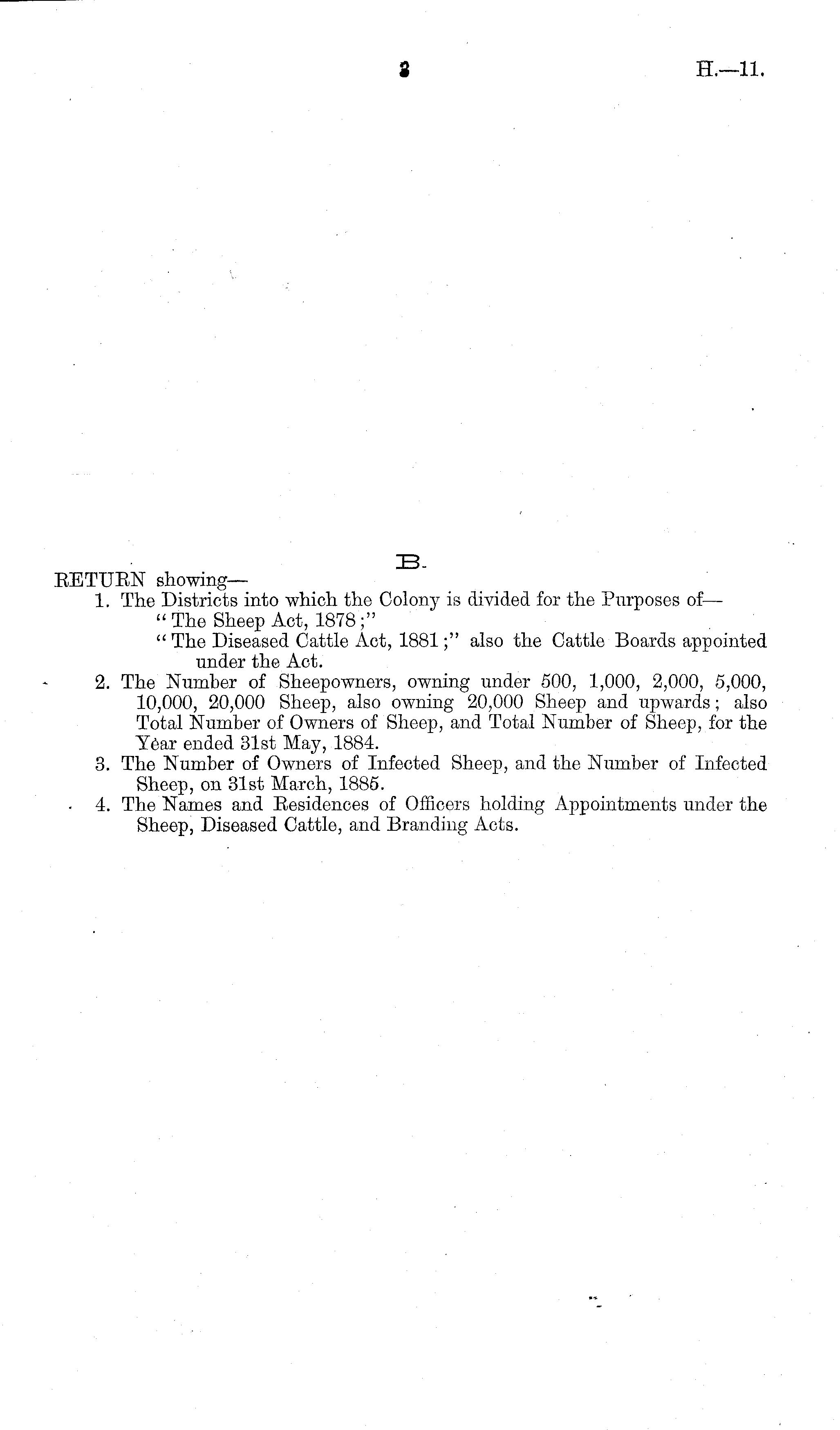 T3. BETUBN showing— 1. The Districts into which the Colony is divided for the Purposes of— "The Sheep Act, 1878;" " The Diseased Cattle Act, 1881;" also the Cattle Boards appointed under the Act. 2. The Number of Sheepowners, owning under 500, 1,000, 2,000, 5,000, 10,000, 20,000 Sheep, also owning 20,000 Sheep and upwards; also Total Number of Owners of Sheep, and Total Number of Sheep, for the Y6ar ended 31st May, 1884. 3. The Number of Owners of Infected Sheep, and the Number of Infected Sheep, on 31st March, 1885. ■ 4. The Names and Besidences of Officers holding Appointments under the Sheep, Diseased Cattle, and Branding Acts.