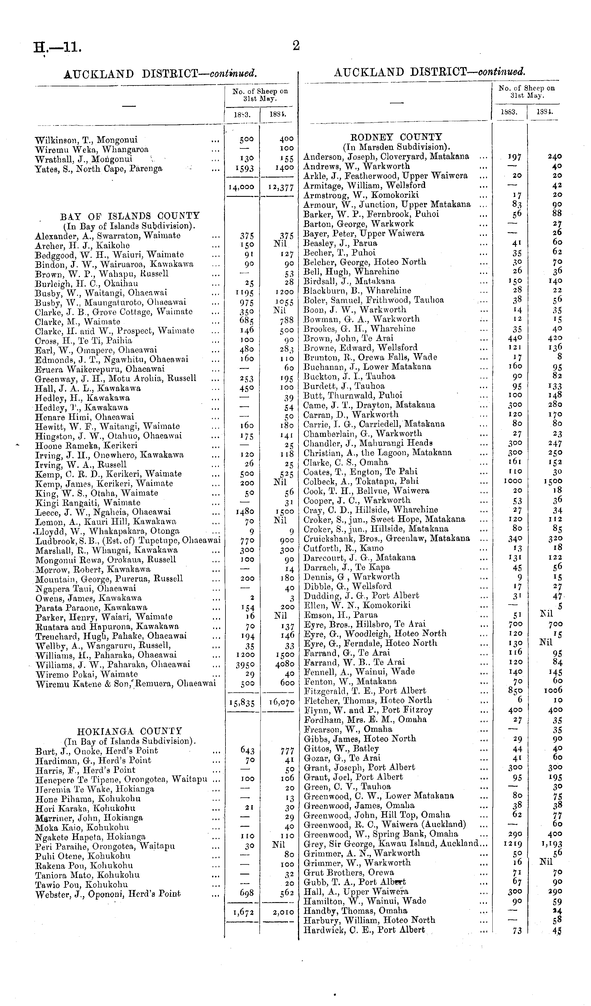 No. of Sheep on 31st May. 1883. 1SS4. RODNEY COUNTY (In Marsden Subdivision). Anderson, Joseph, Cloveryard, Matakana Andrews, W., Warkworth Arkle, J., Featherwood, Upper Waiwera Armitage, William, Wellsford Armstrong, VV., Komokoriki Armour, W., Junction, Upper Matakana ... Barker, W. P., Fernbrook, Puhoi Barton, George, Warkwork Bayer, Peter, Upper Waiwera Beasley, J., Parua Becher, T., Puhoi Belcher, George, Hoteo North Bell, Hugh, Wharehine Birdsall, J., Matakana Blackburn, B., Wharehine Boler, Samuel, Frithwood, Tauboa Boon, J. W., Warkworth Bowman, G. A., Warkworth Brookes, G. II., Wharehine Brown, John, Te Arai Browne, Edward, Wellsford Brunton, R., Orewa Falls, Wade Buchanan, J., Lower Matakana Buck ton, J. I., Tauboa Burdett, J., Tauboa Butt, Tliurnwald, Puhoi Came, J. T., Drayton, Matakana Carran, D., Warkworth Carrie, I. G., Carriedell, Matakana Chamberlain, G., Warkworth Chandler, J., Mahurangi Heads Christian, A., the Lagoon, Matakana Clarke, C. S., Omaha Coates, T., Engton, Te Pahi Colbeck, A., Tokatapu, Pahi Cook, T. II., Bellvue, Waiwera Cooper, J. C., Warkworth Cray, C. D., Hillside, Wharehine Croker, S., jun., Sweet Hope, Matakana Croker, S., jun., Hillside, Matakana Cruickshank, Bros., Greenlaw, Matakana ... Cutforth, R., Kamo Darecourt, J. G., Matakana Darrach, J., To Kapa Dennis, G , Warkworth Dibble, G., Wellsford Dudding, J. G., Port Albert Ellen, W. N., Komokoriki Emson, II., Parua Eyre, Bros., Hillsbro, Te Arai Eyre, G., Woodleigb, Hoteo North Eyre, G., Fcrndale, Hoteo North Farrand, Of., Te Arai Farrand, W. B.. Te Arai Fennell, A., Wainui, Wade Fenton, W., Matakana Fitzgerald, T. E., Port Albert Fletcher, Thomas, Hoteo North Flynn, W. and P., Port Filzroy Fordham, Mrs. E. M., Omaha Fi'earson, W., Omaha Gibbs, James, Hoteo North Gittos, W., Batley Gozar, G., Te Arai Grant, Joseph, Port Albert Grant, Joel, Port Albert Green, C. V, Tauboa Greenwood, C. W., Lower Matakana Greenwood, James, Omaha Greenwood, John, Hill Top, Omaha Greenwood, R. C, Waiwera (Auckland) Greenwood, W., Spring Bank, Omaha Grey, Sir George, Kawau Island, Auckland... Grimmer, A. N., Warkworth Grimmer, W., Warkworth Grut Brothers, Orewa Gubb, T. A., Port Albert Hall, A., Upper Waiwera Hamilton, W., Wainui, Wade Handby, Thomas, Omaha Harbury, William, Hoteo North Havdwick, C. E., Port Albert 197 20 17 83 56 41 35 3° 26 '5° 28 38 14 12 35 440 121 17 160 90 95 100 300 120 80 27 300 300 161 110 1000 20 53 27 120 80 34° 13 131 45 9 '7 31 240 40 20 42 20 90 88 27 26 60 62 70 36 140 22 56 35 '3 40 420 136 8 95 82 i3S 148 280 170 80 23 247 250 'S 2 3° 1500 18 36 34 112 85 320 18 122 56 15 27 47 5 Si 700 120 130 116 Nil 700 15 Nil 120 140 70 850 6 95 84 145 60 1006 JO 400 27 400 35 35 90 40 60 300 195 30 75 38 77 60 400 i,'93 56 Nil 70 90 290 59 34 58 45 29 44 41 300 95 80 38 62 290 1219 5° 16 7i 67 300 90 73