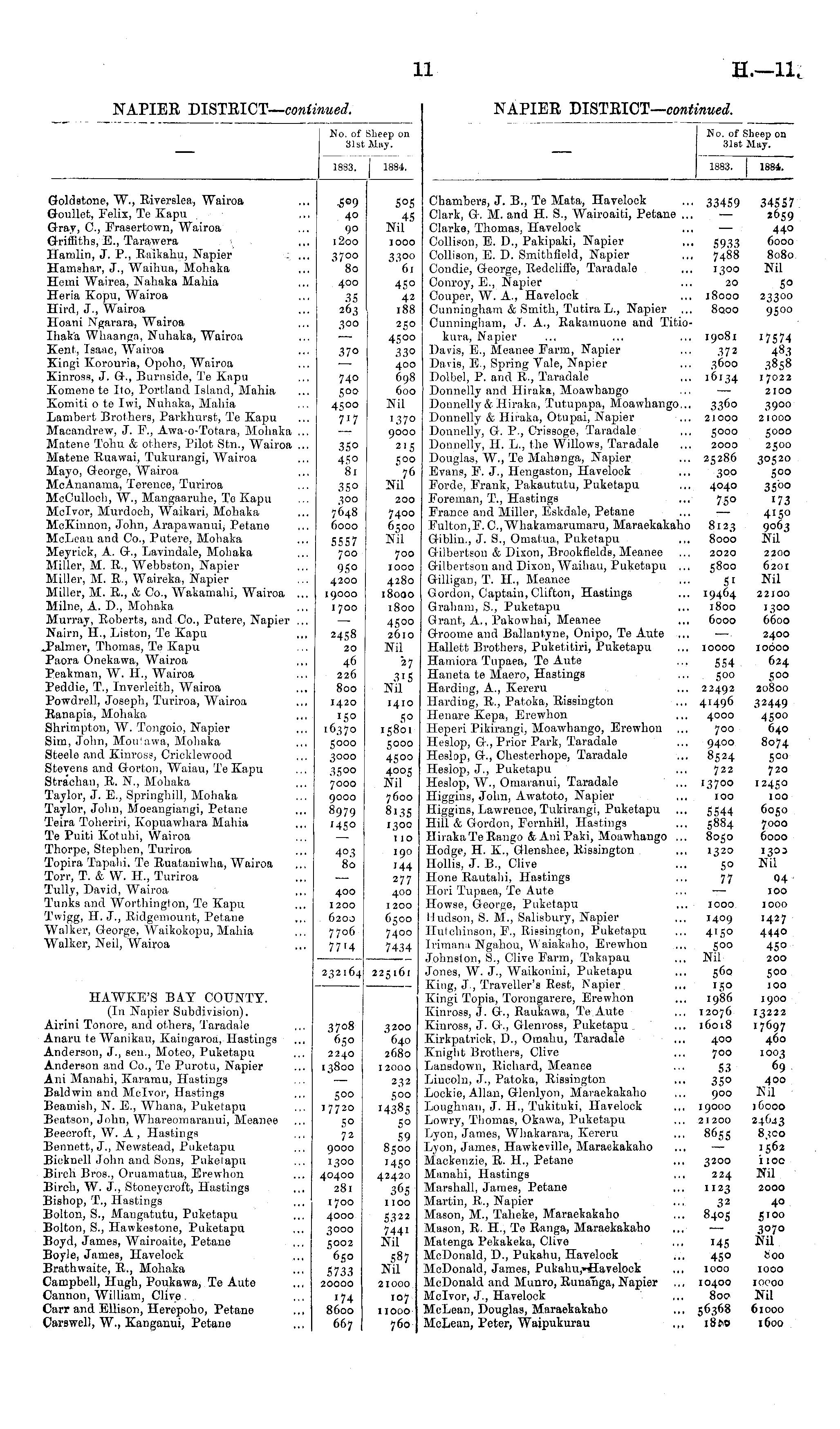 o. of Sheep on 31st May. 1883. 1884. Chambers, J. B., Te Mata, Havelock ... 33459 Clark, G. M. and H. S., Wairoaiti, Petane ... — Clarke, Thomas, Havelock ... — Collision, E. D., Pakipaki, Napier ... 59:53 Collison, E. D. Smithfleld, Napier ... 7488 Condie, George, Redcliffe, Taradale ,,, 1300 Conroy, E., Napier ... 20 Couper, W. A., Havelock ... 18000 Cunningham & Smith, Tutira L., Napier ... 8000 Cunningham, J. A., Rakamuone and Titiokura, Napier ... ... ... 19081 Davis, E., Meanee Farm, Napier ... 372 Davis, E, Spring Vale, Napier ... 3600 Dolbel, P. and R., Taradale ... 16134 Donnelly and Hiraka, Moawhango ... — Donnelly & Hiraka, Tutupapa, Moawbango.., 3360 Donnelly & Hiraka, Otupai, Napier ... 21000 Donnelly, G. P., Crissoge, Taradale ... 5000 Donnelly, II. L., the Willows, Taradale ... 2000 Douglas, W., Te Mahonga, Napier ... 25286 Evans, F. J., Hengaston, Havelock ... 300 Eorde, Frank, Pakaututu, Puketapu ... 4040 Foreman, T., Hastings ... 750 France and Miller, Eskdale, Petane ... — Fulton, F. O.Whakamarumaru, Maraekakaho 8123 Giblin., J. S., Omatua, Puketapu .,. 8000 Gilbertson & Dixon, Brookfields, Meanee ... 2020 Gilbertson and Dixon, Waibau, Puketapu ... 5800 Gilligan, T. IT, Meanee ... 51 Gordon, Captain, Clifton, Hastings ... 19464 Graham, S., Puketapu ... 1800 Grant, A., Pakowhai, Meanee ... 6000 Groome and Ballantyne, Onipo, Te Aute ... ■— Hallett Brothers, Puketitiri, Puketapu ... 10000 Hamiora Tupaea, Te Aute ... 554 Haneta te Maero, Hastings ... 500 Harding, A., Kereru ... 22492 Harding, R., Patoka, Rissington ... 41496 Henare Kepa, Erewhon ... 4000 Heperi Pikirangi, Moawhango, Erewhon ... 700 Heslop, G., Prior Park, Taradale ... 9400 Heslop, G., Chosterhope, Taradale ... 8524 Heslop, J., Puketapu ... 722 Heslop, W., Omaranui, Taradale ... 13700 Higgins, John, Awatoto, Napier ... 100 Higgins, Lawrence, Tukirangi, Puketapu ... 5S44 Hill & Gordon, Fcrnhiil, Hastings ... 5884 IIirakaTeRango &AniPaki, Moawhango ... 8050 Hodge, H. K., Glenshee, Rissington ... 1320 Hollis, J. B., Clive ... 50 Hone Rautalii, Hastings ... 77 Hori Tupaea, Te Aute ... — Howse, George, Puketapu ... 1000 Hudson, S. M., Salisbury, Napier ... 1409 Hutchinson, F., Rissington, Puketapu ... 4150 Irimana Ngahou, Waiakaho, Erewhon ... 500 Johnston, §., Clive Farm, Takapau ... Nil Jones, W. J., Waikouini, Puketapu ... 560 King, J, Traveller's Rest, Kapier ... 150 Kingi Topia, Torongarere, Erewhon ... 1986 Kinross, J. G., Raukawa, Te Aute ... 12076 Kinross, J. G., Glenross, Puketapu ... 16018 Kirkpatrick, D., Omahu, Taradale .., 400 Knight Brothers, Clive ... 700 Lansdown, Richard, Meanee ... 53 Lincoln, J., Patoka, Rissington ... 350 Lockie, Allan, Glenlyon, Maraekakaho ... 900 Loughnan, J. II., Tukituki, Havelock ... 19000 Lowry, Thomas, Okawa, Puketapu ... 21200 Lyon, James, Whakarara, Kereru ... 8655 Lyon, James, Hawkeville, Maraekakaho ... — Mackenzie, R. II., Petane ... 3200 Manahi, Hastings ... 224 Marshall, James, Petane ... 1123 Martin, R., Napier ... 32 Mason, M., Tabeke, Maraekakaho ... 8405 Mason, R. IT, Te Ranga, Maraekakaho ... —■ Matenga Pekakeka, Clive ... 145 McDonald, D., Pukahu, Havelock ... 450 McDonald, James, Pukahu,-Havelock ... 1000 McDonald and Munro, Runahga, Napier .,, 10400 Mclvor, J., Havelock ... 800 McLean, Douglas, Maraekakaho ... 56368 McLean, Peter, Waipukurau .., i8*« 34557 2659 440 6000 8080 Nil 50 23300 9500 '7574 483 3858 17022 2100 3900 21000 5000 2500 30520 500 3500 '73 4150 9063 Nil 2200 6201 Nil 22100 1300 6600 2400 10000 624 5°o 20800 32449 4500 640 8074 500 720 12450 100 6050 7000 6000 1305 Nil 94 100 IOOO 1427 4440 450 200 500 100 1900 13222 17697 460 1003 69 400 Nil 16000 24643 83CO 1562 I IOO Nil 2000 40 5100 3070 Nil too IOOO 10000 Nil 61000 1600