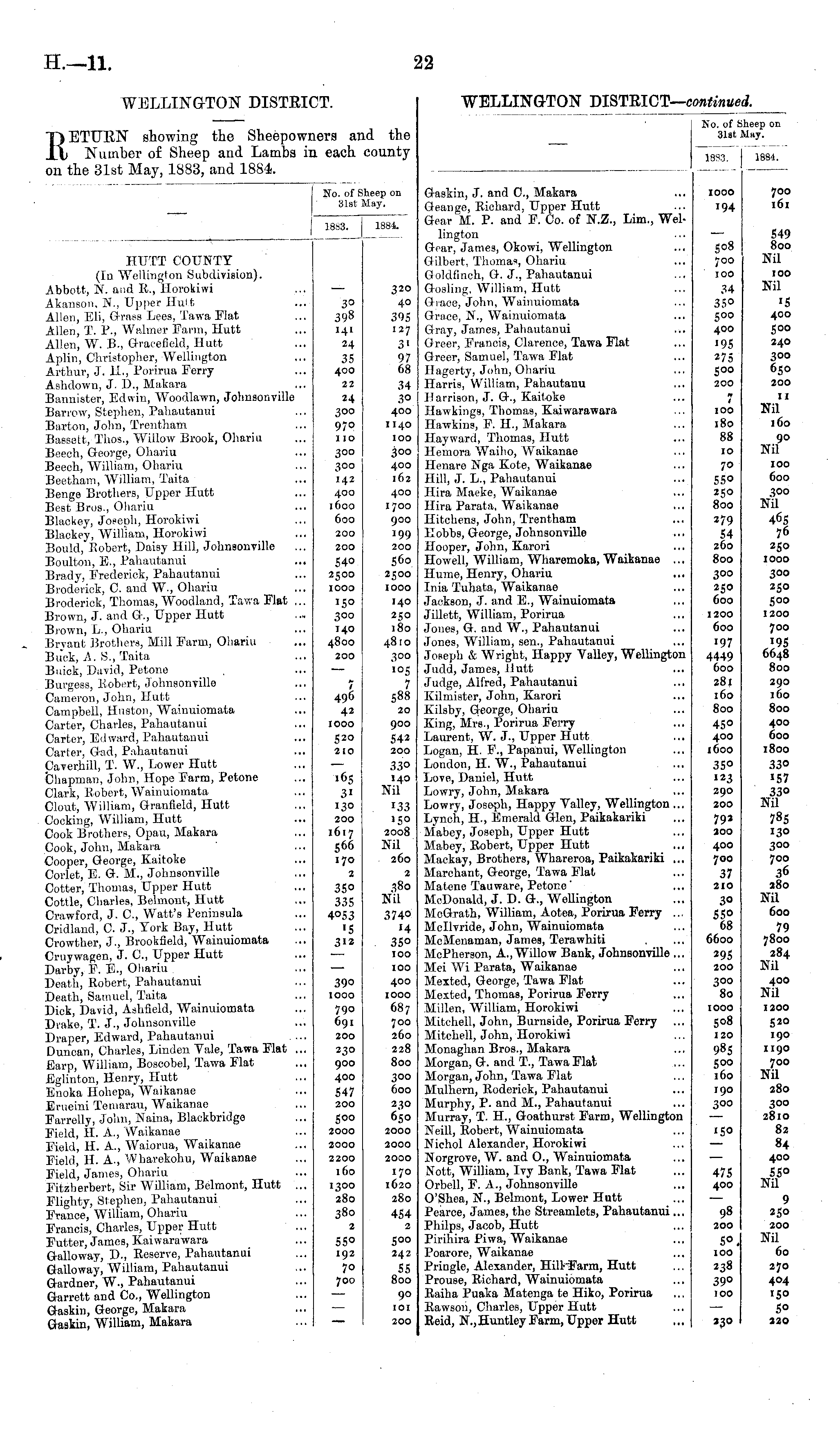 pETUEN showing the Sheepowners a: Lt Number of Sheep and Lambs in each m the 31st May, 1883, and 1884. id the county No. of SI 31st 1 heep on Hay. 18S3. 1884. _ , HUTT COUNTY (In Wellington Subdivision). Abbott, N. and R., Horokiwi Akanson, N., Upper Hult Allen, Eli, Grass Lees, Tawa Flat Allen, T. P., Walmer Farm, Hutt Allen, W. B., Graeefield, Hutt Aplin, Christopher, Wellington Arthur, J. H., Porirua Ferry Ashdown, J. D., Makara BanniBter, Edwin, Woodlawn, Jobnaonville Barrow, Stephen, Pabautanui Barton, John, Trentham Bassett, Thos., Willow Brook, Ohariu Beech, George, Ohariu Beech, William, Ohariu Beetham, William, Taita Benge Brothers, Upper Hutt Best Bros., Ohariu Blackey, Joseph, Horokiwi Blackey, William, Horokiwi Bould, Robert, Daisy Hill, Johnsonville Boulton, E., Pahautanui Brady, Frederick, Pahautanui Broderick, C. and W., Ohariu Broderick, Thomas, Woodland, Tawa Flat ... Brown, J. and G., Upper Hutt Brown, L., Ohariu Brvant Brothers, Mill Farm, Ohariu Buck, A. S., Taita Buick, David, Petone Burgess, Robert, Johnsonville Cameron, John, Hutt Campbell, Huston, Wainuiomata Carter, Charles, Pahautanui Carter, Edward, Pahautanui Carter, Gad, Pahautanui Caverhill, T. W., Lower Hutt Chapman, John, Hope Farm, Petone Clark, Robert, Wainuiomata Clout, William, Granfield, Hutt Cocking, William, Hutt Cook Brothers, Opau, Makara Cook, John, Makara Cooper, George, Kaitoke Corlet, E. G. M., Johnsonville Cotter, Thomas, Upper Hutt Cottle, Charles, Belmont, Hutt Crawford, J. C, Watt's Peninsula Cridland, C. J., York Bay, Hutt Crowther, J., Brookfield, Wainuiomata Cruywagen, J. C, Upper Hutt Darby, F. E., Ohariu , Death, Robert, Pahautanui Death, Samuel, Taita Dick, David, Ashfield, Wainuiomata Drake, T. J., Johnsonville Draper, Edward, Pahautanui Duncan, Charles, Linden Vale, Tawa Flat ... Earp, William, Boscobel, Tawa Flat Eglinton, Henry, Hutt Enoka Hohepa, Waikanae Erueini Teniarau, Waikanae Farrelly, John, Naina, Blackbridge Field, H. A., Waikanae Field, H. A., Waiorua, Waikanae Field, H. A., Wharekohu, Waikanae Field, James, Ohariu Fitzberbert, Sir William, Belmont, Hutt ... Flighty, Stephen, Pabautanui France, William, Ohariu Francis, Charles, Upper Hutt Futter, James, Kaiwarawara Galloway, D., Reserve, Pahautanui Galloway, William, Pahautanui Gardner, W., Pahautanui Garrett and Co., Wellington Gaskin, George, Makara Gaskin, William, Makara 3° 398 141 24 35 400 22 24 300 97° no 300 300 142 400 1600 600 200 200 54° 2500 IOOO 15° 300 140 4800 200 496 42 IOOO 52° 210 165 31 13° 200 1617 566 170 2 35° 335 4°53 '5 312 320 40 395 127 3' 97 68 34 30 400 1140 100 300 400 162 400 1700 900 199 200 560 2500 IOOO 140 250 180 4810 300 105 7 588 20 900 542 200 330 140 Nil 133 15° 2008 Nil 260 2 380 Nil 374° 14 35° 100 IOO 39° IOOO 790 691 200 400 IOOO 687 700 260 228 800 23° 900 400 547 200 5°° 2000 300 600 230 650 2000 2000 2000 2200 160 2000 170 1620 280 454 2 1300 280 380 2 55° 192 70 700 5°° 242 55 800 90 101 200