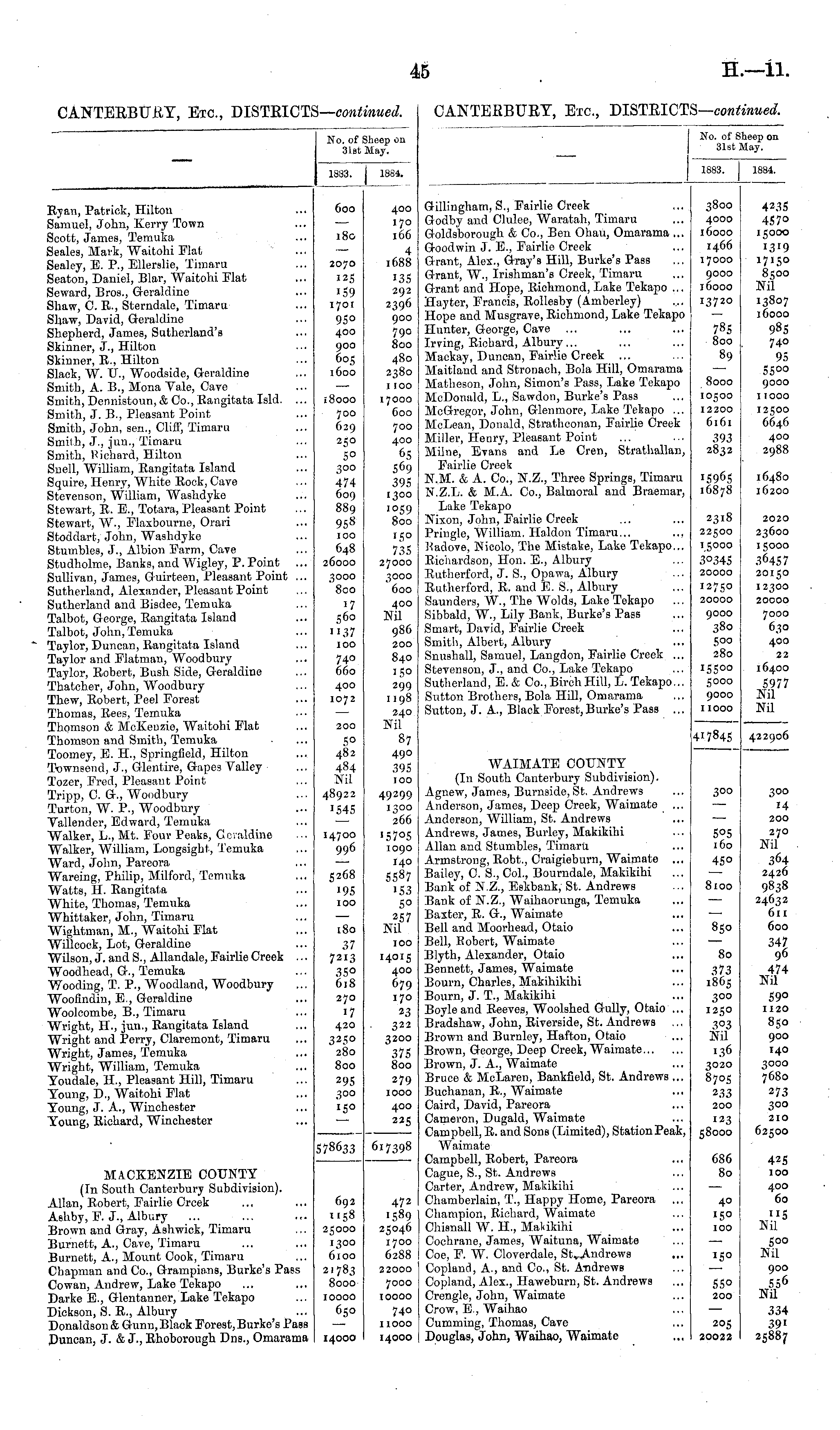 No. of Sheep on 31st May. 1883. I 1884. GuTingham, S., Fairlie Creek Godby and Clulee, Waratah, Timaru Goldsborough & Co., Ben Ohau, Omarama ,.. Goodwin J. E., Fairlie Creek Grant, Alex., Gray's Hill, Burke's Pass Grant, W., Irishman's Creek, Timaru Grant and Hope, Richmond, Lake Tekapo ... Hayter, Francis, Rollesby (Amberley) Hope and Musgrave, Richmond, Lake Tekapo Hunter, George, Cave ... Irving, Richard, Albury... Mackay, Duncan, Fairlie Creek ... Maitland and Stronach, Bola Hill, Omarama Matheson, John, Simon's Pass, Lake Tekapo McDonald, L„ Sawdon, Burke's Pass McGregor, John, Glenmore, Lake Tekapo ... McLean, Donald, Strathconan, Fairlie Creek Miller, Henry, Pleasant Point Milne, Evans and Le Cren, Strathallan, Fairlie Creek N..M. & A. Co., N.Z., Three Springs, Timaru N.Z.L. & M.A. Co., Balmoral and Braemar, Lake Tekapo Nixon, John, Fairlie Creek Pringle, William. Haldon Timaru... Radove, Nicolo, The Mistake, Lake Tekapo... Richardson, Hon. E., Albury Rutherford, J. S., Opawa, Albury Rutherford, R. and E. S., Albury Saunders, W., The Wolds, Lake Tekapo Sibbald, W., Lily Bank, Burke's Pass Smart, David, Fairlie Creek Smith, Albert, Albury Snushall, Samuel, Langdon, Fairlie Creek ... Stevenson, J., and Co., Lake Tekapo Sutherland, E.& Co., Birch Hill, L. Tekapo... Sutton Brothers, Bola Hill, Omarama Sutton, J. A., Black Forest,Burke's Pass ... 38°° 4000 ioooo 1466 17000 9000 16000 13720 785 800 89 8000 10500 12200 6161 393 2832 42.35 457° 15000 1319 17150 8500 Nil 13807 16000 98S 74° 95 55°° 9000 I IOOO 12500 6646 400 2988 1596.5 16878 16480 16200 2318 22500 15000 3°345 20000 12750 20000 9000 380 500 280 I5S00 Sooo 9000 I IOOO 2020 23600 15000 36457 2OI5O 123OO 2000O 7000 6.30 400 22 164OO 5977 Nil Nil WAIMATE COUNTY (In South Canterbury Subdivision). Agnew, James, Burnside, St. Andrews Anderson, James, Deep Creek, Waimate ... Anderson, William, St. Andrews Andrews, James, Burley, Makikihi Allan and Stumbles, Timaru Armstrong, Robt., Craigieburn, Waimate ... Bailey, C. S., Col., Bourndale, Makikihi Bank of N.Z., Eskbank, St. Andrews Bank of N.Z., Waihaorunga, Temuka Baxter, R. G., Waimate Bell and Moorhead, Otaio Bell, Robert, Waimate Blyth, Alexander, Otaio Bennett, James, Waimate Bourn, Charles, Makihikihi Bourn, J. T., Makikihi Boyle and Reeves, Woolshed Gully, Otaio ... Bradshaw, John, Riverside, St. Andrews ... Brown and Burnley, Hafton, Otaio Brown, George, Deep Creek, Waimate Brown, J. A., Waimate Bruce & McLaren, Bankfield, St. Andrews ... Buchanan, R., Waimate Caird, David, Pareora Cameron, Dugald, Waimate Campbell, R. and Sons (Limited), StationPeak, Waimate Campbell, Robert, Pareora Cague, S., St. Andrews Carter, Andrew, Makikihi Chamberlain, T., Happy Home, Pareora ... Champion, Richard, Waimate Chianall W. H, Makikihi Cochrane, James, Waituna, Waimate Coe, F. W. Cloverdale, St. Andrews Copland, A., and Co., St. Andrews Copland, Alex., Haweburn, St. Andrews Crengle, John, Waimate Crow, E, Waihao Cumming, Thomas, Cave Douglas, John, Waihao, Waimate 417845 422906 300 300 '4 505 160 450 8100 850 80 373 1865 300 1250 3°3 Nil .36 3020 87°S 233 200 123 58000 200 270 Nil 364 2426 9838 24632 611 600 347 96 474 Nil 59° 1120 850 900 140 3000 7680 273 300 210 62500 686 80 425 100 40 15° 100 400 60 15° "5 Nil 500 Nil 900 556 Nil 55° 200 205 20022 334 39i 25887