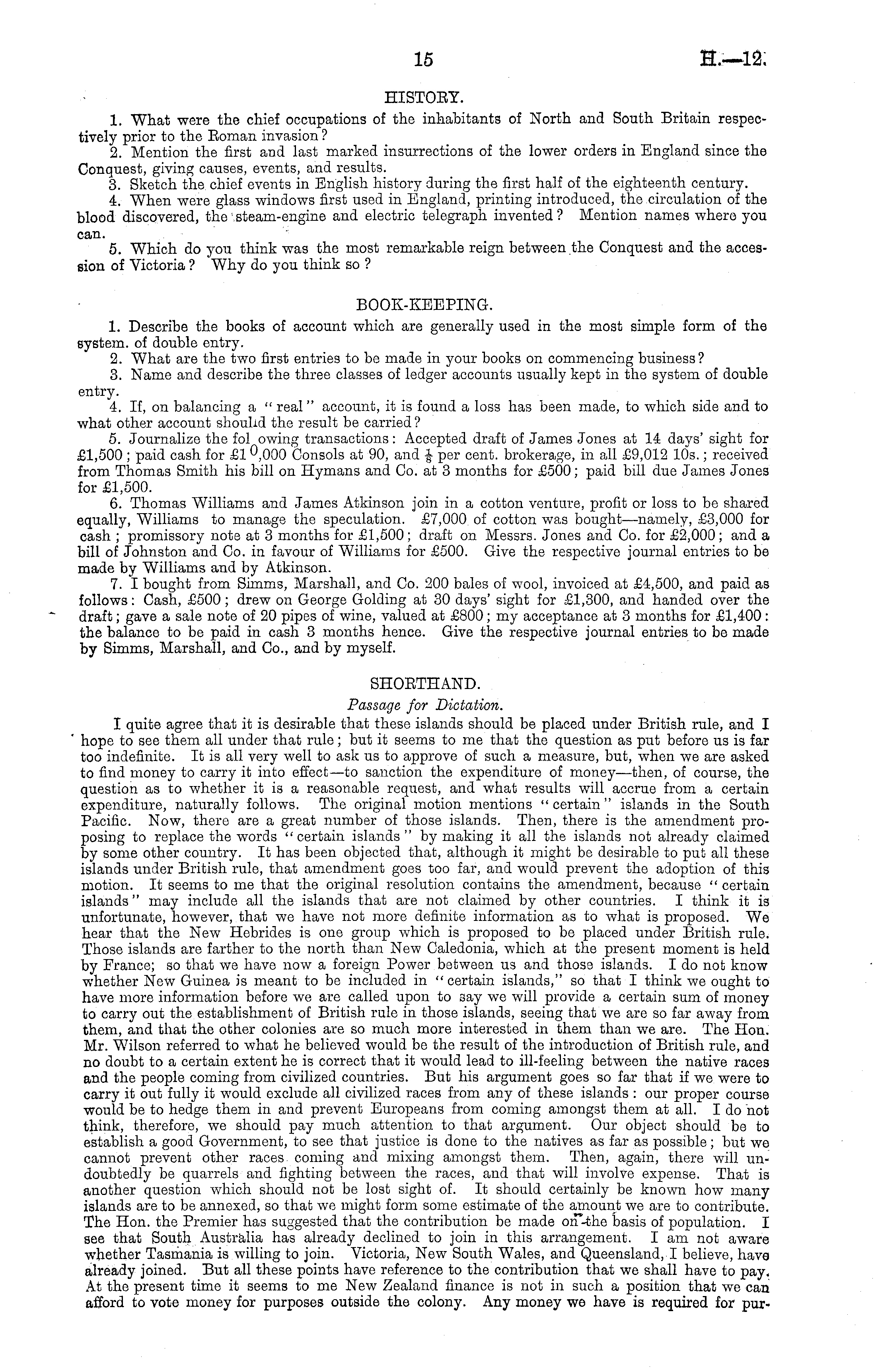 HISTOEY. 1. What were the chief occupations of the inhabitants of North and South Britain respectively prior to the Boman invasion ? 2. Mention the first and last marked insurrections of the lower orders in England since the Conquest, giving causes, events, and results. 3. Sketch the chief events in English history during the first half of the eighteenth century. 4. When were glass windows first used in England, printing introduced, the circulation of the blood discovered, the steam-engine and electric telegraph invented ? Mention names where you can. 5. Which do you think was the most remarkable reign between the Conquest and the accession of Victoria ? Why do you think so ? BOOK-KEEPING. 1. Describe the books of account which are generally used in the most simple form of the system, of double entry. 2. What are the two first entries to be made in your books on commencing business? 3. Name and describe the three classes of ledger accounts usually kept in the system of double entry. 4. If, on balancing a " real" account, it is found a loss has been made, to which side and to what other account shoulid the result be carried ? 5. Journalize the fol owing transactions: Accepted draft of James Jones at 14 days' sight for £1,500 ; paid cash for £10,000 Consols at 90, and -J- per cent, brokerage, in all £9,012 10s.; received from Thomas Smith his bill on Hymans and Co. at 3 months for £500; paid bill due James Jones for £1,500. 6. Thomas Williams and James Atkinson join in a cotton venture, profit or loss to be shared equally, Williams to manage the speculation. £7,000 of cotton was bought—namely, £3,000 for cash ; promissory note at 3 months for £1,500; draft on Messrs. Jones and Co. for £2,000; and a bill of Johnston and Co. in favour of Williams for £500. Give the respective journal entries to be made by Williams and by Atkinson. 7. I bought from Simms, Marshall, and Co. 200 bales of wool, invoiced at £4,500, and paid as follows: Cash, £500; drew on George Golding at 30 days' sight for £1,300, and handed over the draft; gave a sale note of 20 pipes of wine, valued at £800; my acceptance at 3 months for £1,400: the balance to be paid in cash 3 months hence. Give the respective journal entries to be made by Simms, Marshall, and Co., and by myself. SHOETHAND. Passage for Dictation. I quite agree that it is desirable that these islands should be placed under British rule, and I hope to see them all under that rule; but it seems to me that the question as put before us is far too indefinite. It is all very well to ask us to approve of such a measure, but, when we are asked to find money to carry it into effect—to sanction the expenditure of money—then, of course, the question as to whether it is a reasonable request, and what results will accrue from a certain expenditure, naturally follows. The original motion mentions " certain " islands in the South Pacific. Now, there are a great number of those islands. Then, there is the amendment proposing to replace the words " certain islands " by making it all the islands not already claimed by some other country. It has been objected that, although it might be desirable to put all these islands under British rule, that amendment goes too far, and would prevent the adoption of this motion. It seems to me that the original resolution contains the amendment, because " certain islands" may include all the islands that are not claimed by other countries. I think it is unfortunate, however, that we have not more definite information as to what is proposed. We hear that the New Hebrides is one group which is proposed to be placed under British rule. Those islands are farther to the north than New Caledonia, which at the present moment is held by France; so that we have now a foreign Power between us and those islands. Ido not know whether New Guinea is meant to be included in " certain islands," so that I think we ought to have more information before we are called upon to say we will provide a certain sum of money to carry out the establishment of British rule in those islands, seeing that we are so far away from them, and that the other colonies are so much more interested in them than we are. The Hon. Mr. Wilson referred to what he believed would be the result of the introduction of British rule, and no doubt to a certain extent he is correct that it would lead to ill-feeling between the native races and the people coming from civilized countries. But his argument goes so far that if we were to carry it out fully it would exclude all civilized races from any of these islands : our proper course would be to hedge them in and prevent Europeans from coming amongst them at all. Ido not think, therefore, we should pay much attention to that argument. Our object should be to establish a good Government, to see that justice is done to the natives as far as possible; but we cannot prevent other races coming and mixing amongst them. Then, again, there will undoubtedly be quarrels and fighting between the races, and that will involve expense. That is another question which should not be lost sight of. It should certainly be known how many islands are to be annexed, so that we might form some estimate of the amount we are to contribute. The Hon. the Premier has suggested that the contribution be made on the basis of population. I see that South Australia has already declined to join in this arrangement. lam not aware whether Tasmania is willing to join. Victoria, New South Wales, and Queensland, I believe, have already joined. But all these points have reference to the contribution that we shall have to pay. At the present time it seems to me New Zealand finance is not in such a position that we can afford to vote money for purposes outside the colony. Any money we have is required for pur-